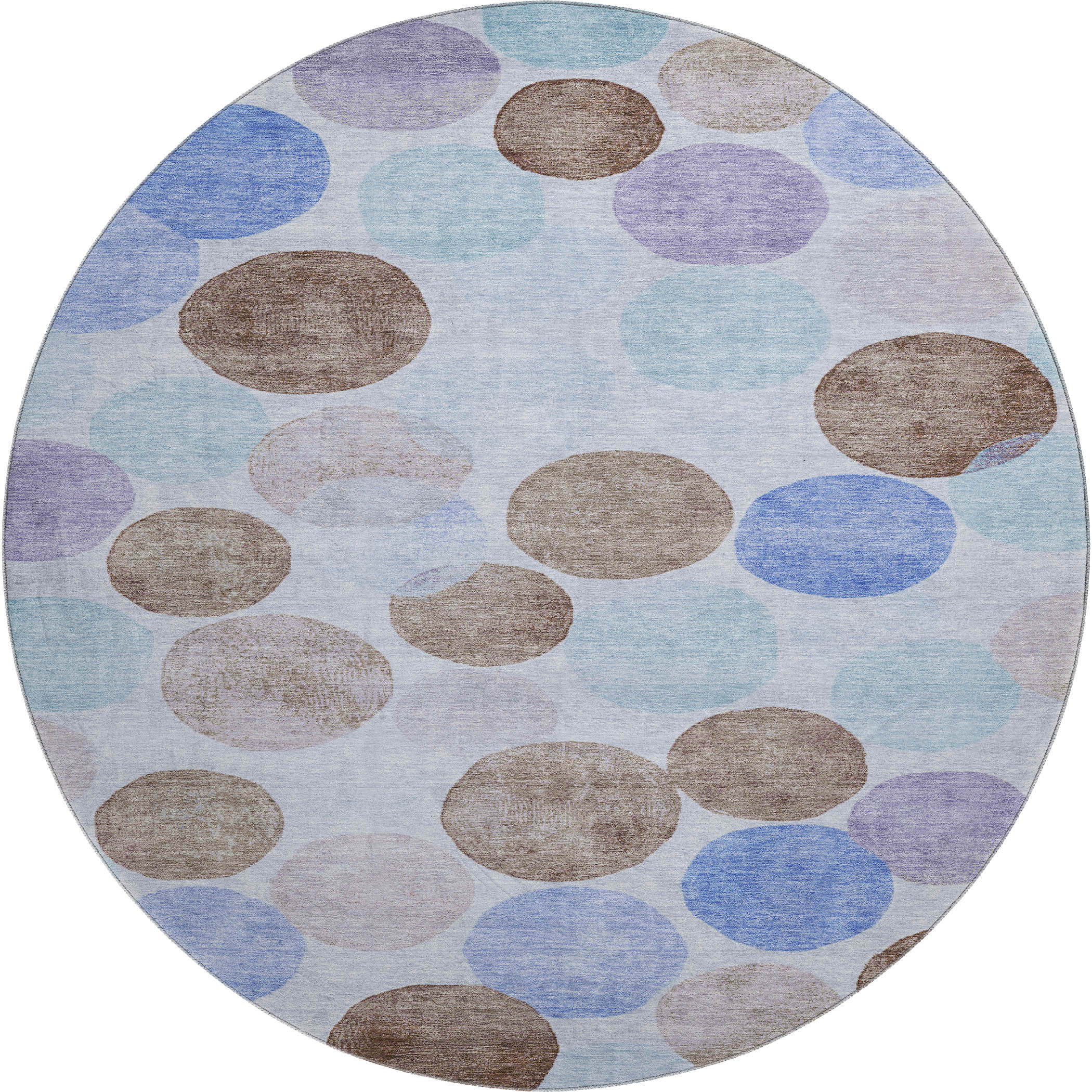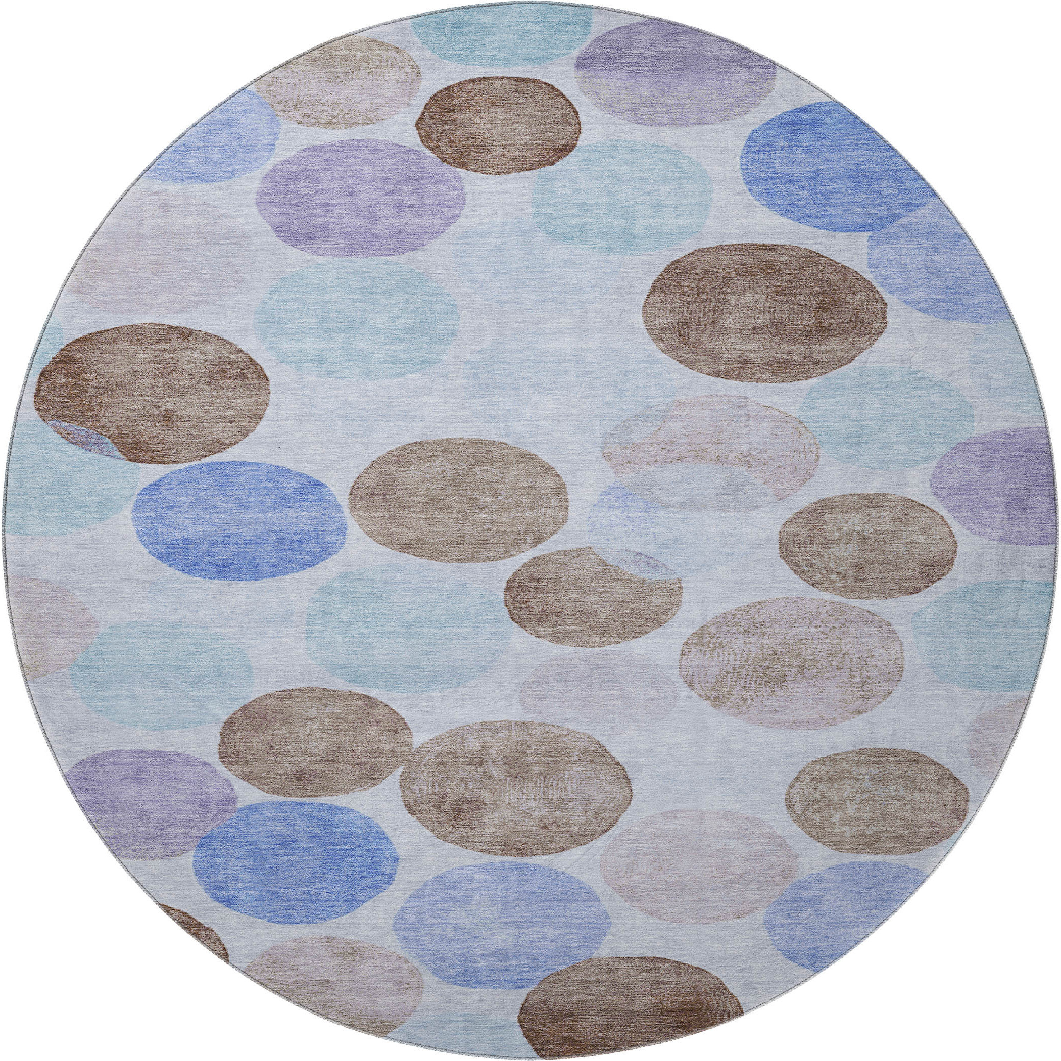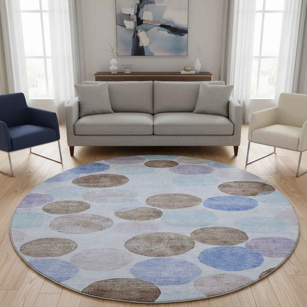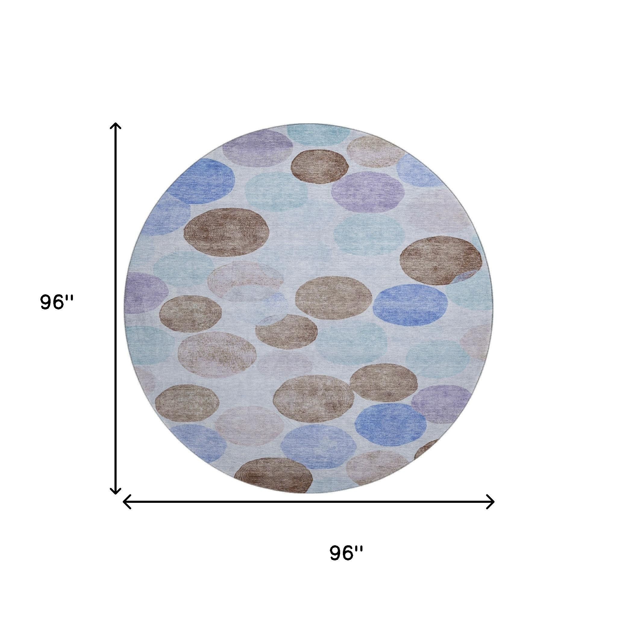 Set an inviting tone in your space with this 8-foot sky blue lavender and taupe geometric washable round rug with uv protection. Ideal for spaces with kids and pets, this rug is stain resistant to help repel dirt and spilled liquids. Built to last, this rug crafted from polyester fibers is known for its durability and long lasting appeal. Rugs are a great way to showcase your style, hide imperfections, warm your home and reduce noise. This larger sized, transitional styled rug is ready to create a focal point or statement piece in your room. 96.00-inch h x 96.00-inch w x 0.39-inch d.