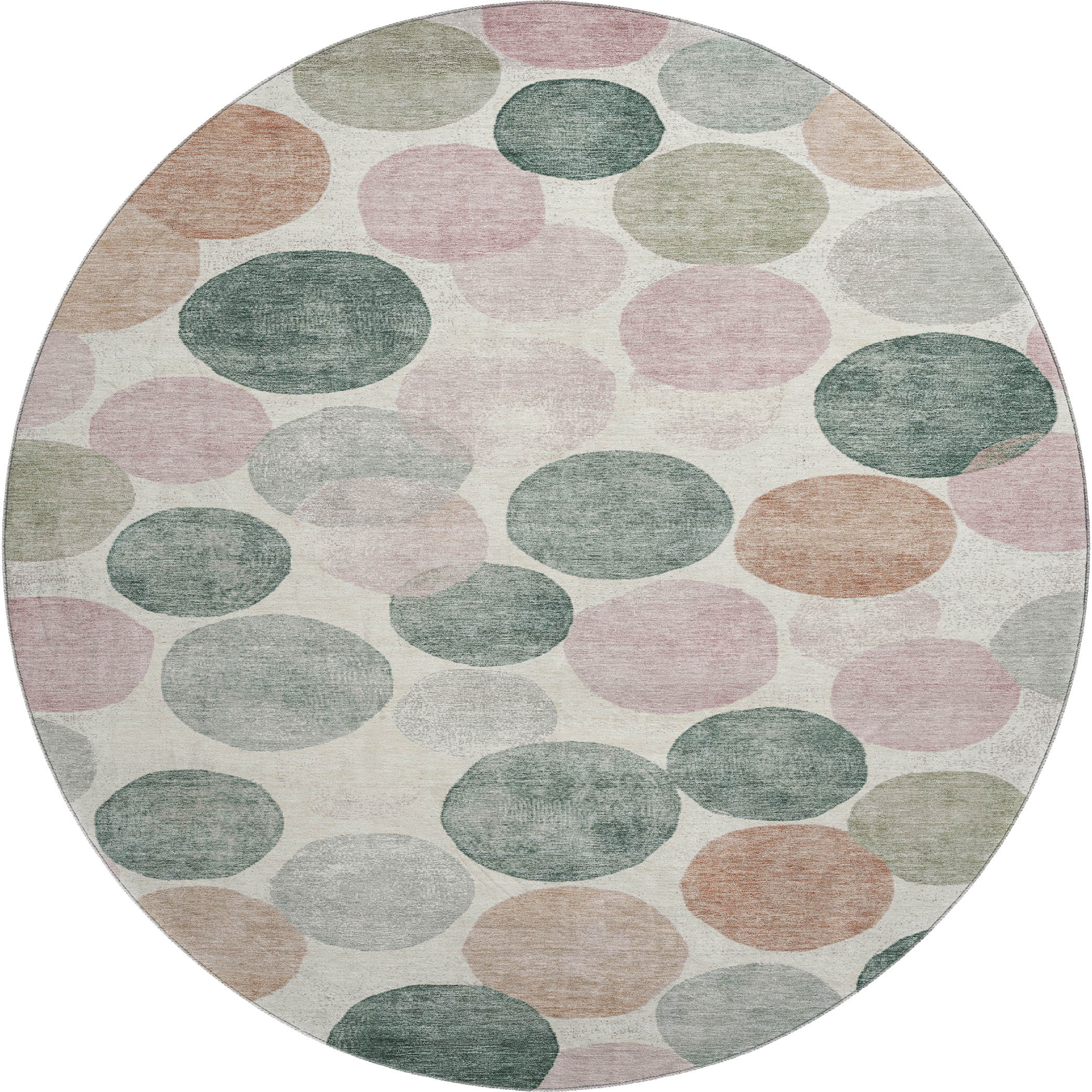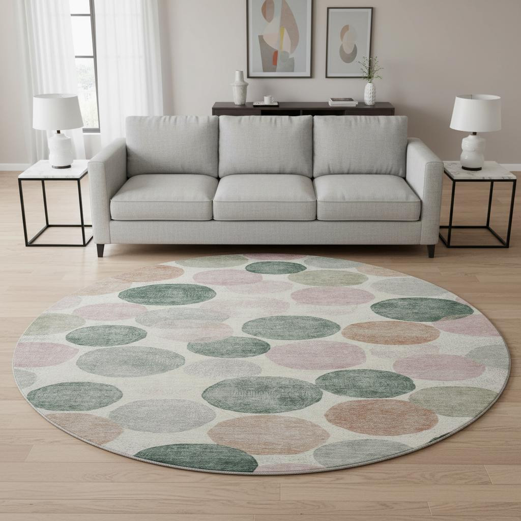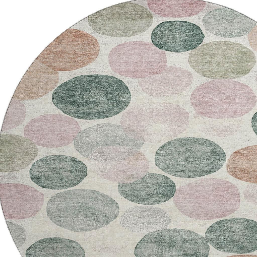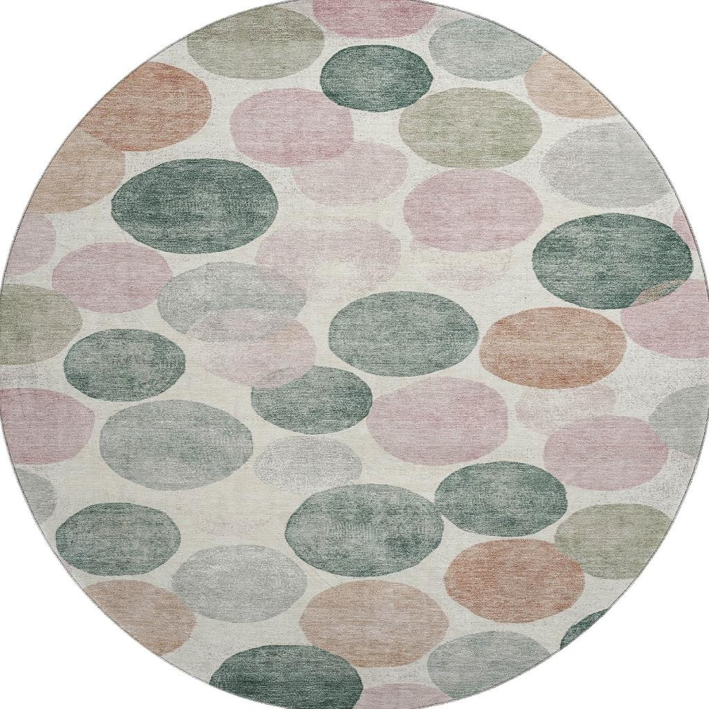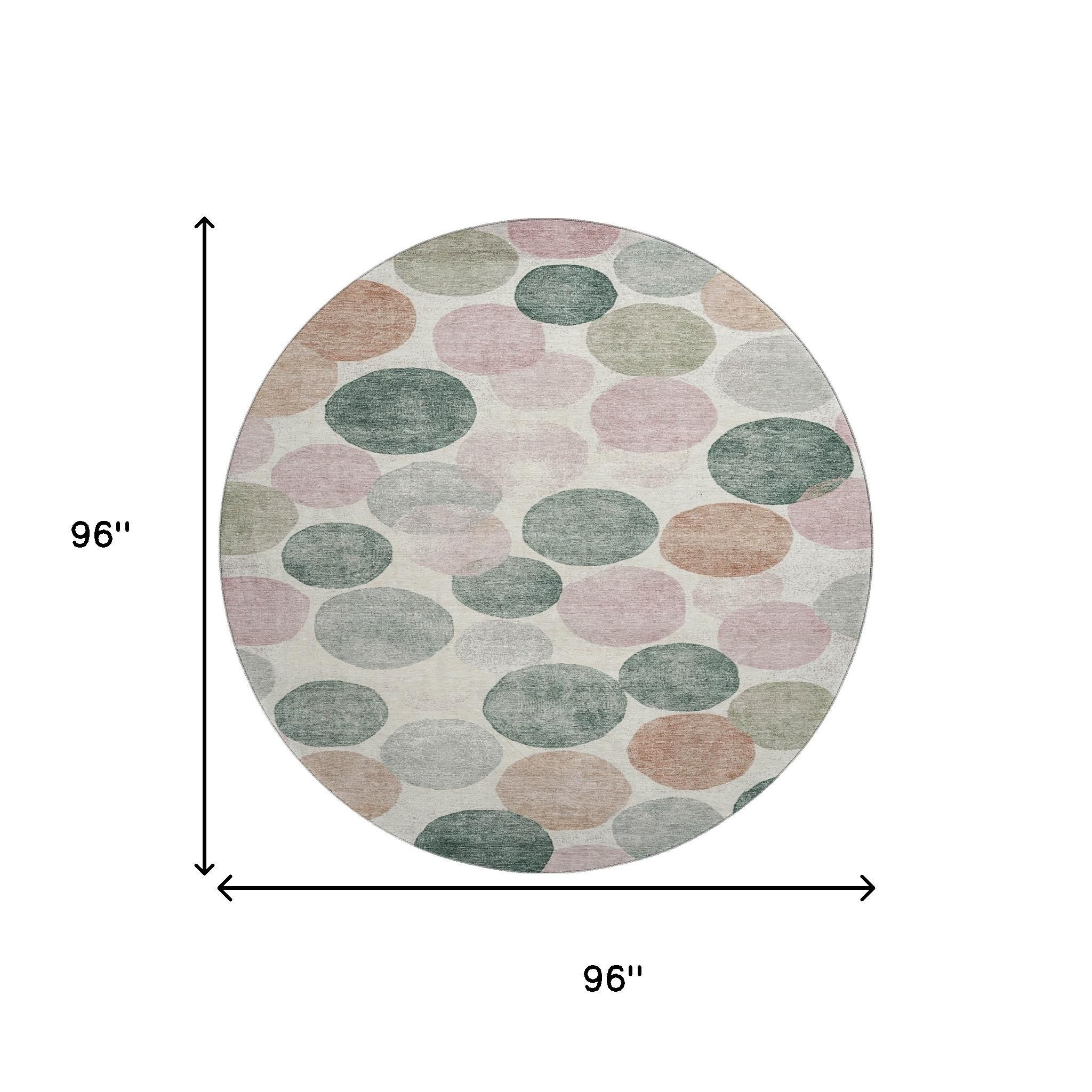 Add great coloration and comfortable texture to your space with this 8-foot salmon emerald and ivory geometric washable round rug with uv protection. Ideal for spaces with kids and pets, this rug is stain resistant to help repel dirt and spilled liquids. Built to last, this rug crafted from polyester fibers is known for its durability and long lasting appeal. Rugs are a great way to showcase your style, hide imperfections, warm your home and reduce noise. This larger sized, transitional styled rug is ready to create a focal point or statement piece in your room. 96.00-inch h x 96.00-inch w x 0.39-inch d.