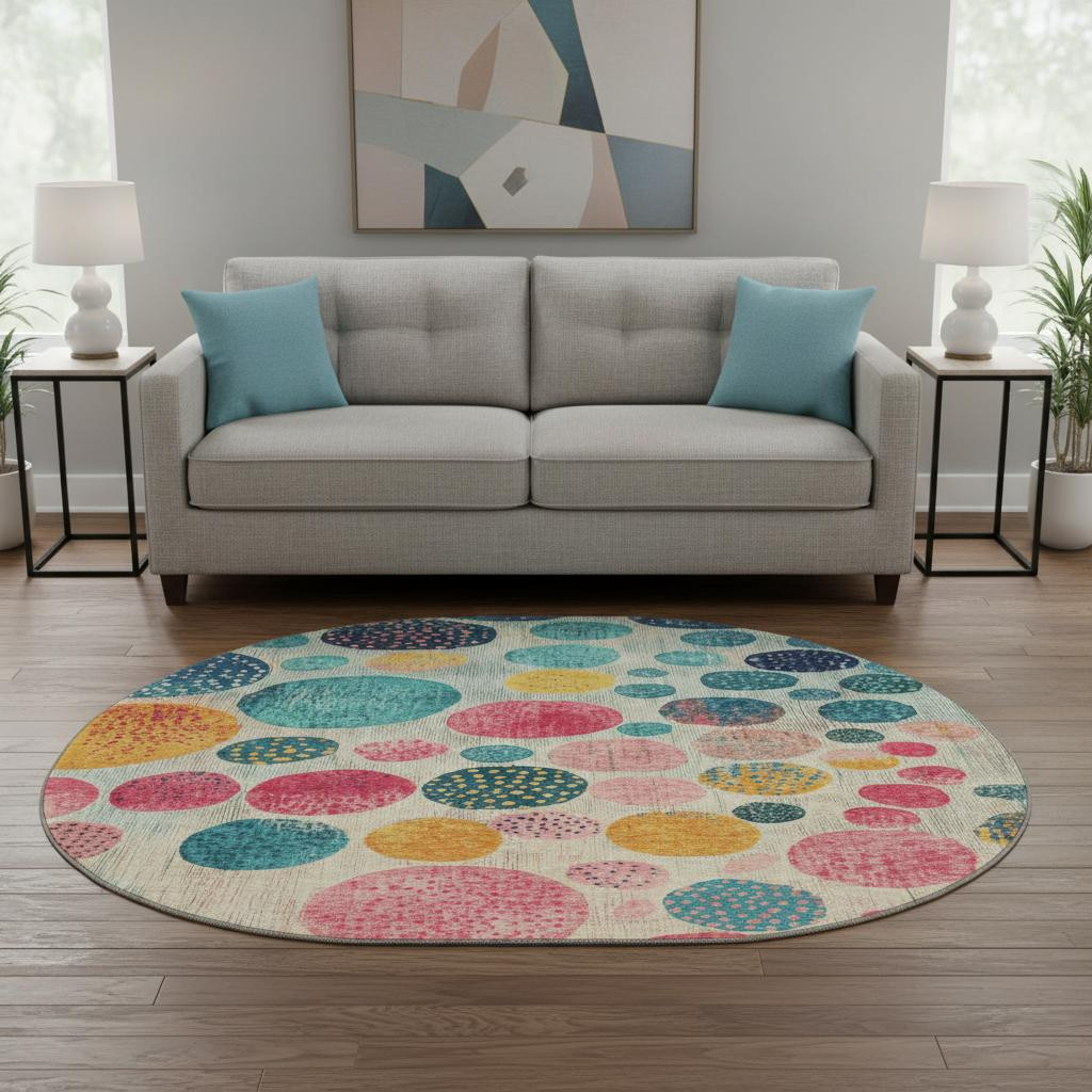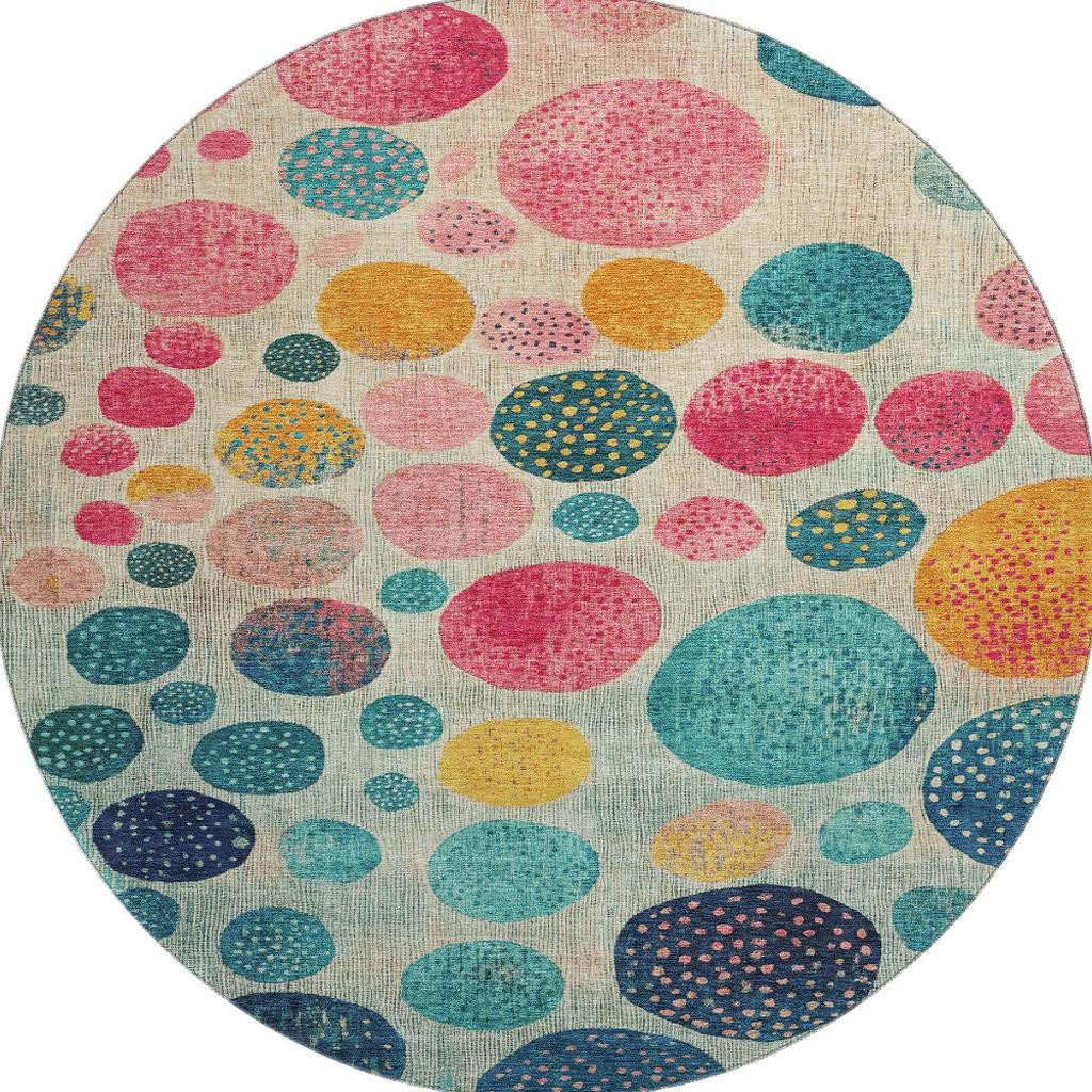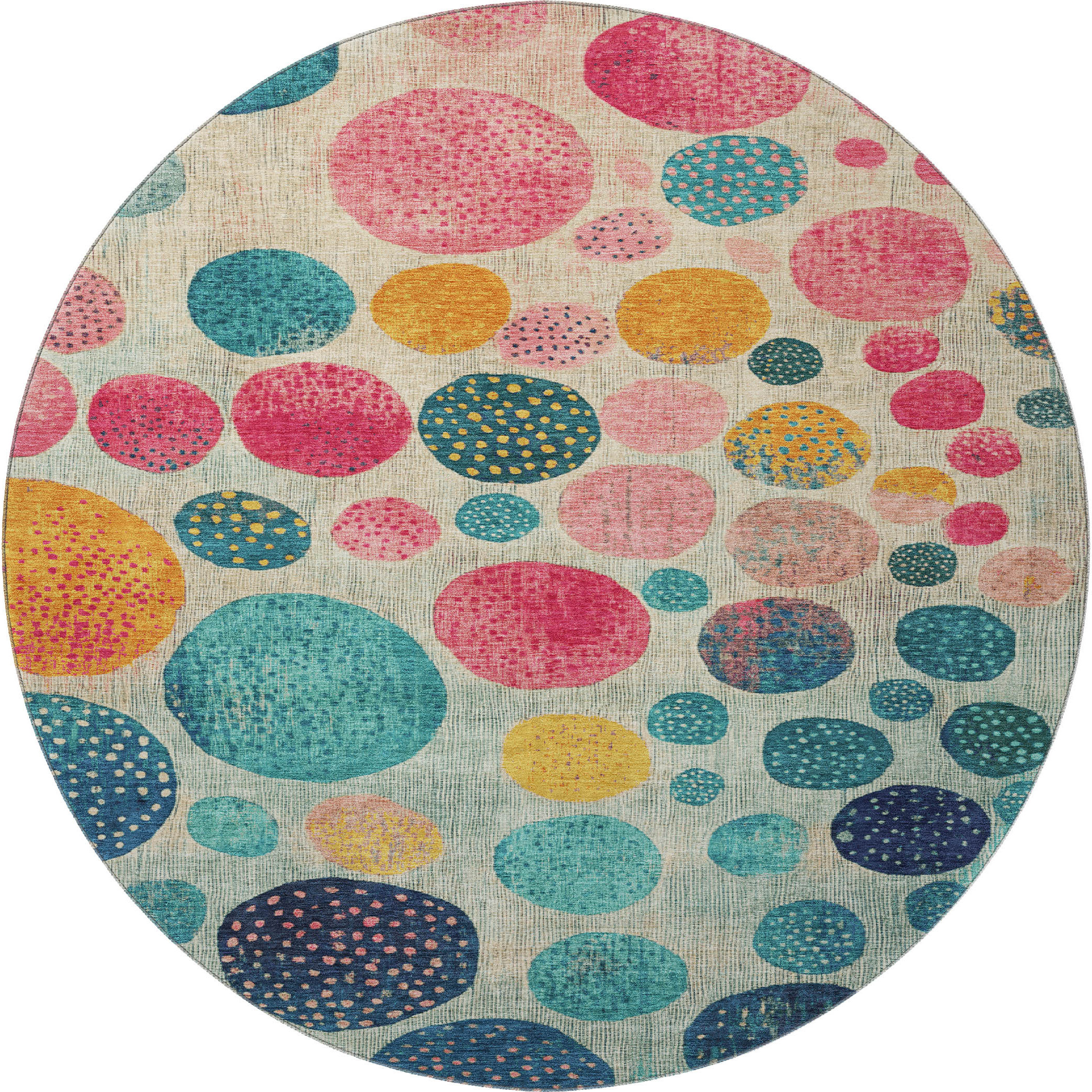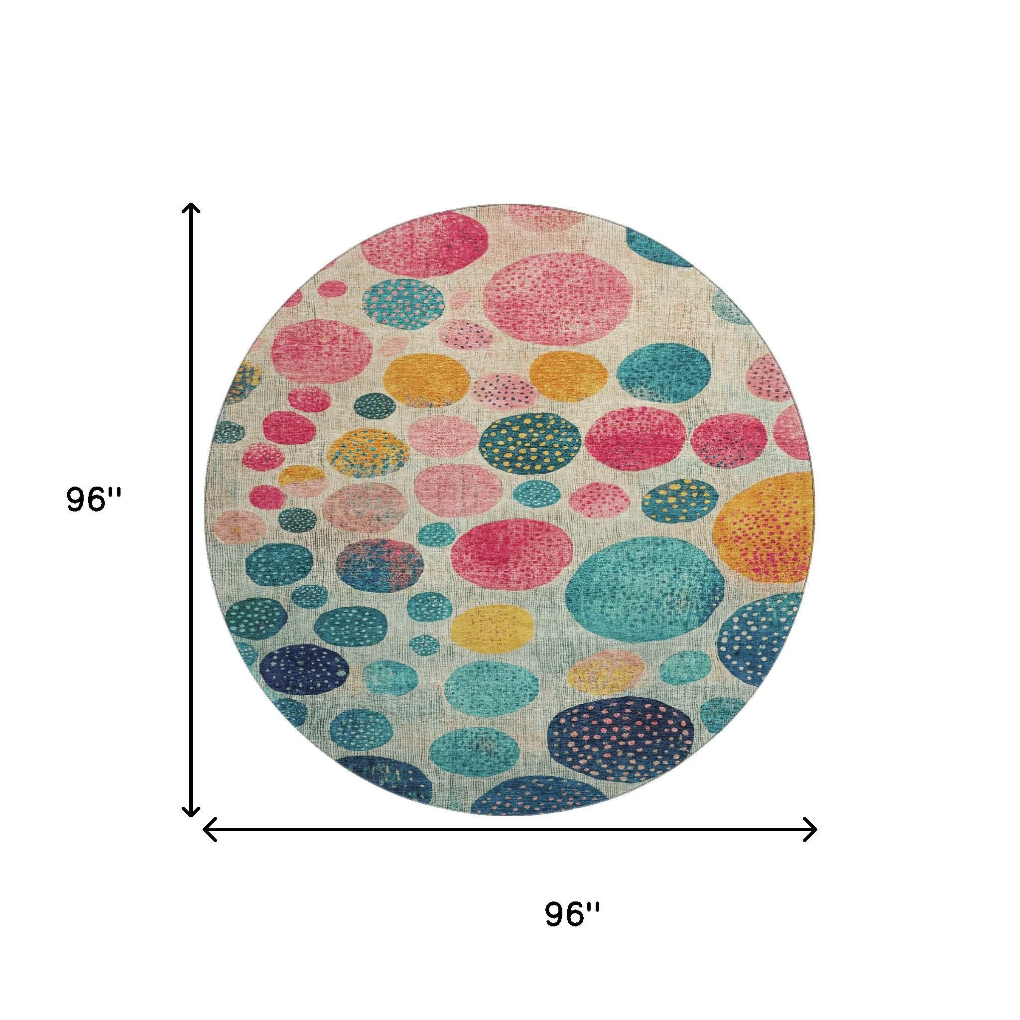 Add great coloration and comfortable texture to your space with this 8-foot teal pink and gold geometric washable round rug with uv protection. Ideal for spaces with kids and pets, this rug is stain resistant to help repel dirt and spilled liquids. Built to last, this rug crafted from polyester fibers is known for its durability and long lasting appeal. Rugs are a great way to showcase your style, hide imperfections, warm your home and reduce noise. This larger sized, transitional styled rug is ready to create a focal point or statement piece in your room. 96.00-inch h x 96.00-inch w x 0.39-inch d.