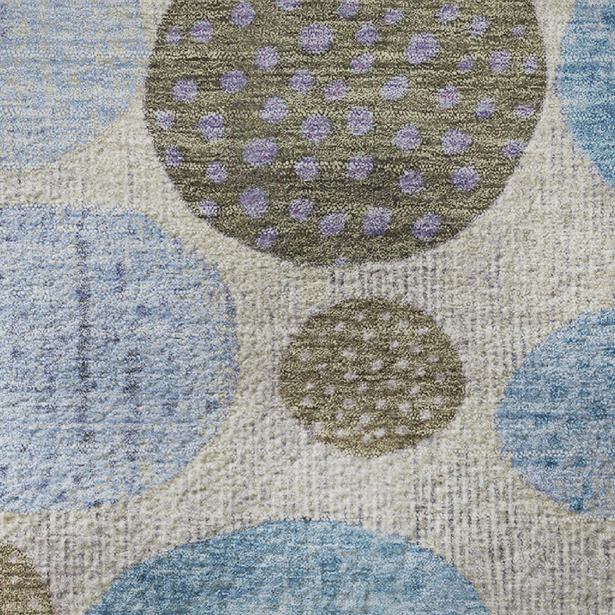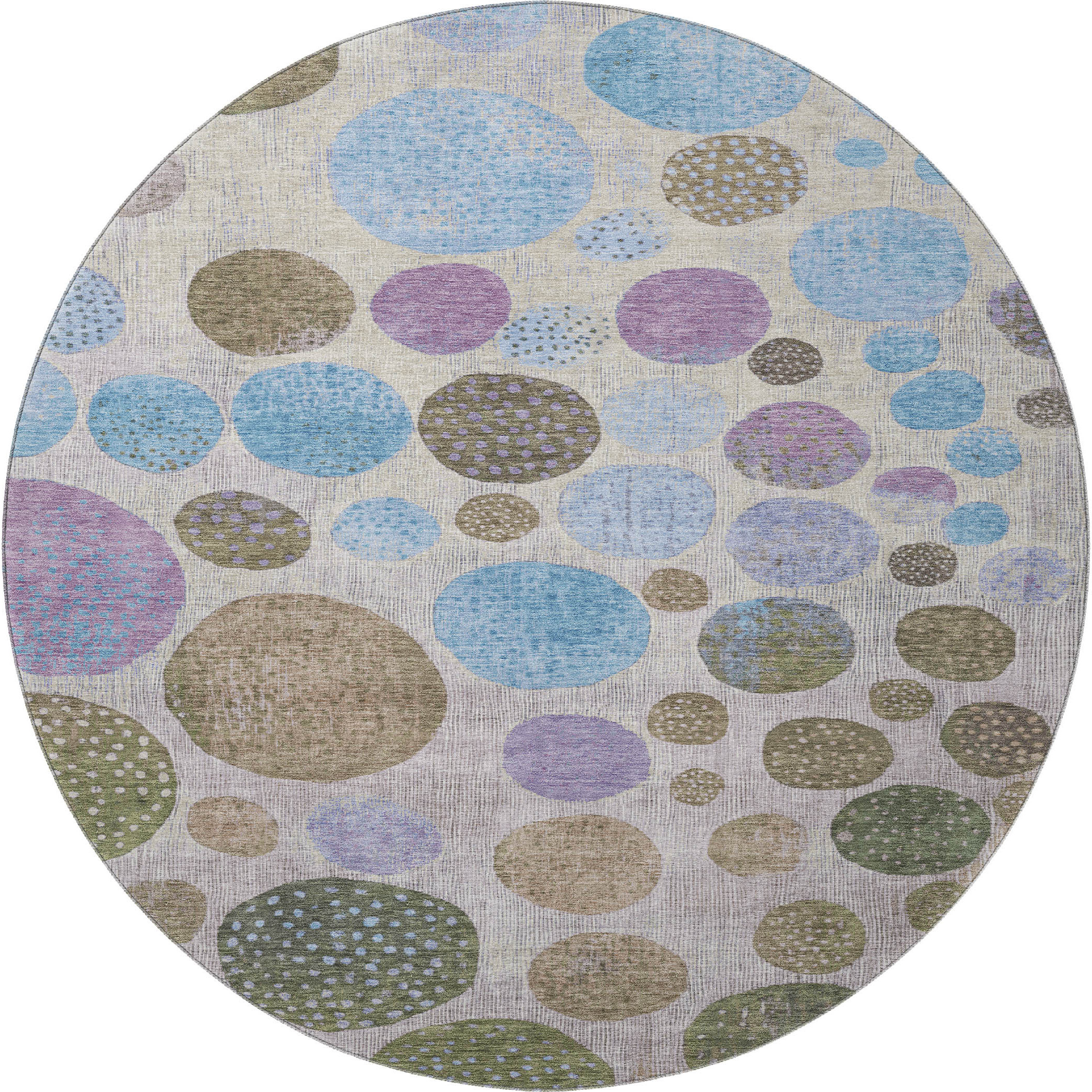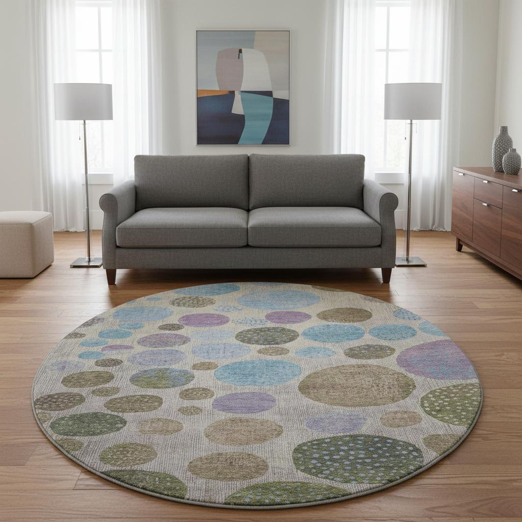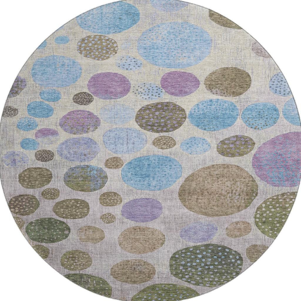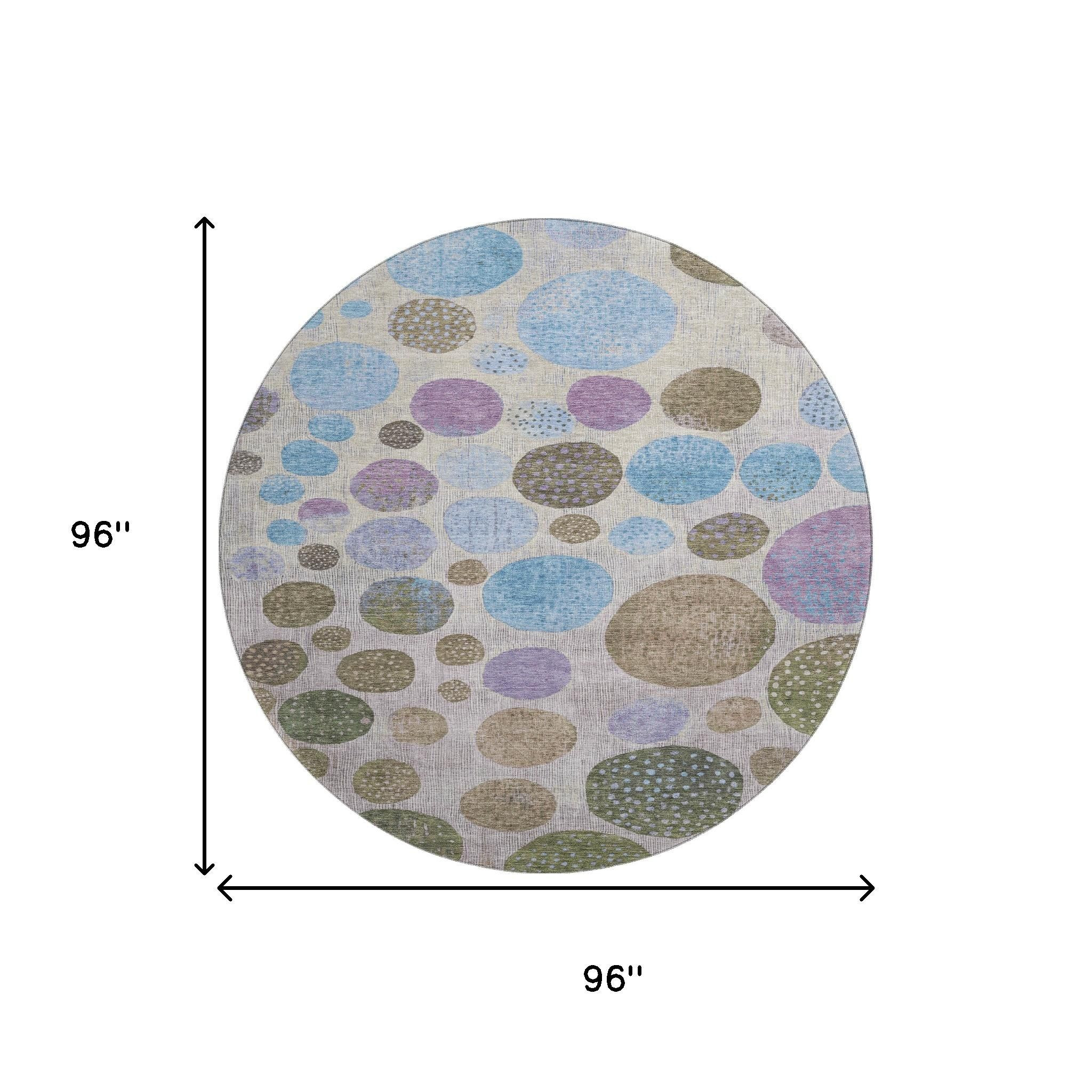 This 8-foot taupe blue and beige geometric washable round rug with uv protection, is a great way to add warmth to a room. Ideal for spaces with kids and pets, this rug is stain resistant to help repel dirt and spilled liquids. Built to last, this rug crafted from polyester fibers is known for its durability and long lasting appeal. Rugs are a great way to showcase your style, hide imperfections, warm your home and reduce noise. This larger sized, transitional styled rug is ready to create a focal point or statement piece in your room. 96.00-inch h x 96.00-inch w x 0.39-inch d.