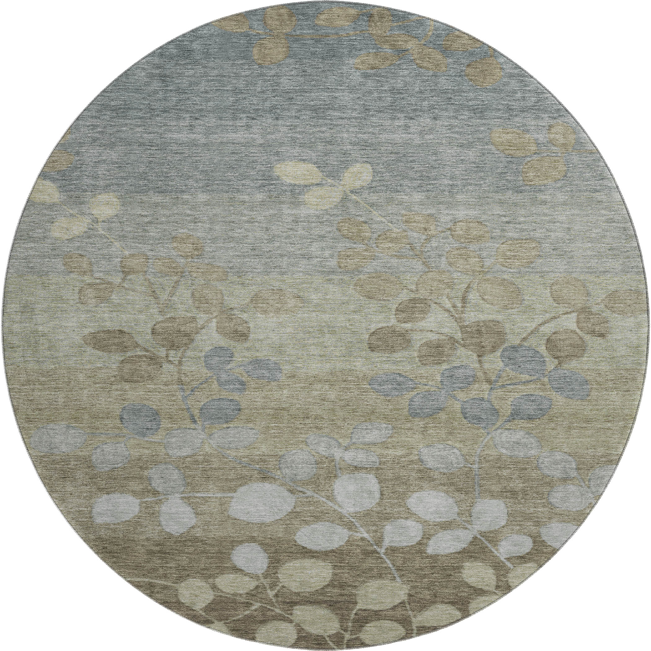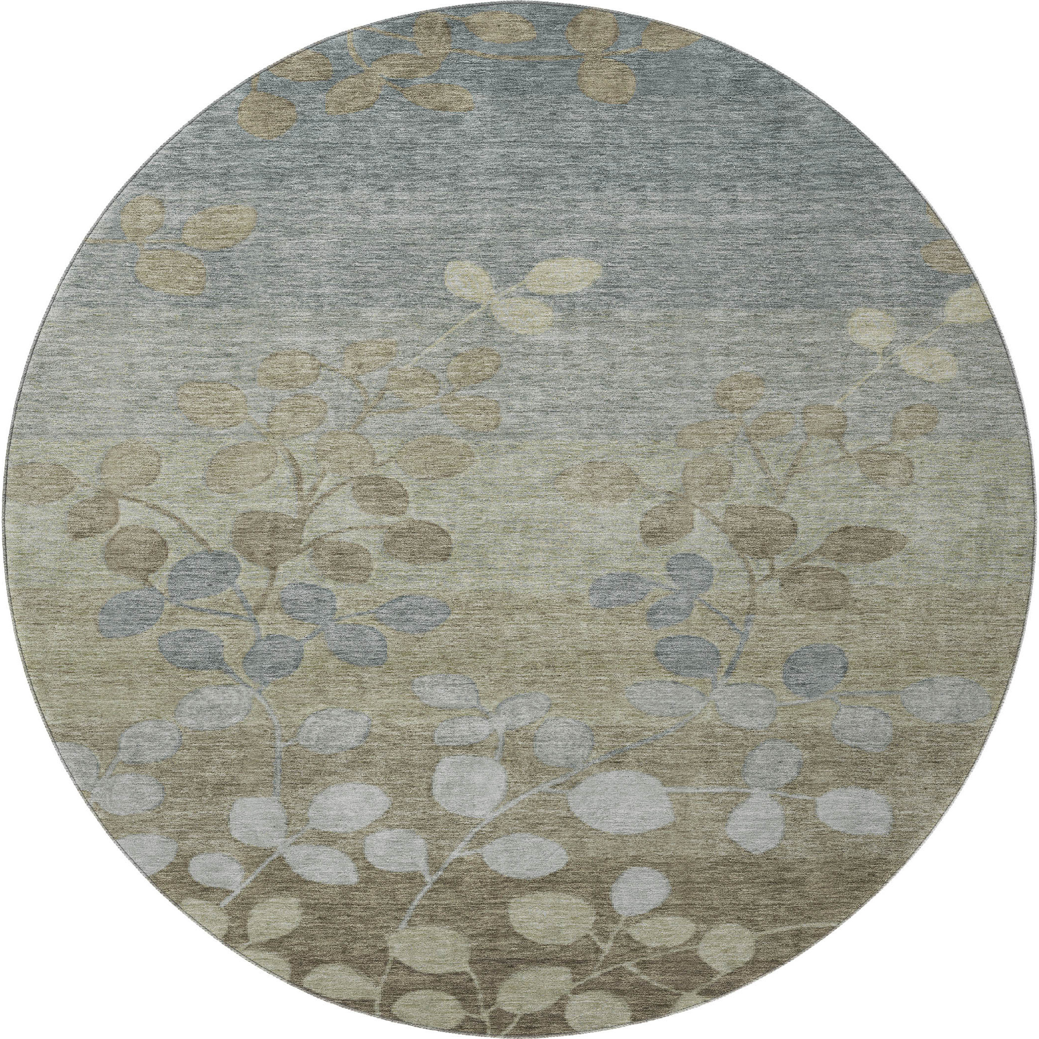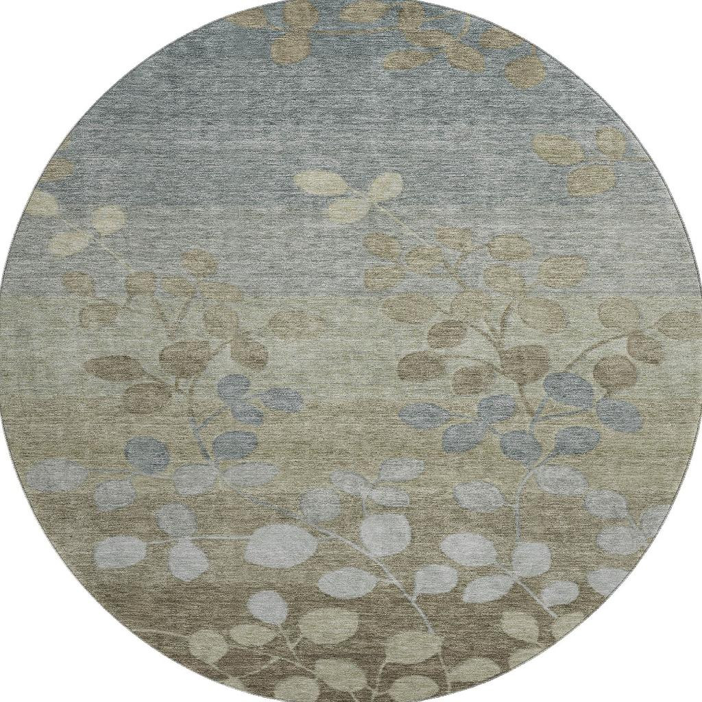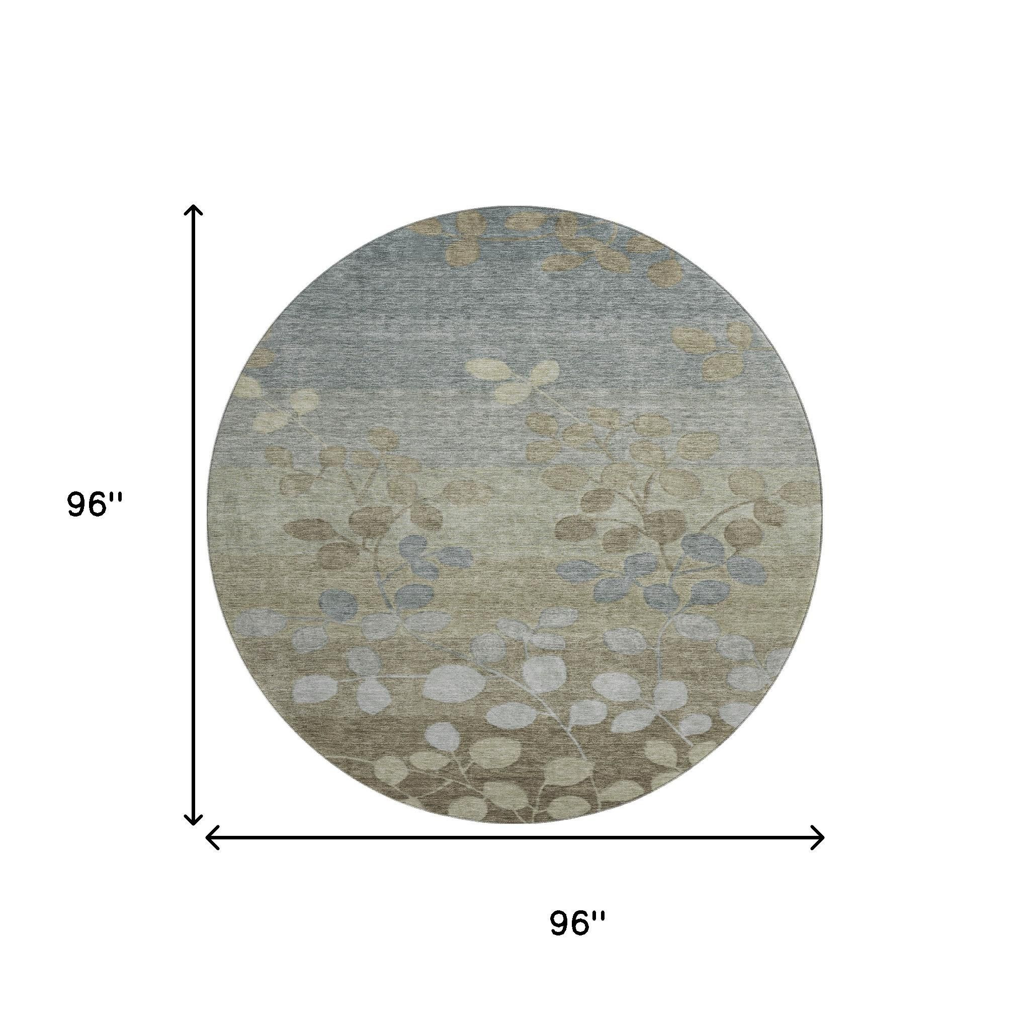 Add great coloration and comfortable texture to your space with this 8-foot khaki and gray floral washable round rug with uv protection. Ideal for spaces with kids and pets, this rug is stain resistant to help repel dirt and spilled liquids. Built to last, this rug crafted from polyester fibers is known for its durability and long lasting appeal. Rugs are a great way to showcase your style, hide imperfections, warm your home and reduce noise. This larger sized, transitional styled rug is ready to create a focal point or statement piece in your room. 96.00-inch h x 96.00-inch w x 0.39-inch d.