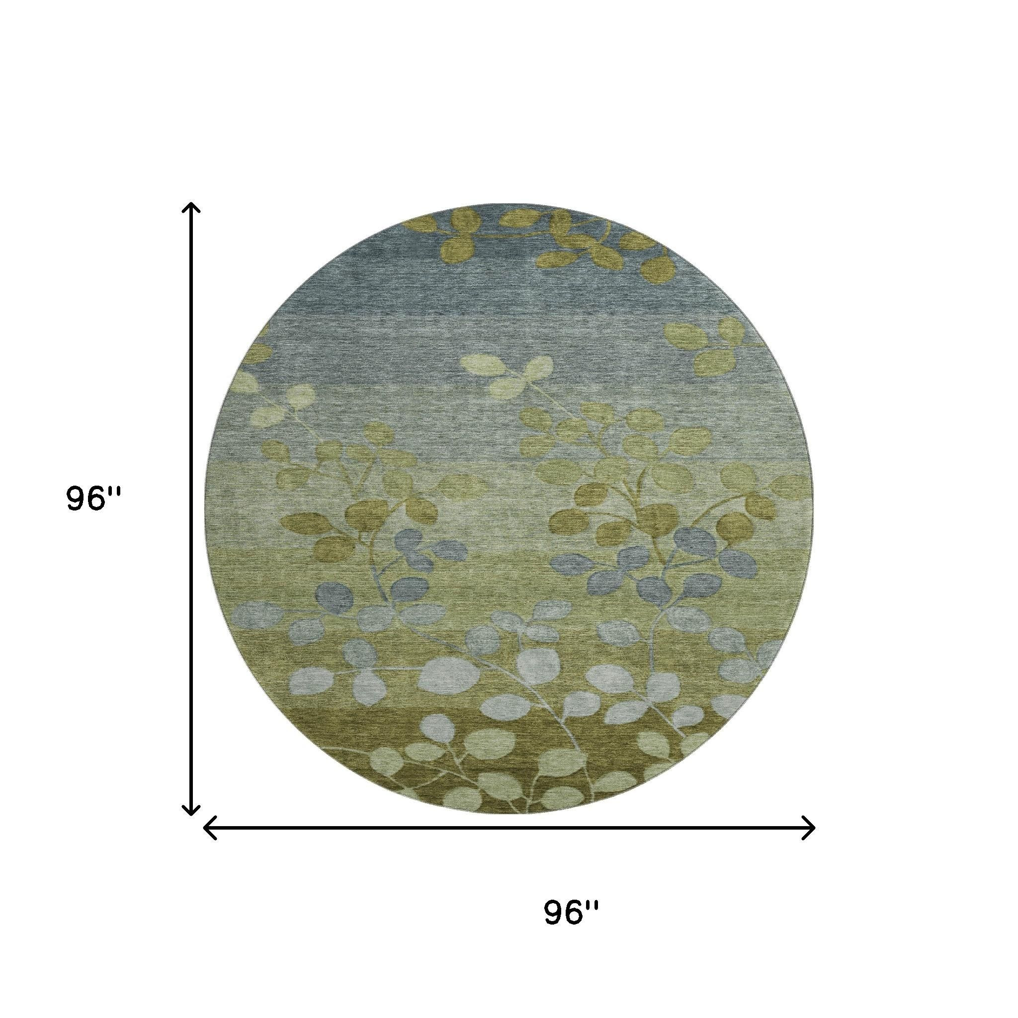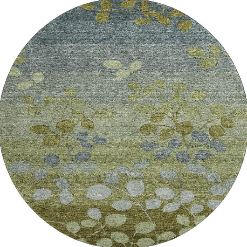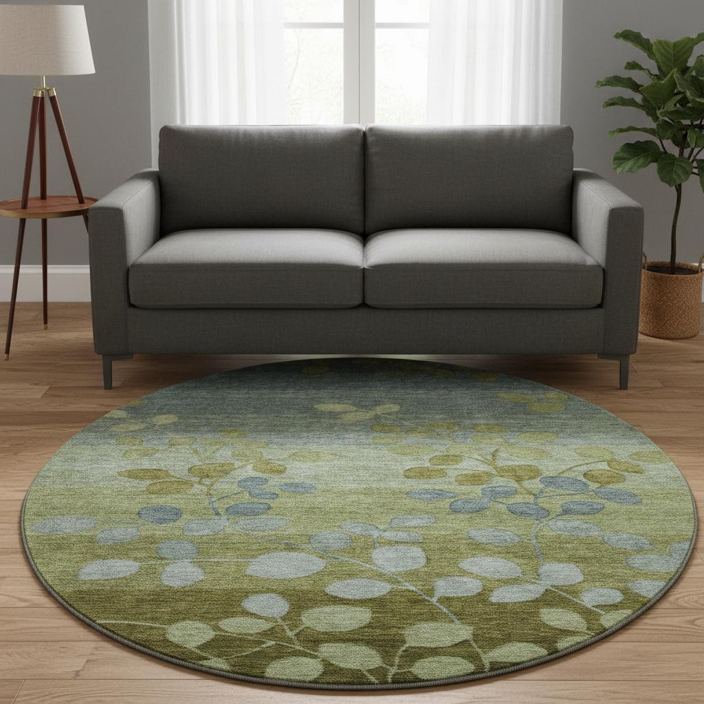 Add some artistry to your room with this 8-foot olive green and gray floral washable round rug with uv protection. Ideal for spaces with kids and pets, this rug is stain resistant to help repel dirt and spilled liquids. Built to last, this rug crafted from polyester fibers is known for its durability and long lasting appeal. Rugs are a great way to showcase your style, hide imperfections, warm your home and reduce noise. This larger sized, transitional styled rug is ready to create a focal point or statement piece in your room. 96.00-inch h x 96.00-inch w x 0.39-inch d.