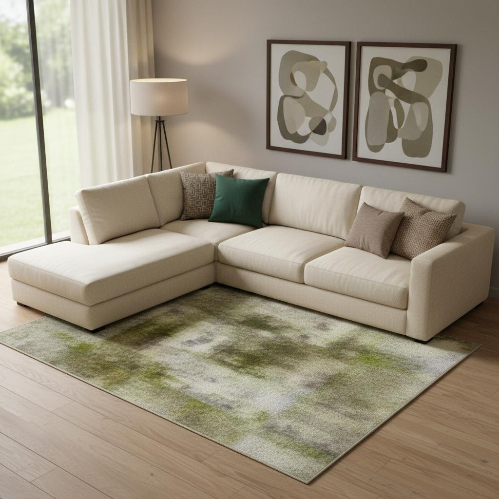 Add some artistry to your room with this 9-foot x 12-foot artichoke green and ivory abstract washable area rug with uv protection. Ideal for spaces with kids and pets, this rug is stain resistant to help repel dirt and spilled liquids. Built to last, this rug crafted from polyester fibers is known for its durability and long lasting appeal. Rugs are a great way to showcase your style, hide imperfections, warm your home and reduce noise. This larger sized, transitional styled rug is ready to create a focal point or statement piece in your room. 108.00-inch h x 144.00-inch w x 0.39-inch d.