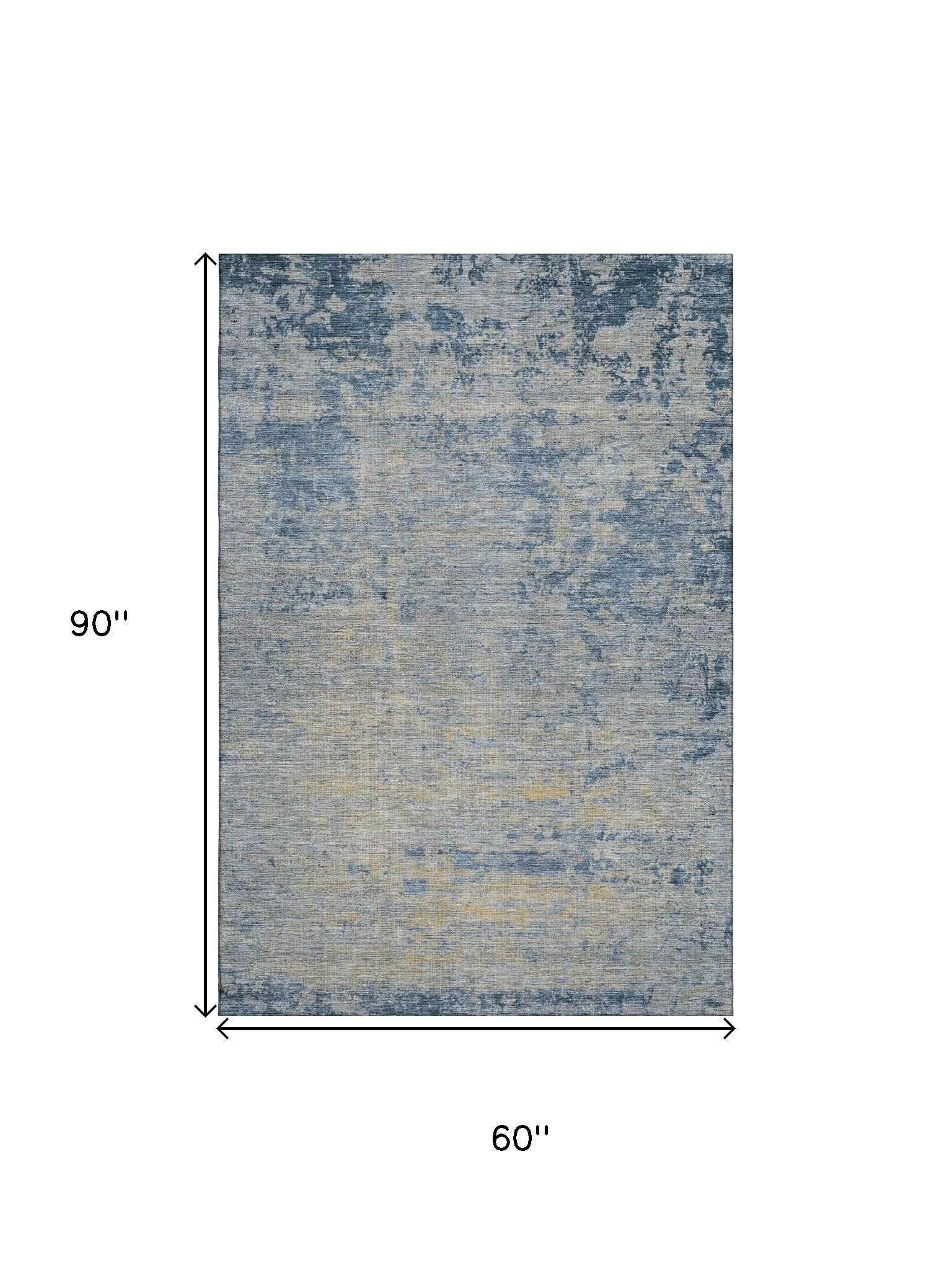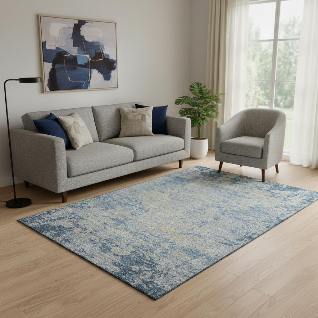 Add some artistry to your room with this 5-foot x 8-foot navy blue and beige abstract washable area rug with uv protection. Ideal for spaces with kids and pets, this rug is stain resistant to help repel dirt and spilled liquids. Built to last, this rug crafted from polyester fibers is known for its durability and long lasting appeal. Rugs are a great way to showcase your style, hide imperfections, warm your home and reduce noise. This larger sized, transitional styled rug is ready to create a focal point or statement piece in your room. 60.00-inch h x 90.00-inch w x 0.39-inch d.