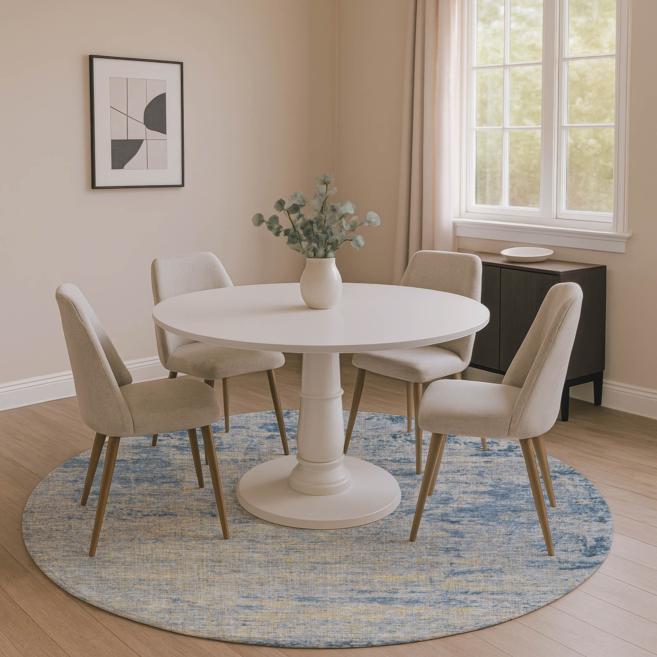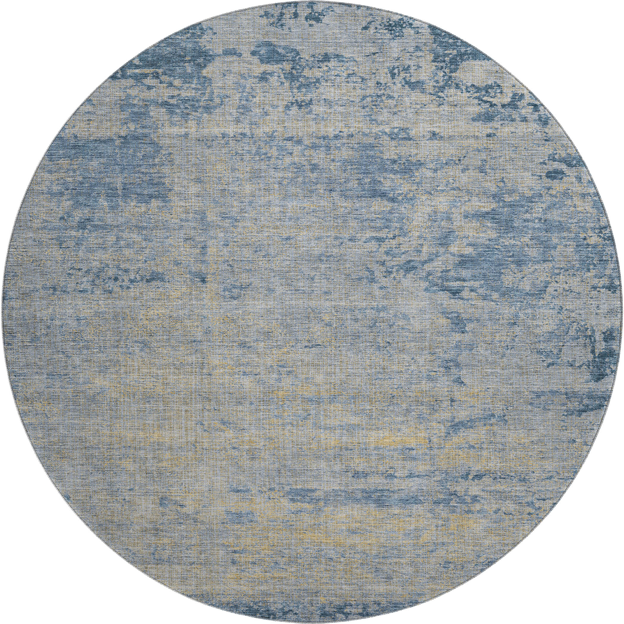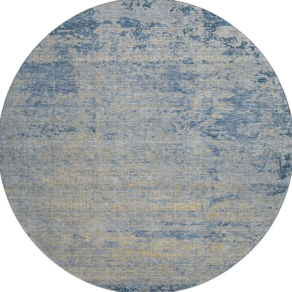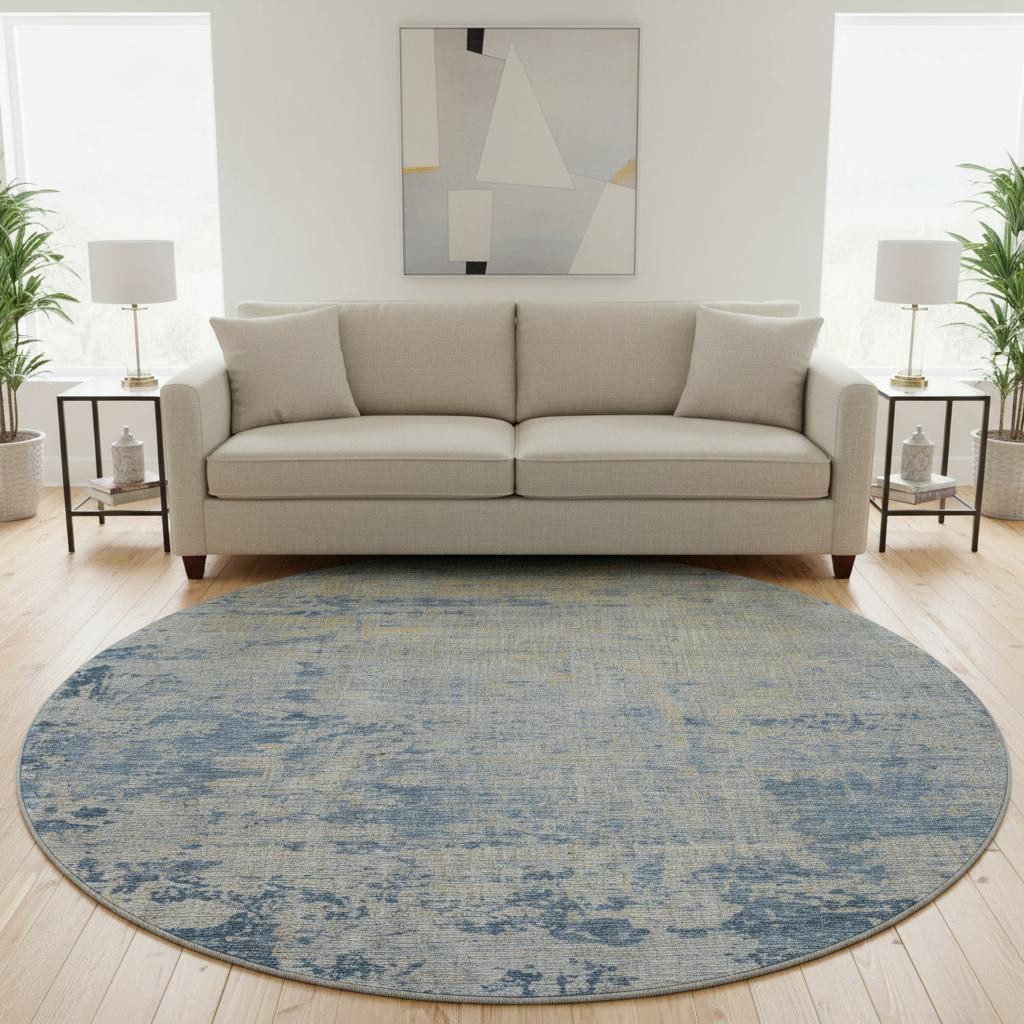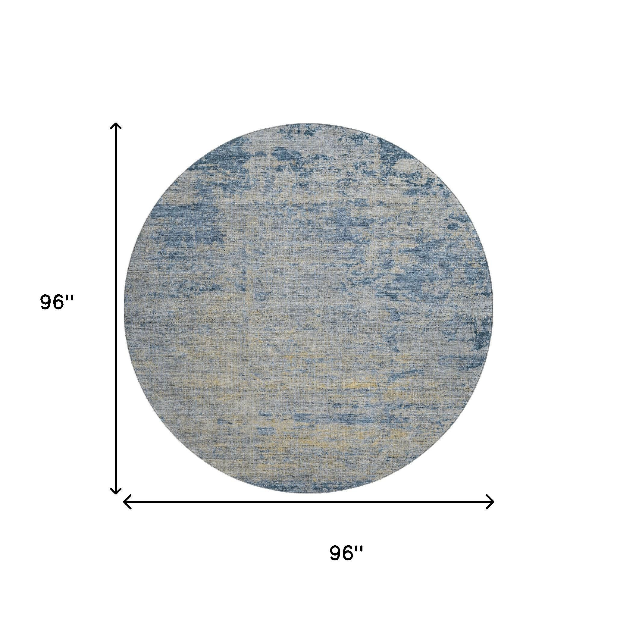 Add some artistry to your room with this 8-foot navy blue and beige abstract washable round rug with uv protection. Ideal for spaces with kids and pets, this rug is stain resistant to help repel dirt and spilled liquids. Built to last, this rug crafted from polyester fibers is known for its durability and long lasting appeal. Rugs are a great way to showcase your style, hide imperfections, warm your home and reduce noise. This larger sized, transitional styled rug is ready to create a focal point or statement piece in your room. 96.00-inch h x 96.00-inch w x 0.39-inch d.