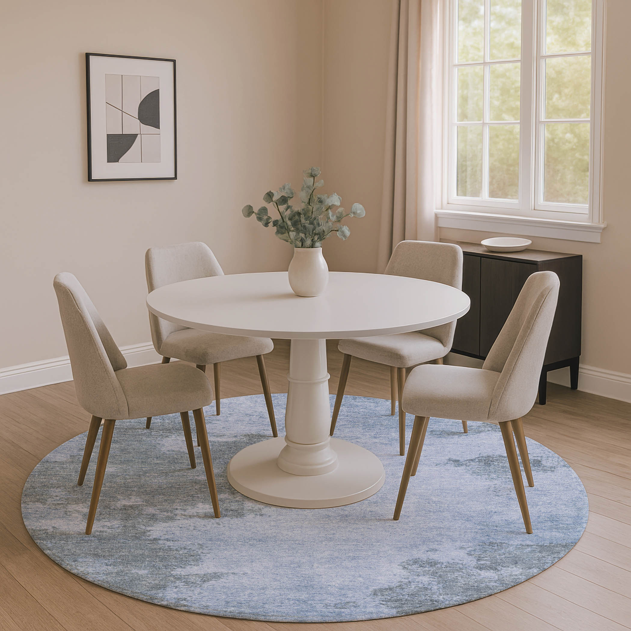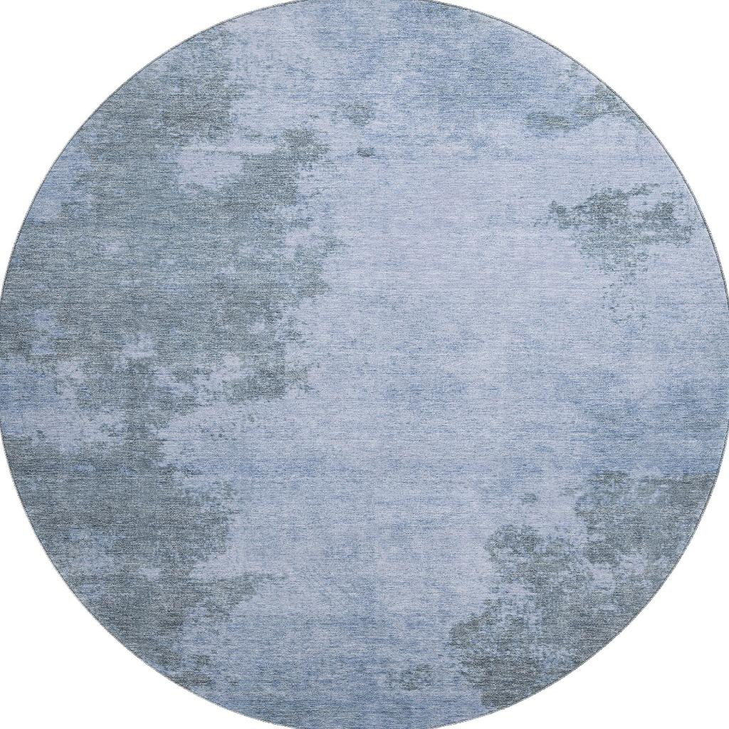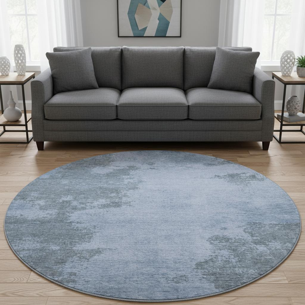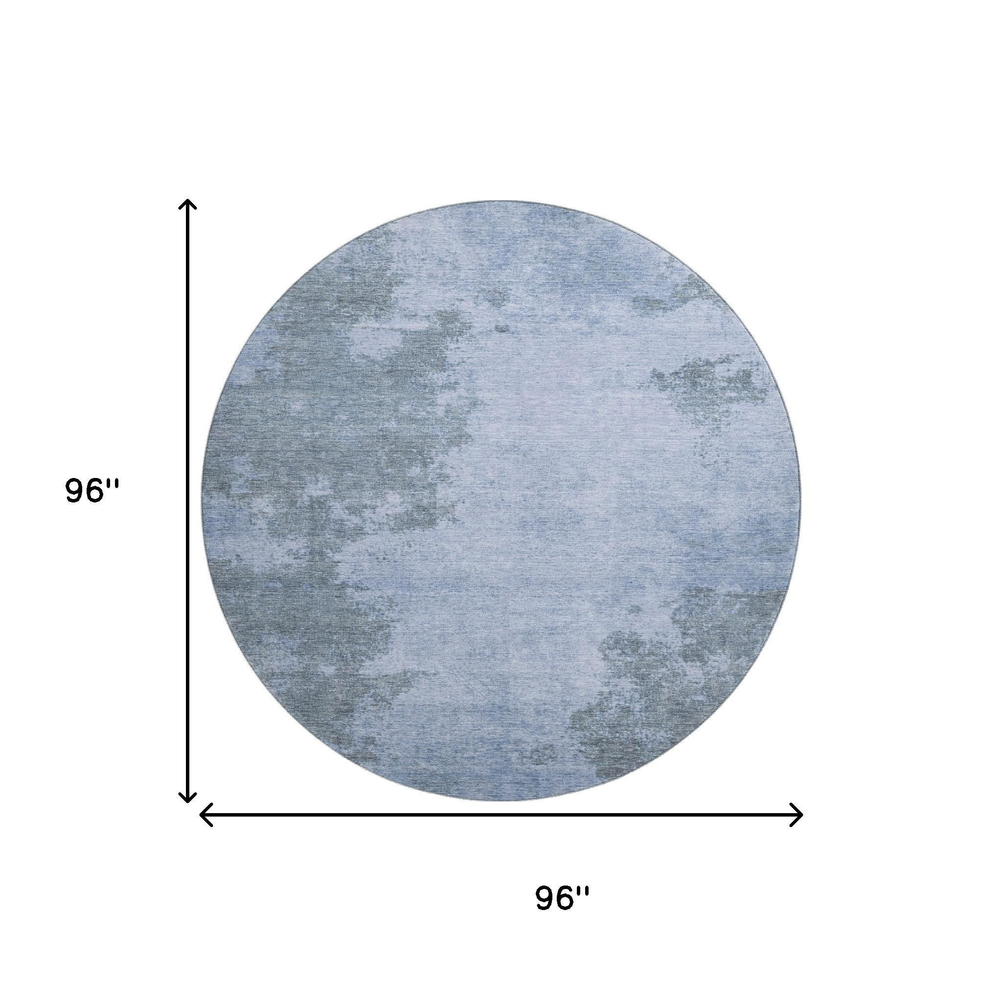 Add some artistry to your room with this 8-foot blue and gray abstract washable round rug with uv protection. Ideal for spaces with kids and pets, this rug is stain resistant to help repel dirt and spilled liquids. Built to last, this rug crafted from polyester fibers is known for its durability and long lasting appeal. Rugs are a great way to showcase your style, hide imperfections, warm your home and reduce noise. This larger sized, transitional styled rug is ready to create a focal point or statement piece in your room. 96.00-inch h x 96.00-inch w x 0.39-inch d.
