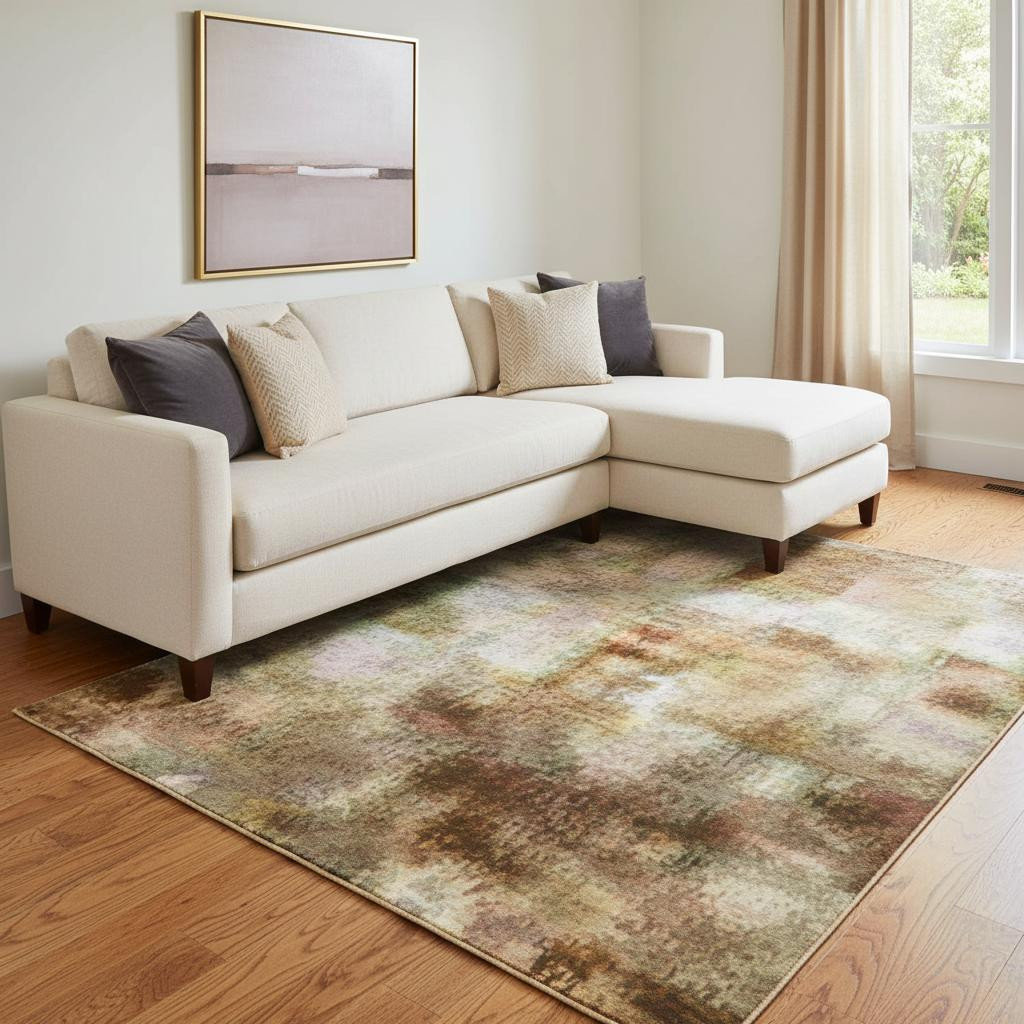 This 8-foot x 10-foot beige and brown abstract washable area rug with uv protection, is a great way to add warmth to a room. Ideal for spaces with kids and pets, this rug is stain resistant to help repel dirt and spilled liquids. Built to last, this rug crafted from polyester fibers is known for its durability and long lasting appeal. Rugs are a great way to showcase your style, hide imperfections, warm your home and reduce noise. This larger sized, transitional styled rug is ready to create a focal point or statement piece in your room. 96.00-inch h x 120.00-inch w x 0.39-inch d.