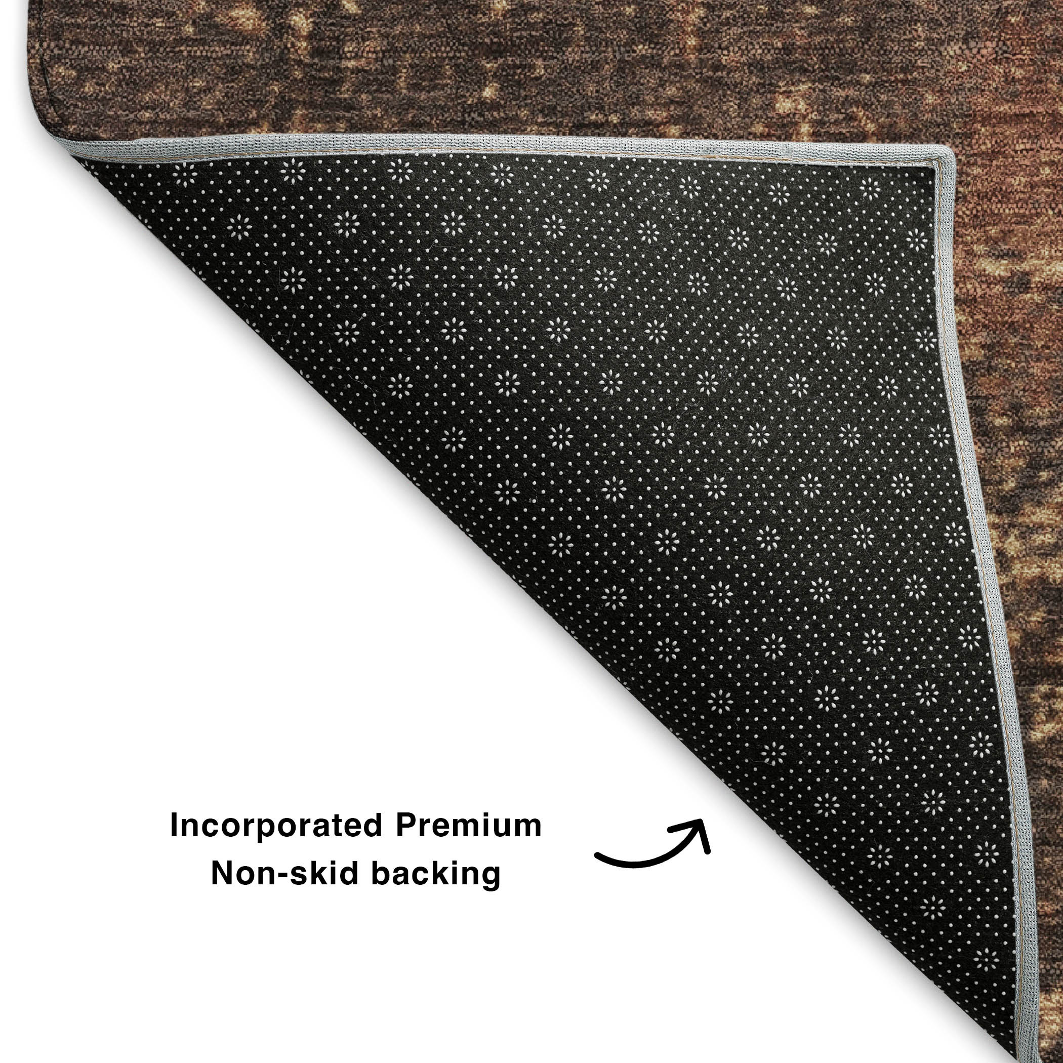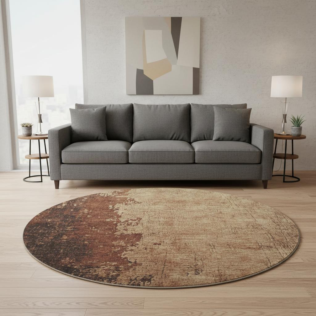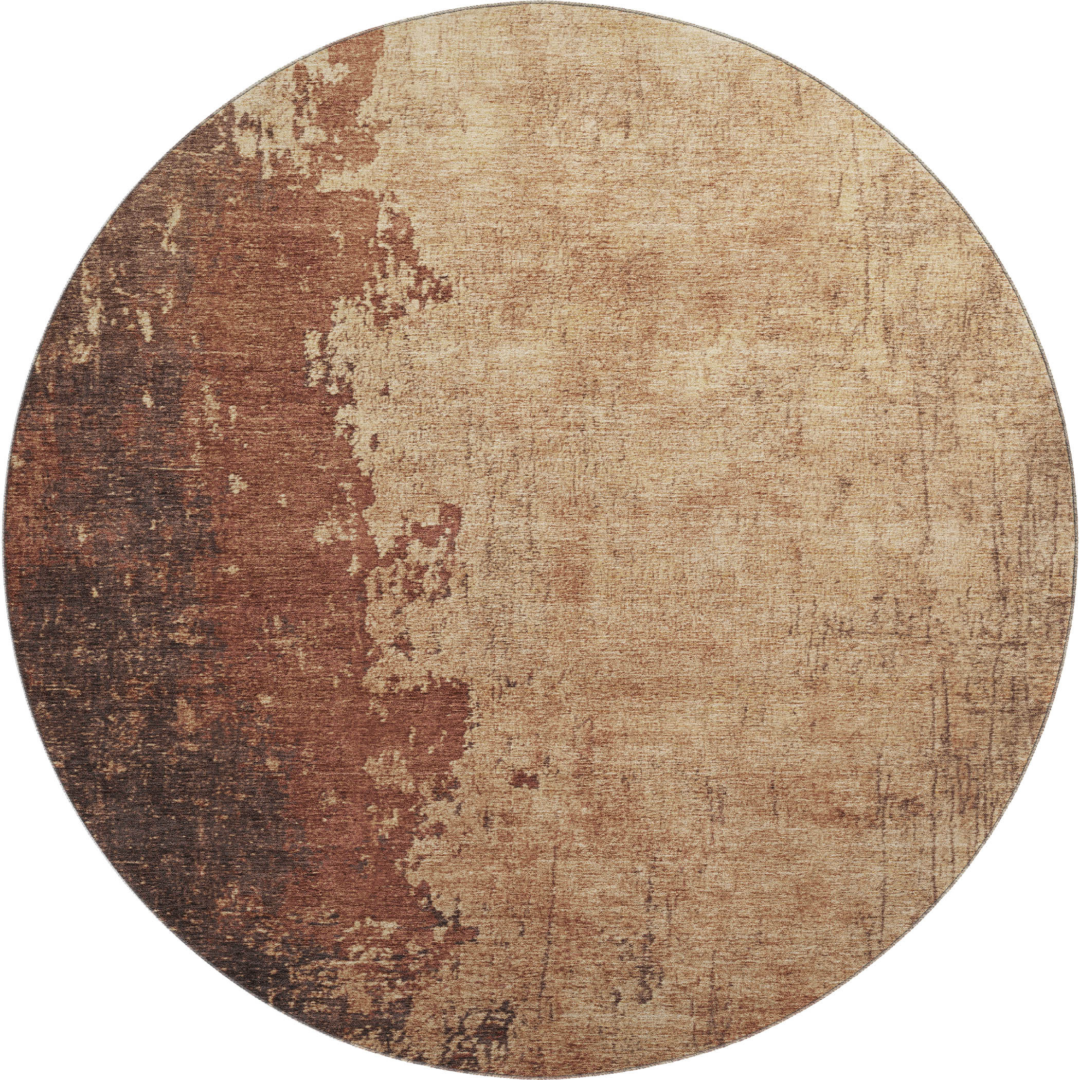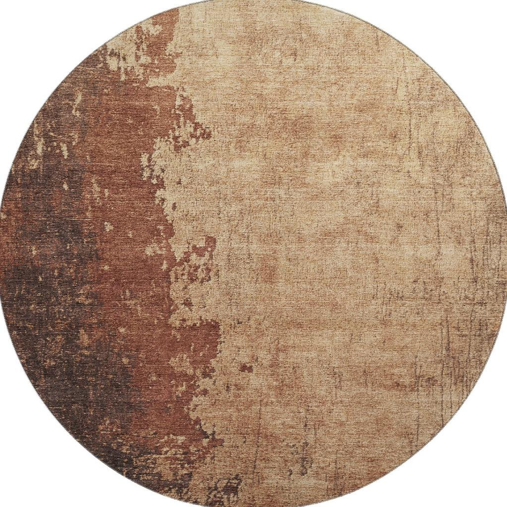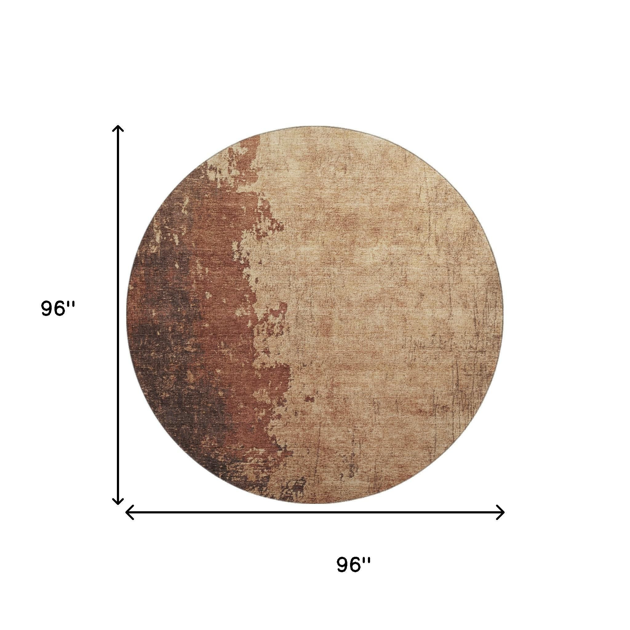 This 8-foot rust and copper abstract washable round rug with uv protection, is a great way to add warmth to a room. Ideal for spaces with kids and pets, this rug is stain resistant to help repel dirt and spilled liquids. Built to last, this rug crafted from polyester fibers is known for its durability and long lasting appeal. Rugs are a great way to showcase your style, hide imperfections, warm your home and reduce noise. This larger sized, transitional styled rug is ready to create a focal point or statement piece in your room. 96.00-inch h x 96.00-inch w x 0.39-inch d.