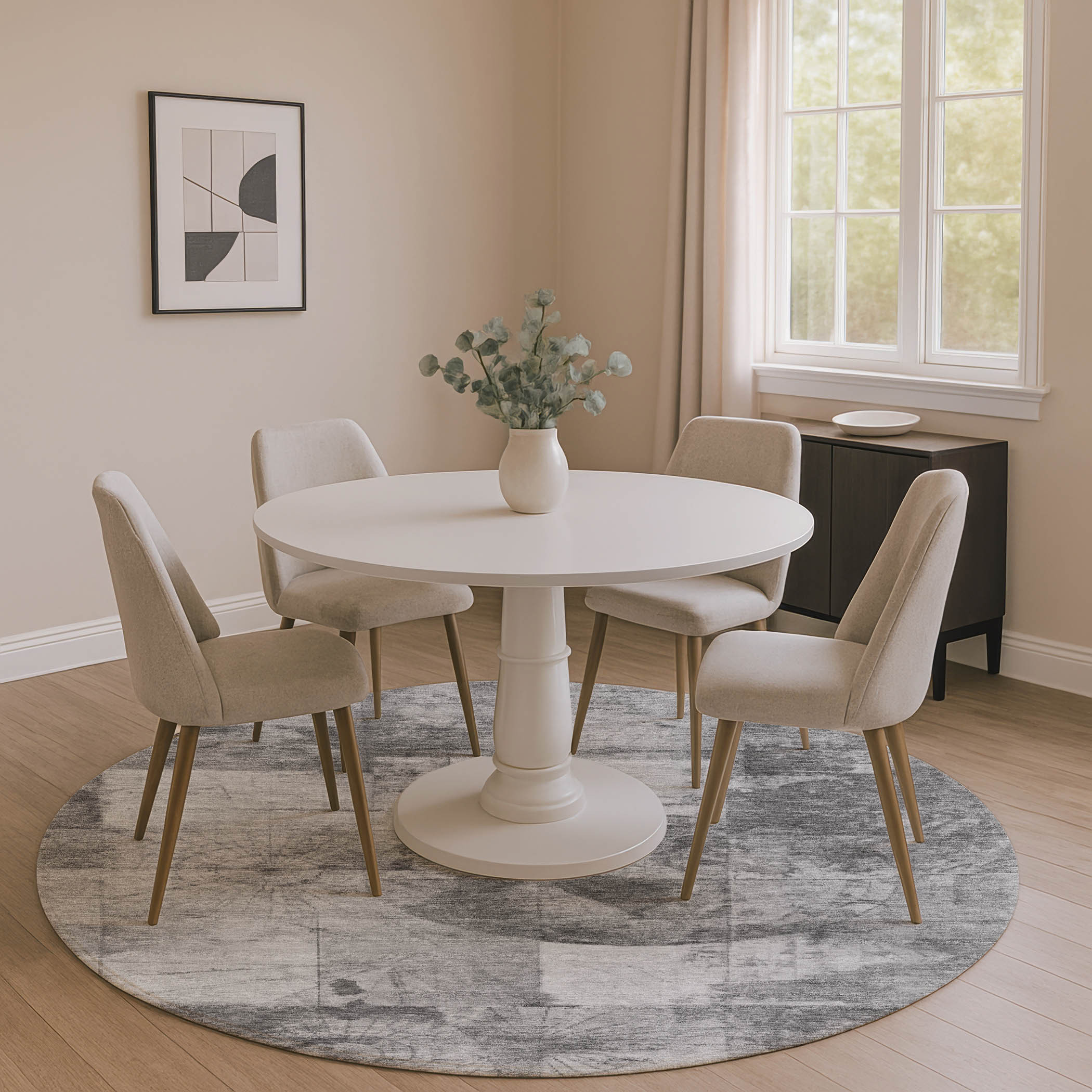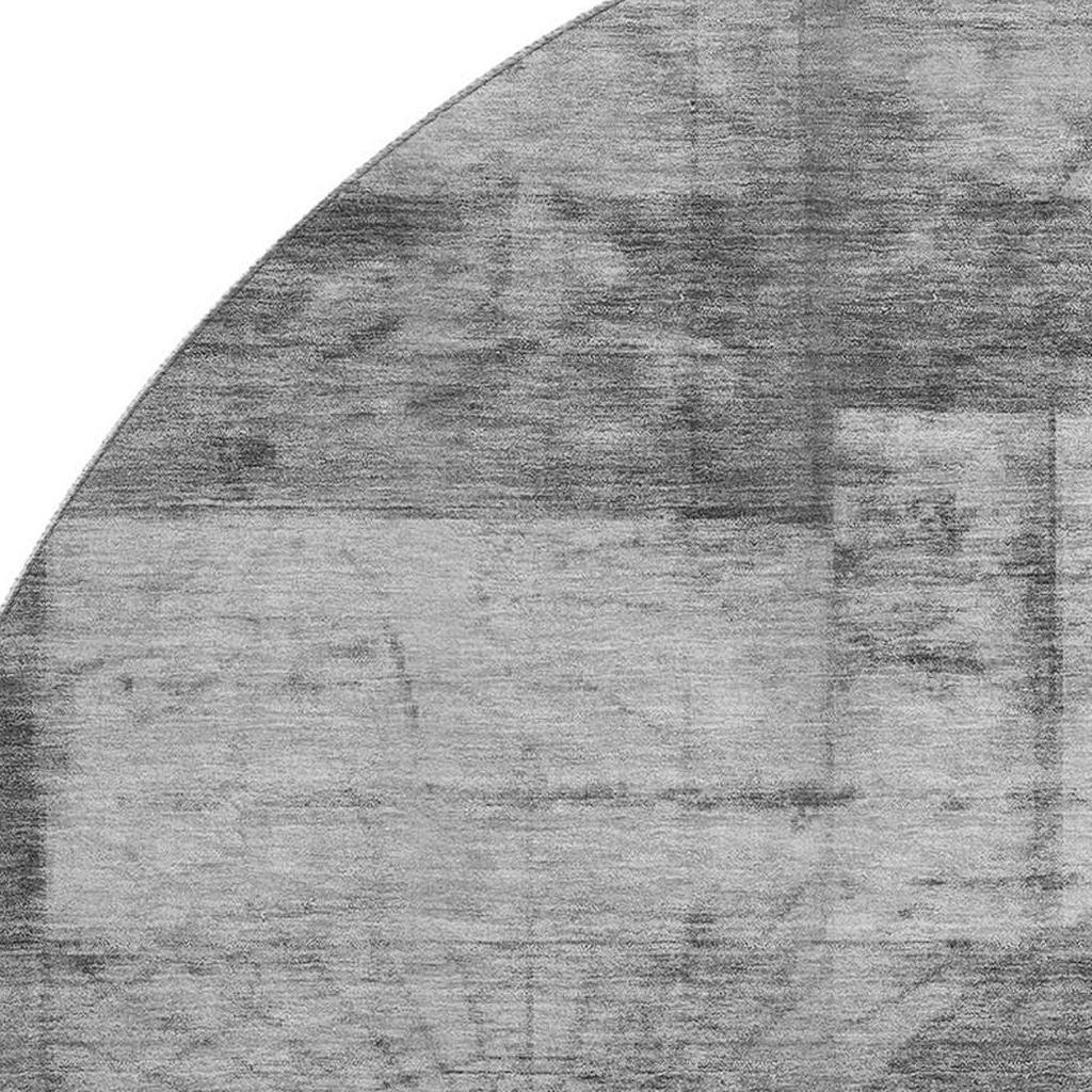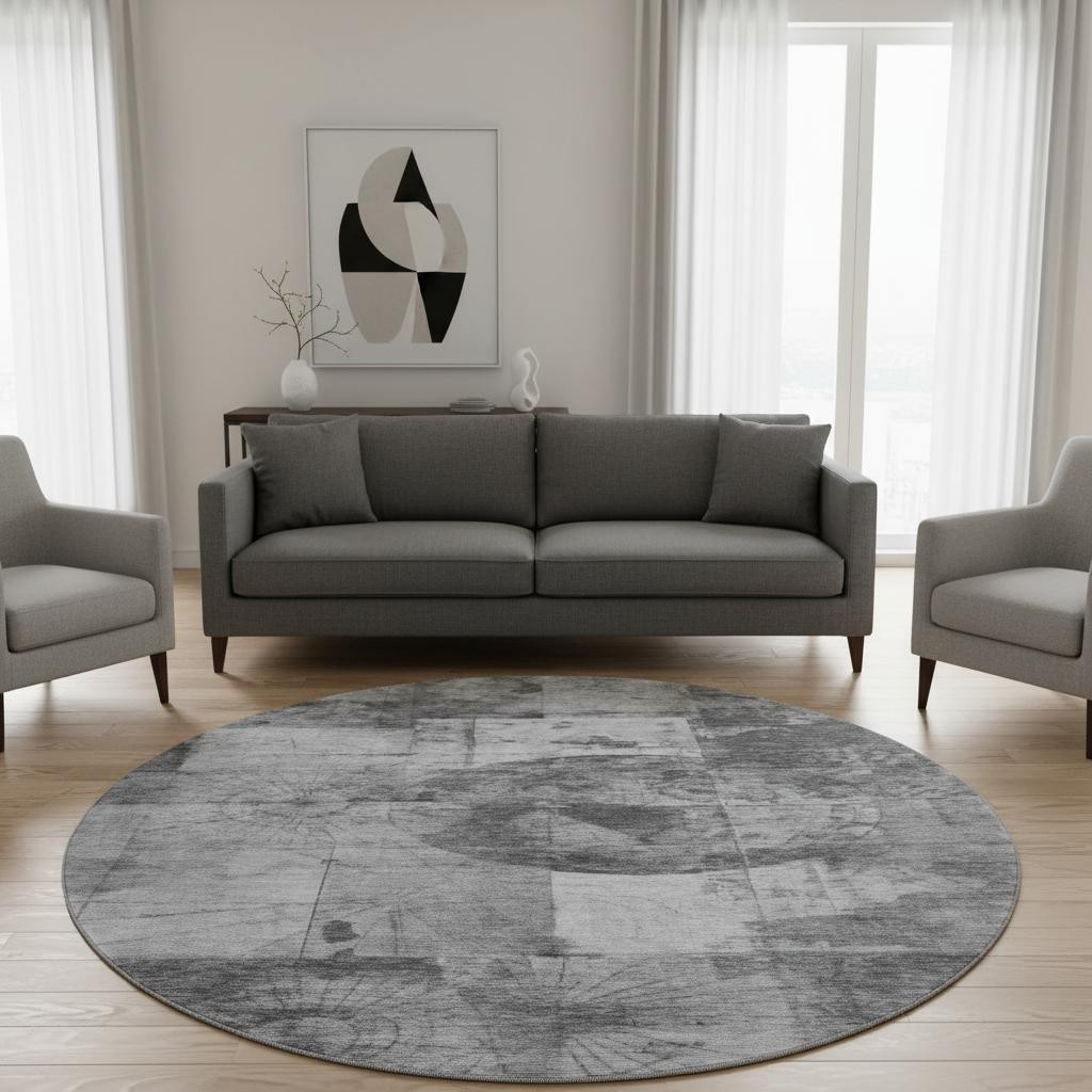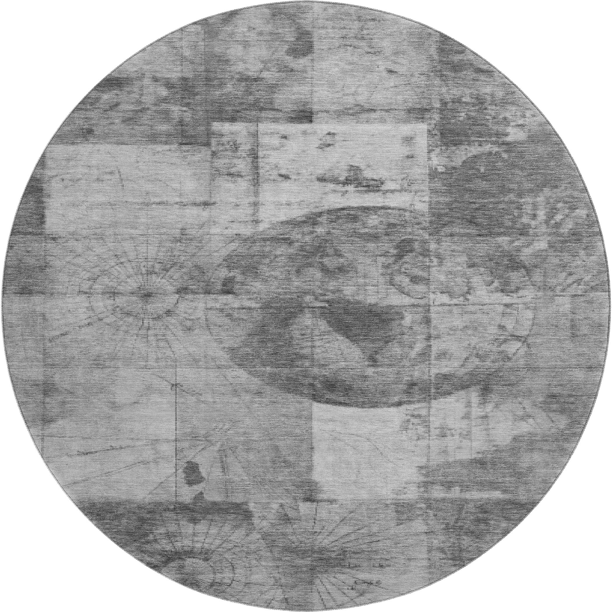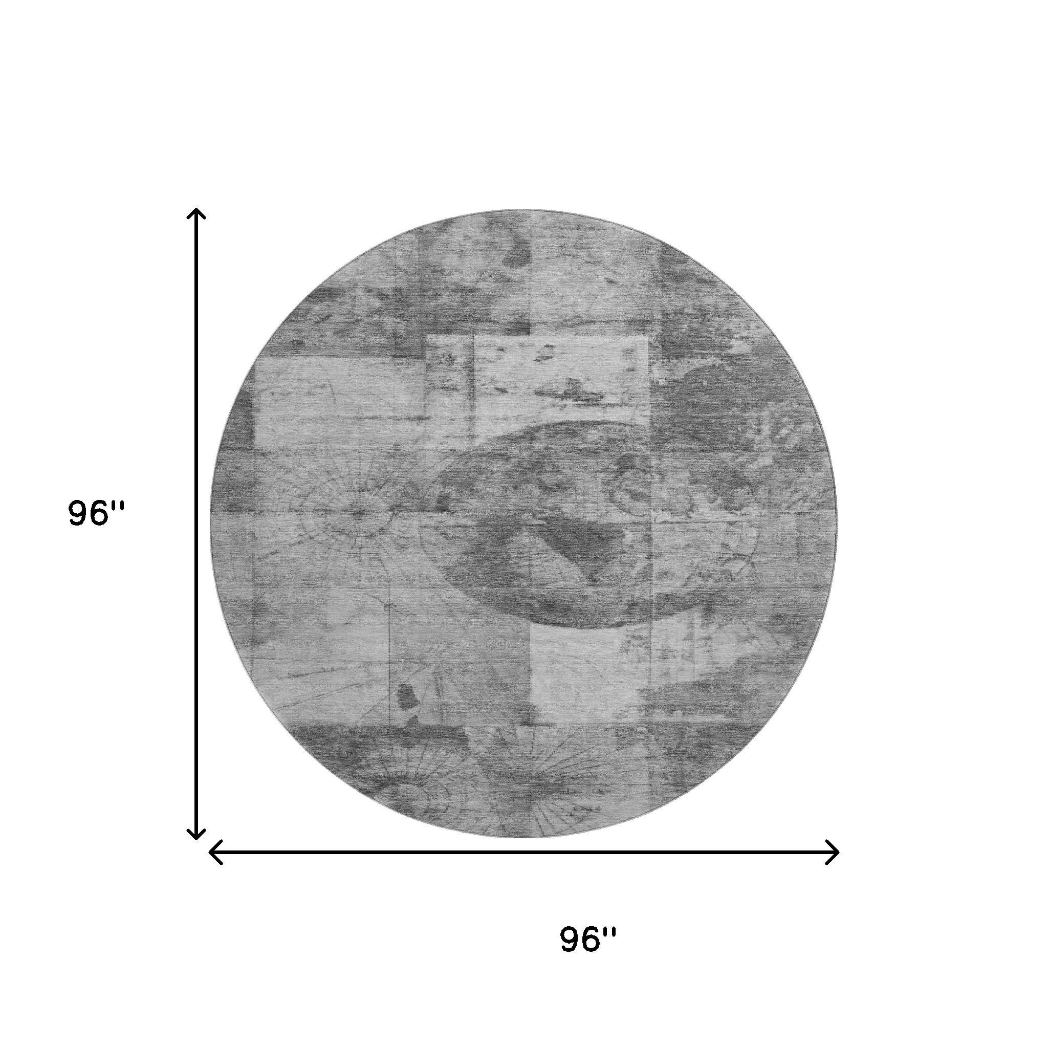 This 8-foot gray and silver geometric washable round rug with uv protection, is a great way to add warmth to a room. Ideal for spaces with kids and pets, this rug is stain resistant to help repel dirt and spilled liquids. Built to last, this rug crafted from polyester fibers is known for its durability and long lasting appeal. Rugs are a great way to showcase your style, hide imperfections, warm your home and reduce noise. This larger sized, transitional styled rug is ready to create a focal point or statement piece in your room. 96.00-inch h x 96.00-inch w x 0.39-inch d.