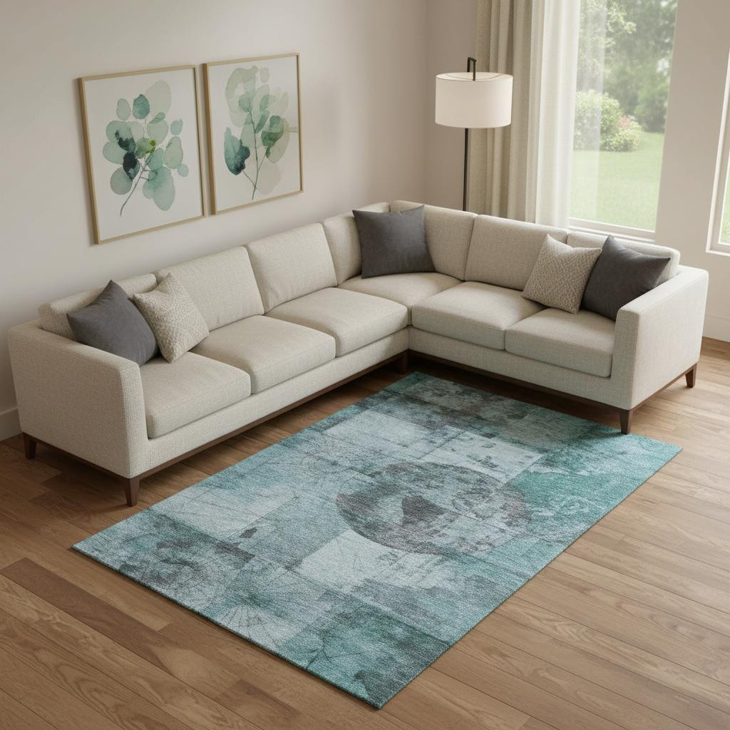 This 10-foot x 14-foot teal and gray geometric washable area rug with uv protection, is a great way to add warmth to a room. Ideal for spaces with kids and pets, this rug is stain resistant to help repel dirt and spilled liquids. Built to last, this rug crafted from polyester fibers is known for its durability and long lasting appeal. Rugs are a great way to showcase your style, hide imperfections, warm your home and reduce noise. This larger sized, transitional styled rug is ready to create a focal point or statement piece in your room. 120.00-inch h x 168.00-inch w x 0.39-inch d.