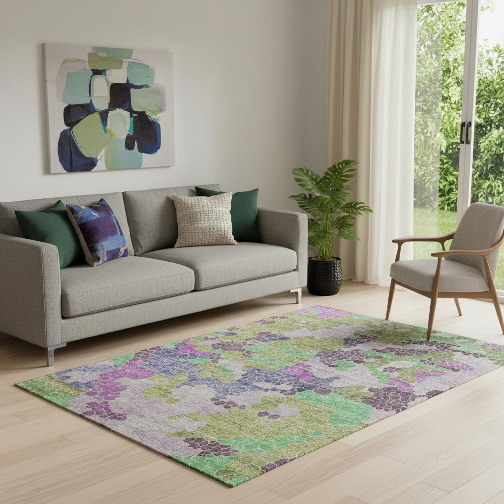 Set an inviting tone in your space with this 5-foot x 8-foot fern green eggplant and blush geometric washable area rug with uv protection. Ideal for spaces with kids and pets, this rug is stain resistant to help repel dirt and spilled liquids. Built to last, this rug crafted from polyester fibers is known for its durability and long lasting appeal. Rugs are a great way to showcase your style, hide imperfections, warm your home and reduce noise. This larger sized, transitional styled rug is ready to create a focal point or statement piece in your room. 60.00-inch h x 90.00-inch w x 0.39-inch d.