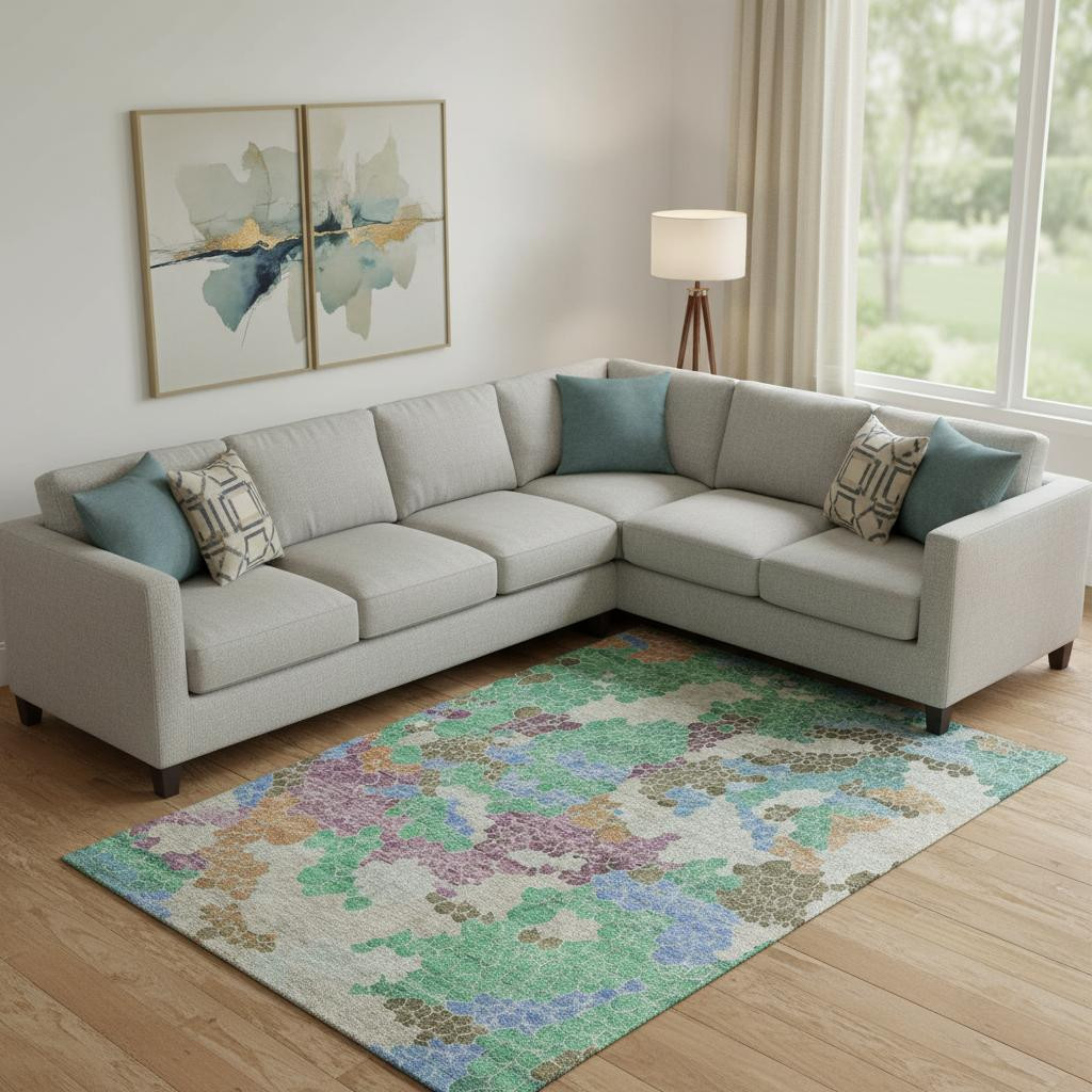This 9-foot x 12-foot green copper and blue geometric washable area rug with uv protection, is a great way to add warmth to a room. Ideal for spaces with kids and pets, this rug is stain resistant to help repel dirt and spilled liquids. Built to last, this rug crafted from polyester fibers is known for its durability and long lasting appeal. Rugs are a great way to showcase your style, hide imperfections, warm your home and reduce noise. This larger sized, transitional styled rug is ready to create a focal point or statement piece in your room. 108.00-inch h x 144.00-inch w x 0.39-inch d.