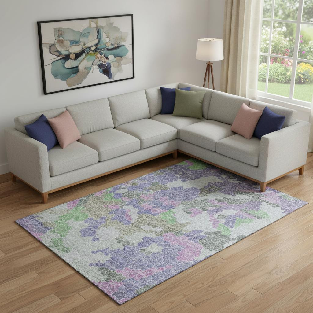 This 10-foot x 14-foot purple gray and green geometric washable area rug with uv protection, is a great way to add warmth to a room. Ideal for spaces with kids and pets, this rug is stain resistant to help repel dirt and spilled liquids. Built to last, this rug crafted from polyester fibers is known for its durability and long lasting appeal. Rugs are a great way to showcase your style, hide imperfections, warm your home and reduce noise. This larger sized, transitional styled rug is ready to create a focal point or statement piece in your room. 120.00-inch h x 168.00-inch w x 0.39-inch d.