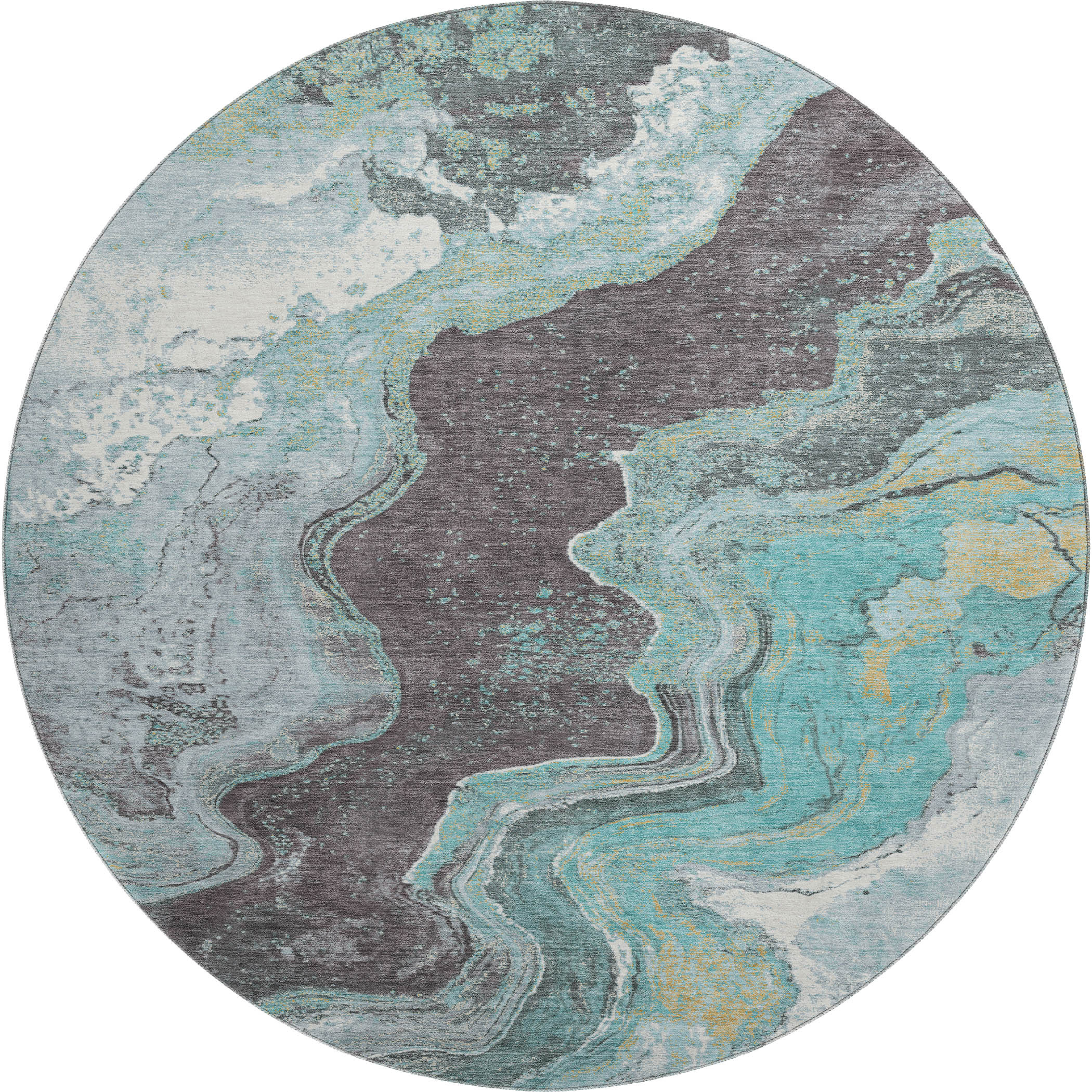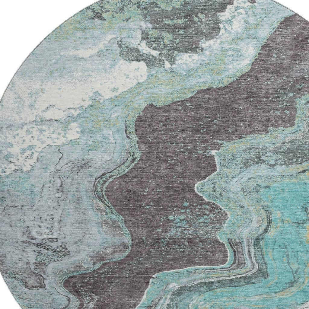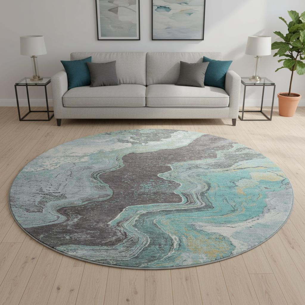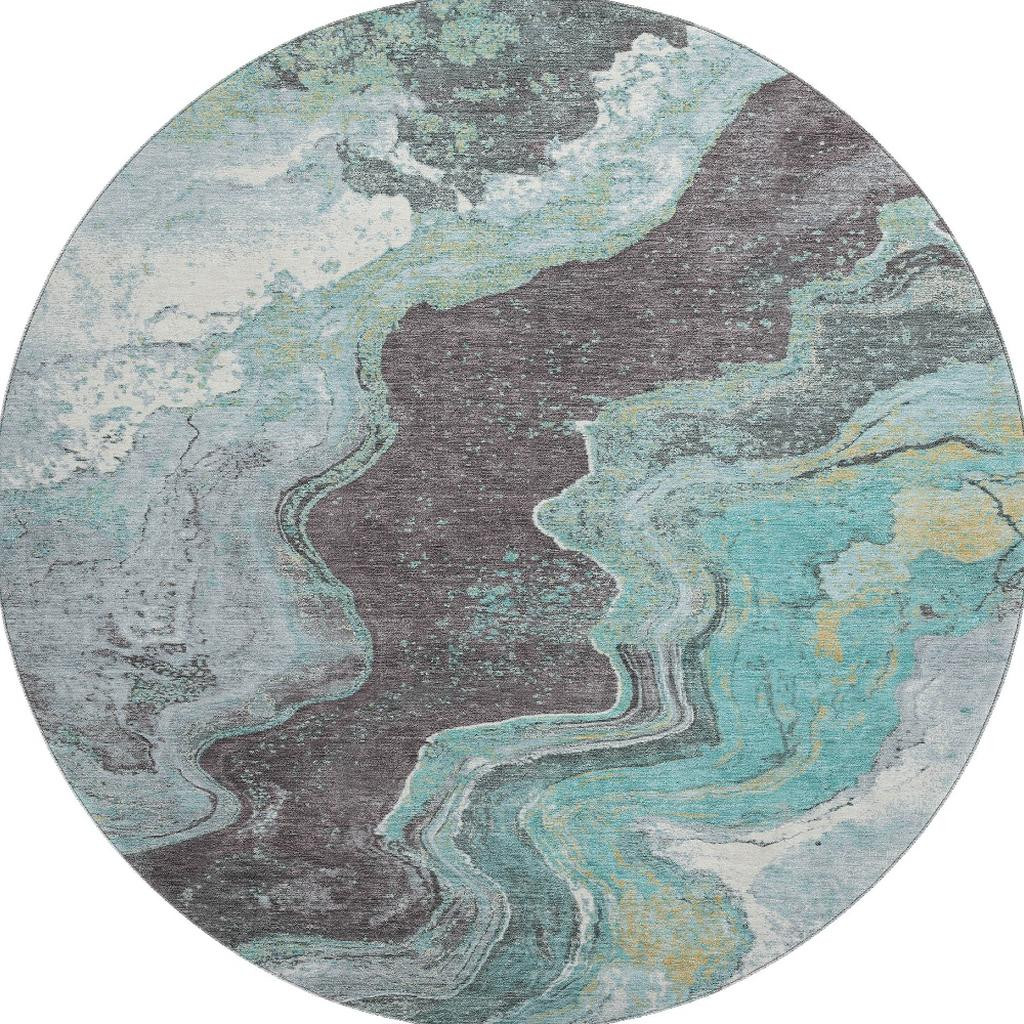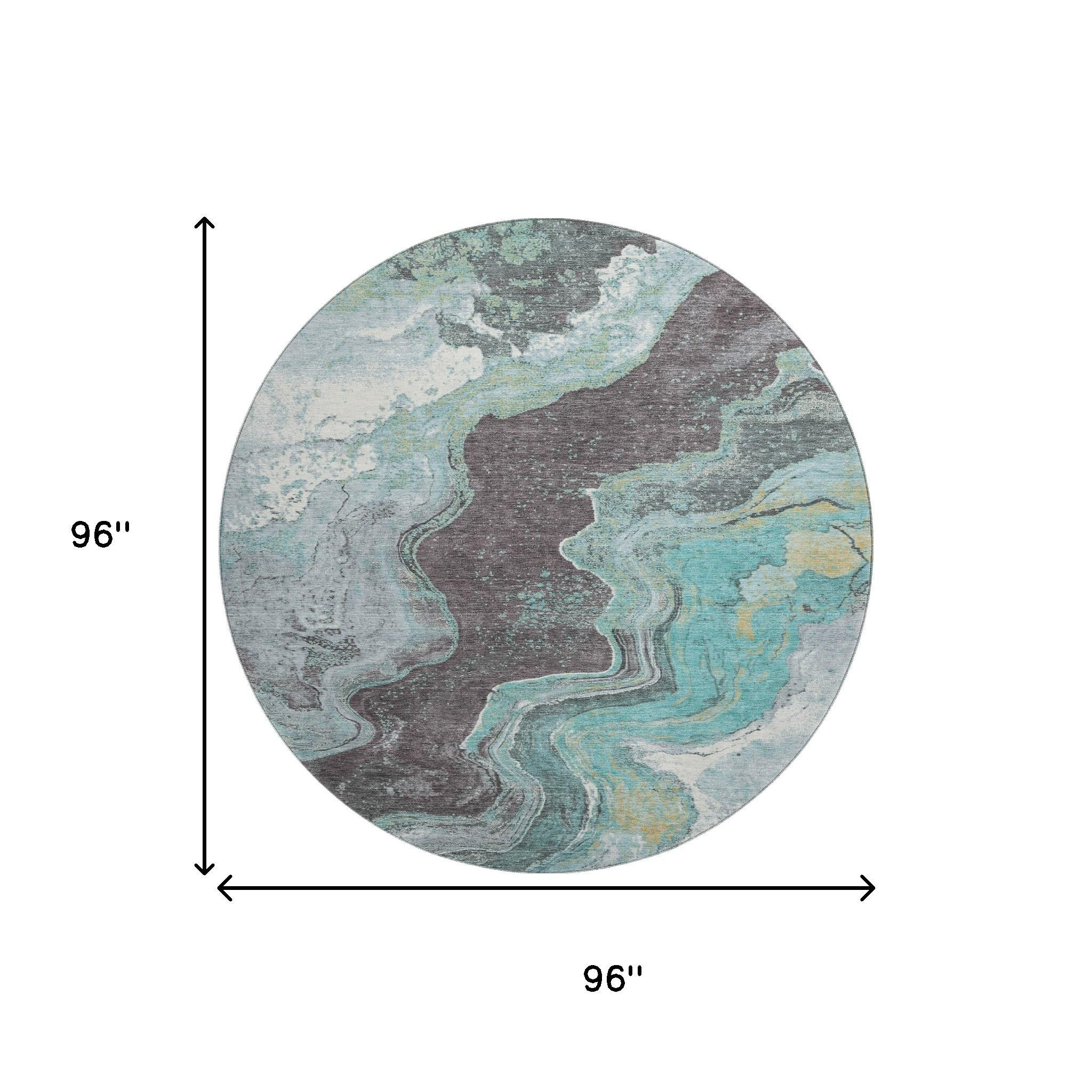 Add some artistry to your room with this 8-foot teal gray and ivory abstract washable round rug with uv protection. Ideal for spaces with kids and pets, this rug is stain resistant to help repel dirt and spilled liquids. Built to last, this rug crafted from polyester fibers is known for its durability and long lasting appeal. Rugs are a great way to showcase your style, hide imperfections, warm your home and reduce noise. This larger sized, transitional styled rug is ready to create a focal point or statement piece in your room. 96.00-inch h x 96.00-inch w x 0.39-inch d.