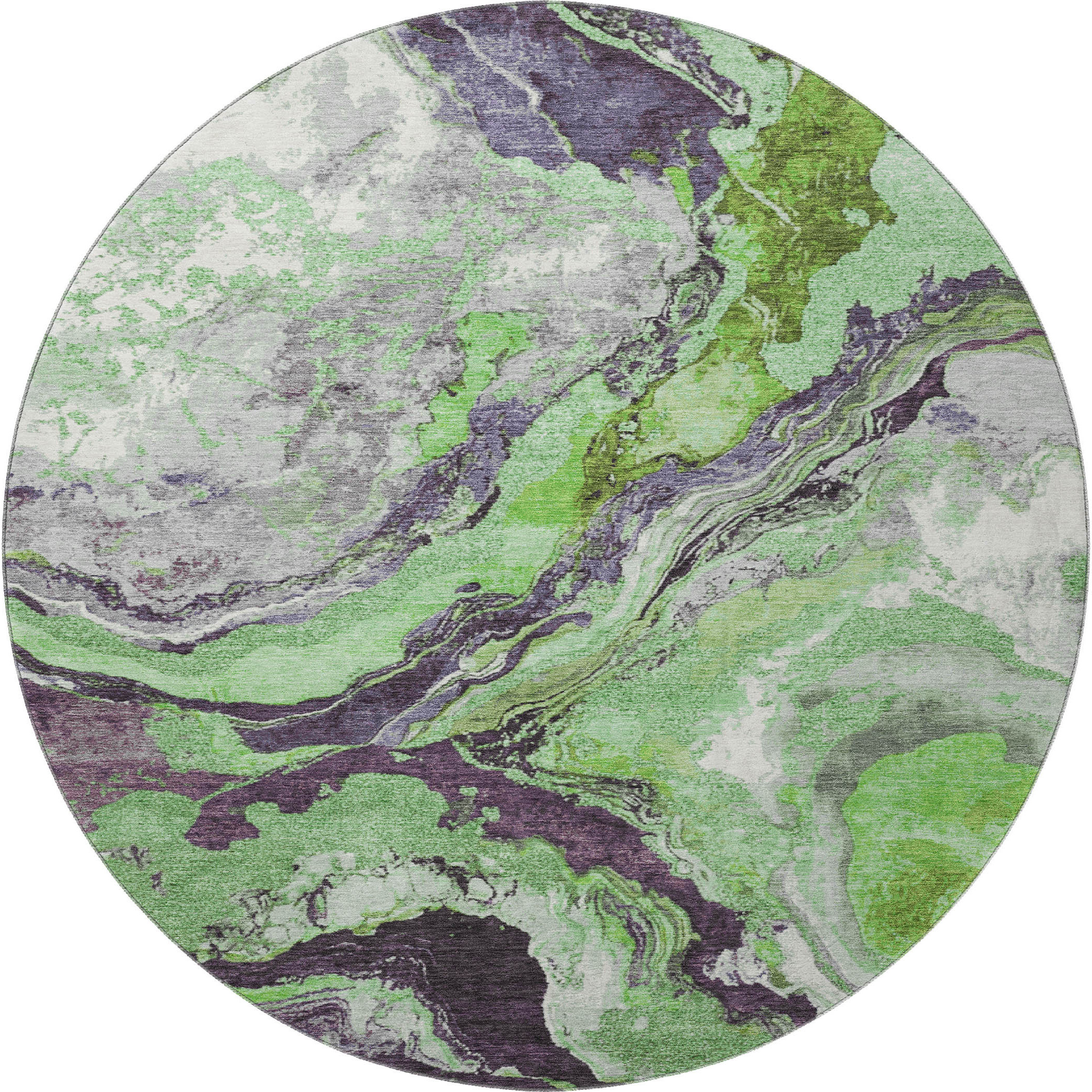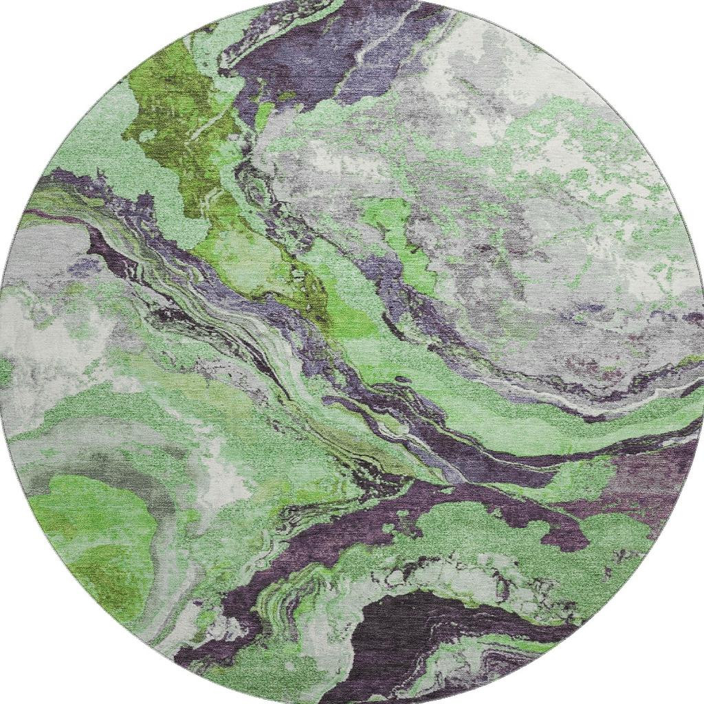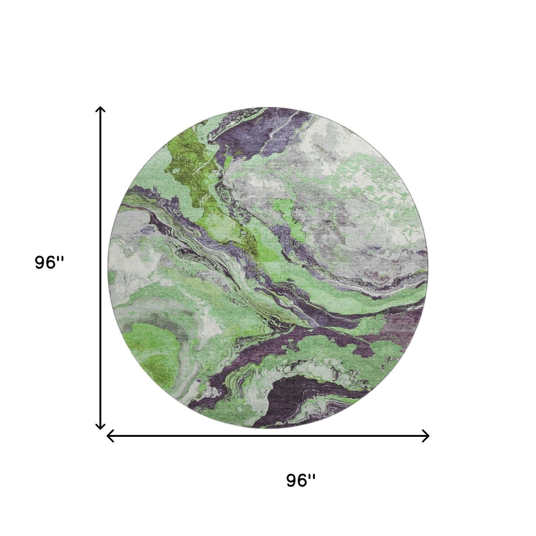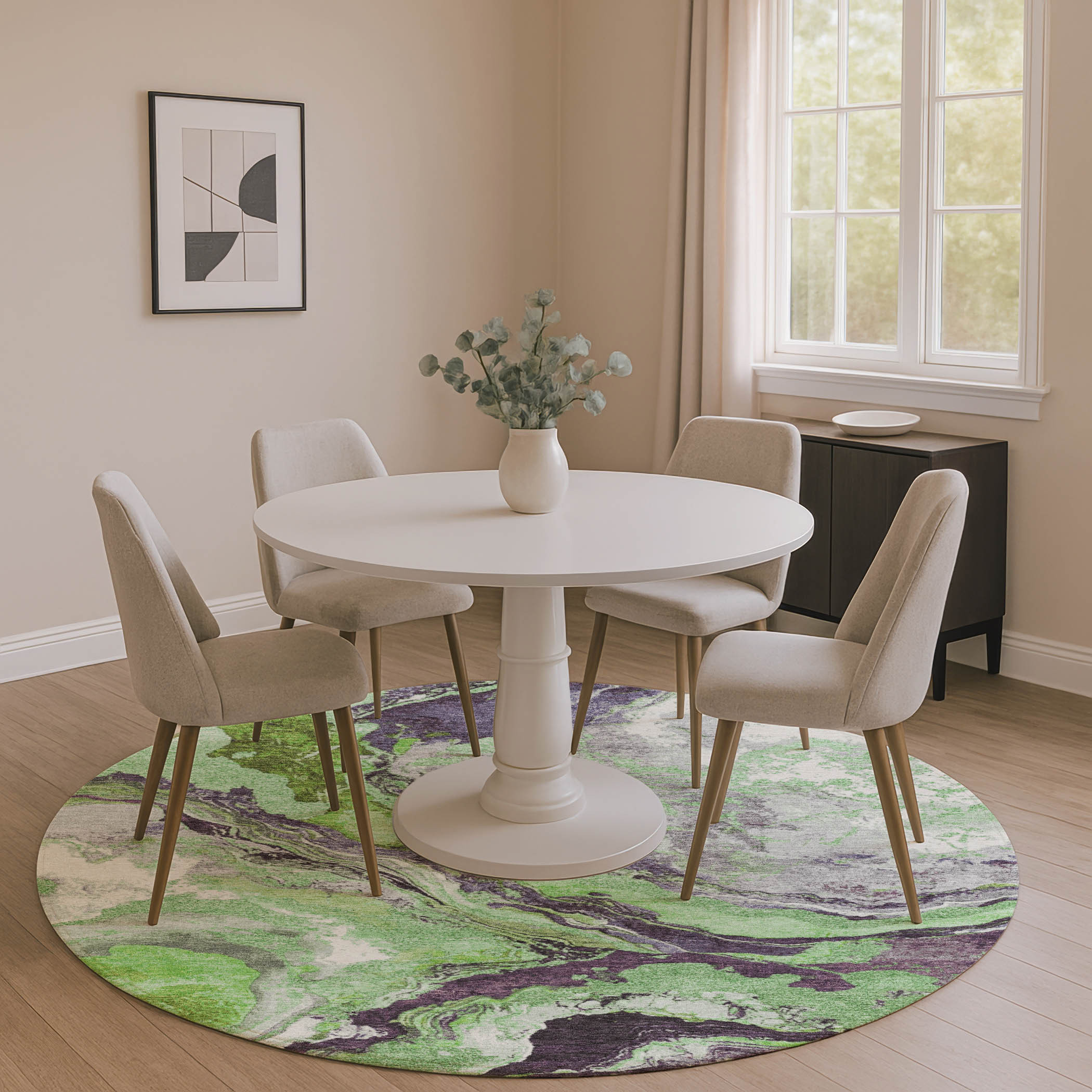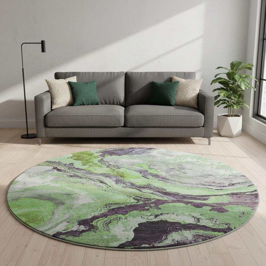 Add some artistry to your room with this 8-foot green lavender and ivory abstract washable round rug with uv protection. Ideal for spaces with kids and pets, this rug is stain resistant to help repel dirt and spilled liquids. Built to last, this rug crafted from polyester fibers is known for its durability and long lasting appeal. Rugs are a great way to showcase your style, hide imperfections, warm your home and reduce noise. This larger sized, transitional styled rug is ready to create a focal point or statement piece in your room. 96.00-inch h x 96.00-inch w x 0.39-inch d.