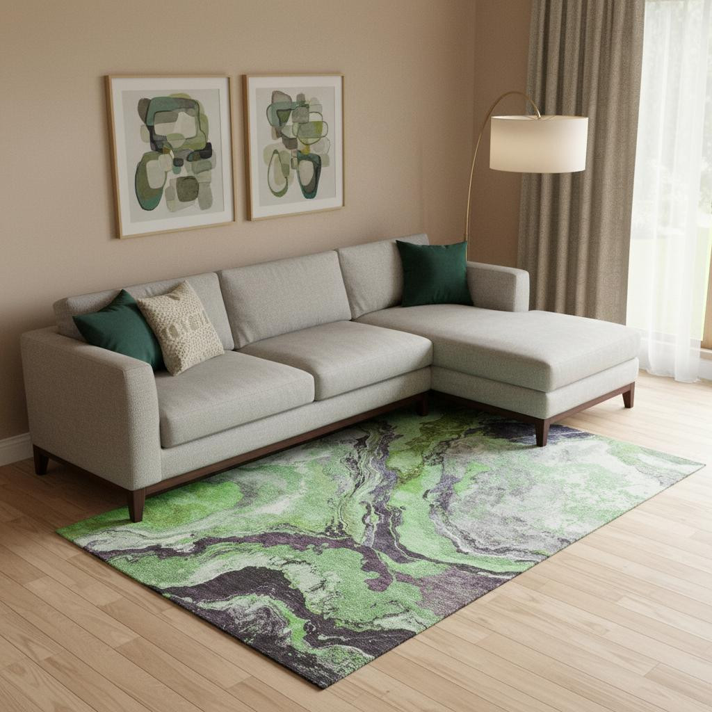 This 10-foot x 14-foot green lavender and ivory abstract washable area rug with uv protection, is a great way to add warmth to a room. Ideal for spaces with kids and pets, this rug is stain resistant to help repel dirt and spilled liquids. Built to last, this rug crafted from polyester fibers is known for its durability and long lasting appeal. Rugs are a great way to showcase your style, hide imperfections, warm your home and reduce noise. This larger sized, transitional styled rug is ready to create a focal point or statement piece in your room. 120.00-inch h x 168.00-inch w x 0.39-inch d.