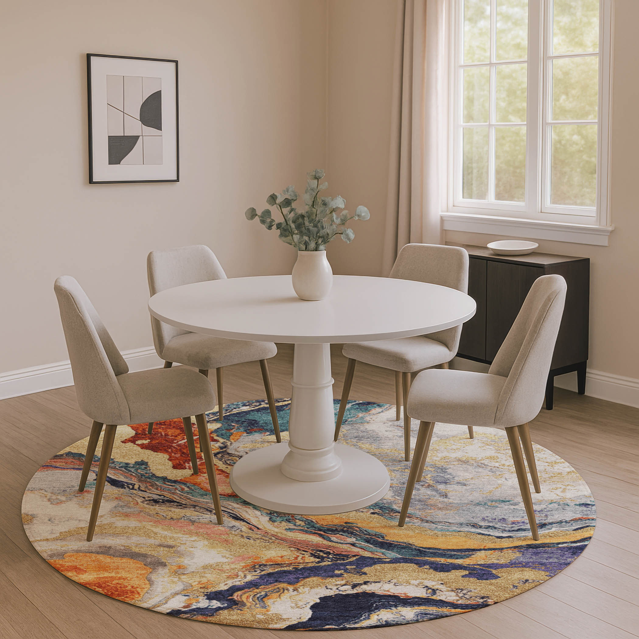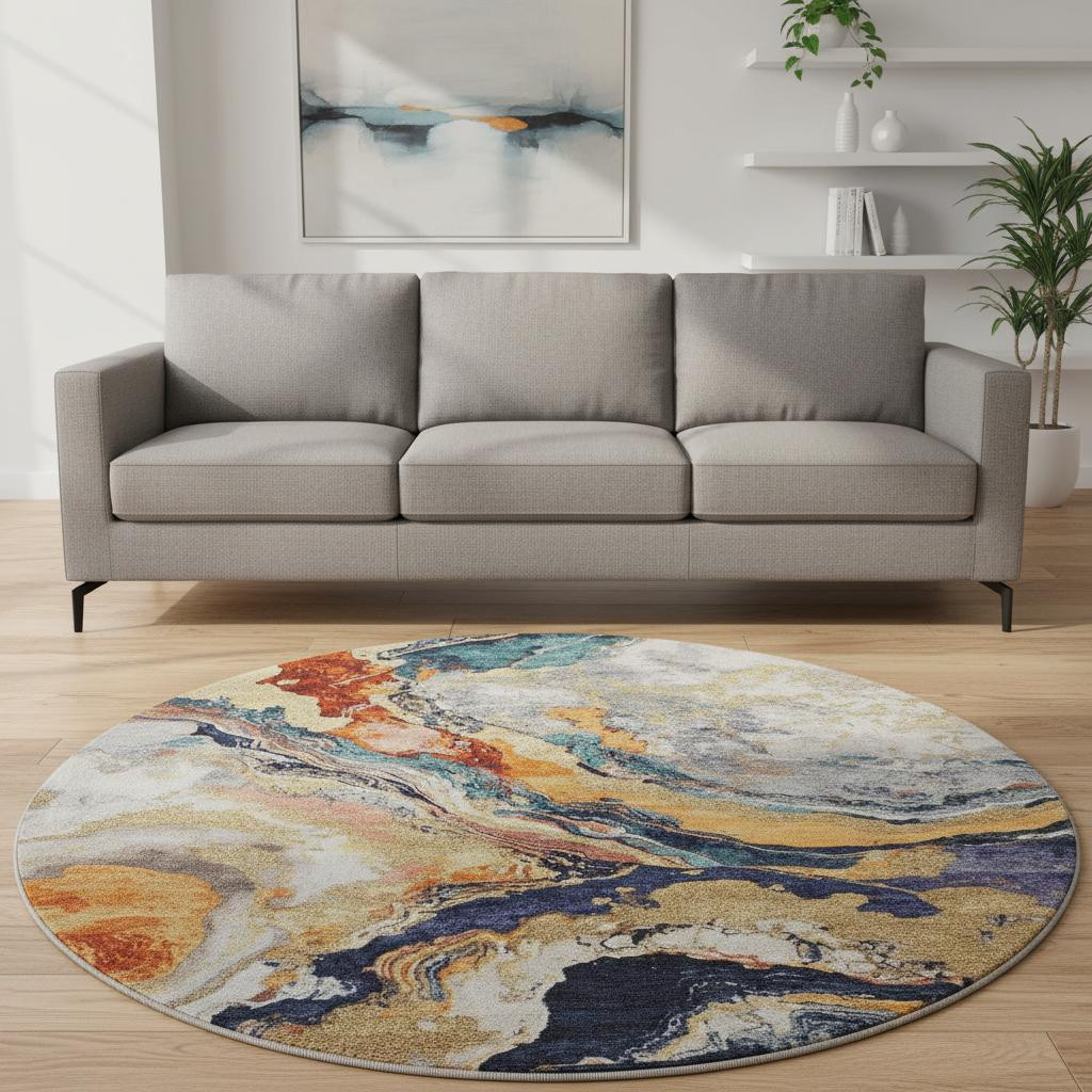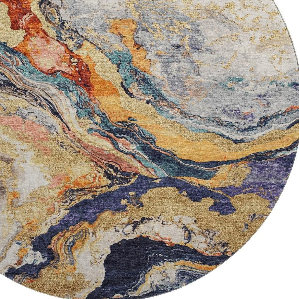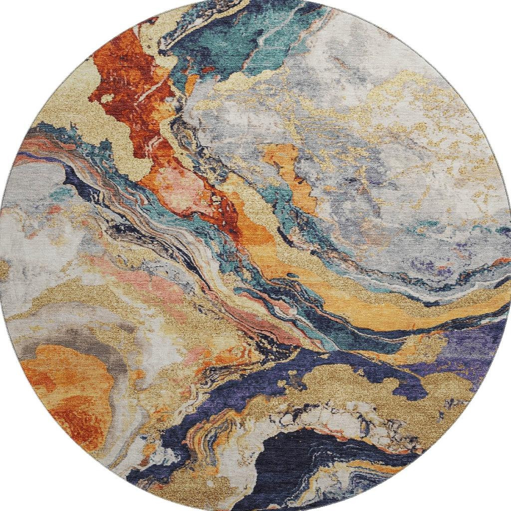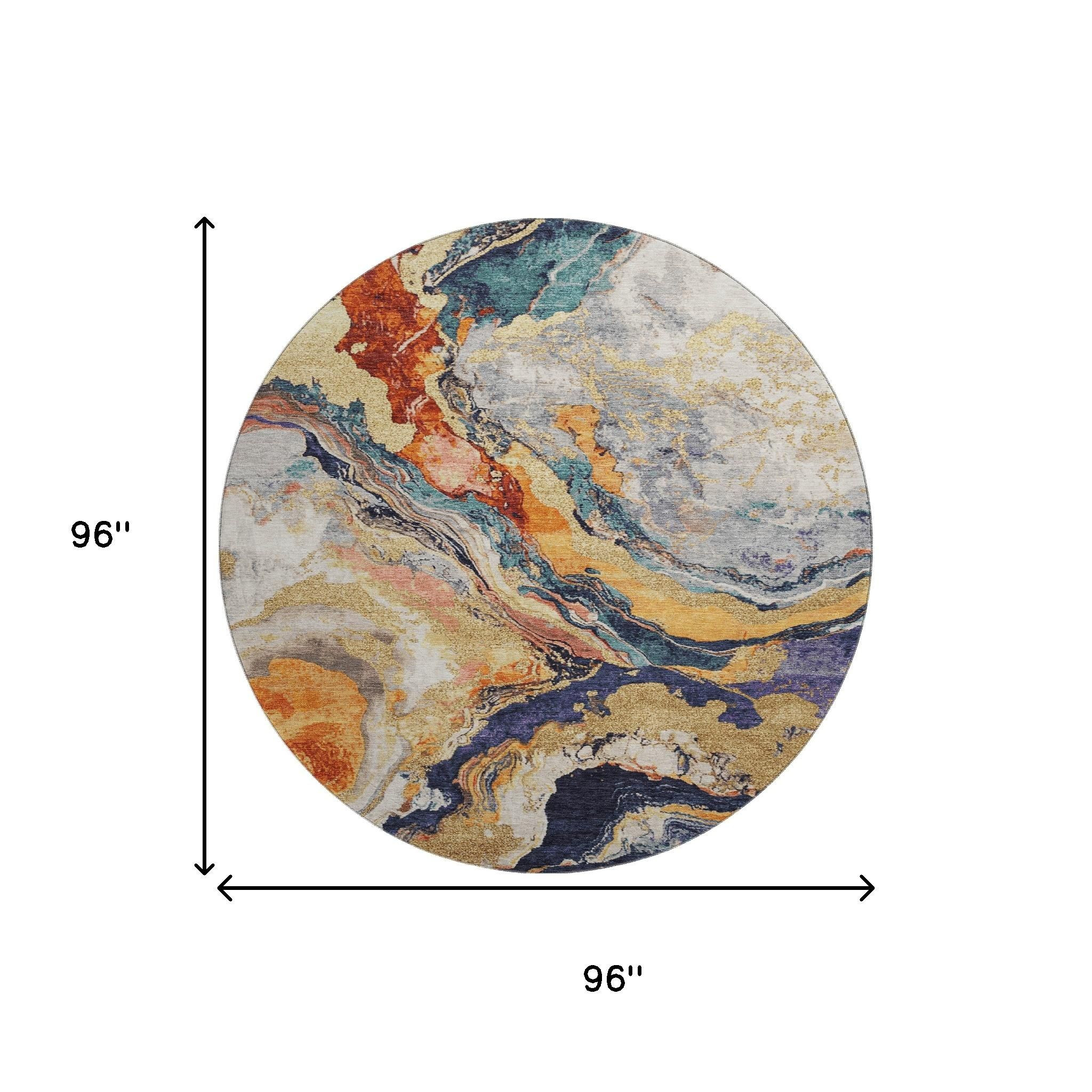 This 8-foot linen purple and ivory abstract washable round rug with uv protection, is a great way to add warmth to a room. Ideal for spaces with kids and pets, this rug is stain resistant to help repel dirt and spilled liquids. Built to last, this rug crafted from polyester fibers is known for its durability and long lasting appeal. Rugs are a great way to showcase your style, hide imperfections, warm your home and reduce noise. This larger sized, transitional styled rug is ready to create a focal point or statement piece in your room. 96.00-inch h x 96.00-inch w x 0.39-inch d.