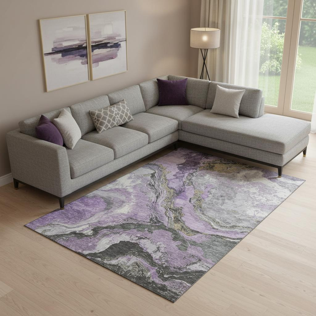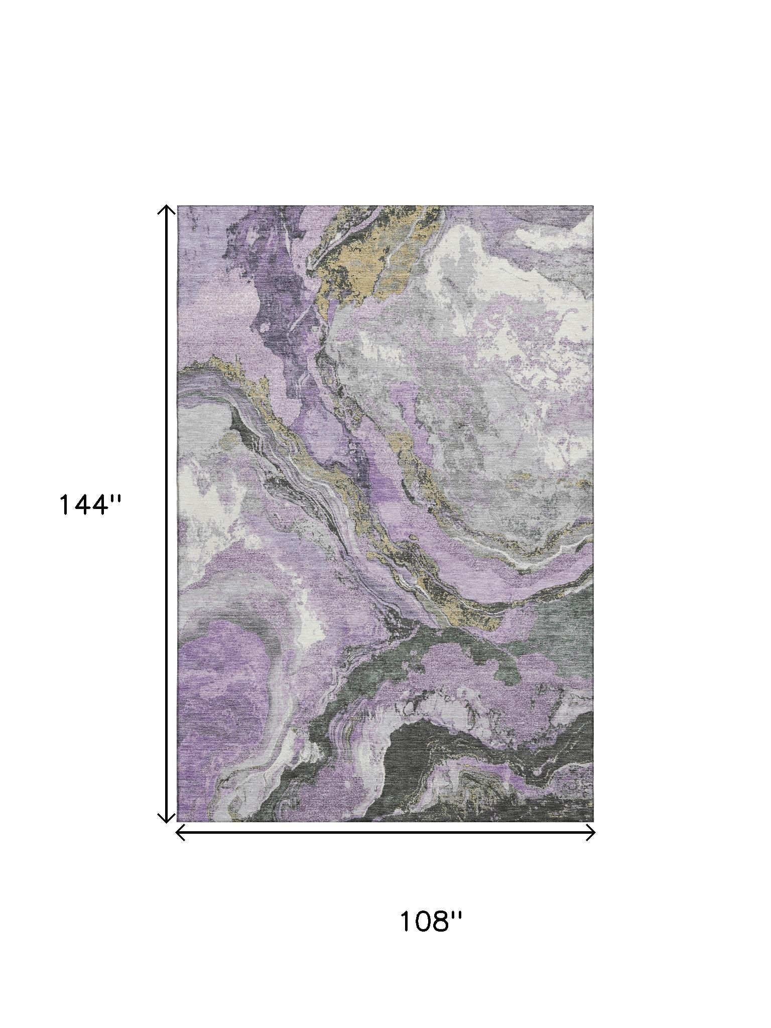 Add some artistry to your room with this 9-foot x 12-foot lavender gray and ivory abstract washable area rug with uv protection. Ideal for spaces with kids and pets, this rug is stain resistant to help repel dirt and spilled liquids. Built to last, this rug crafted from polyester fibers is known for its durability and long lasting appeal. Rugs are a great way to showcase your style, hide imperfections, warm your home and reduce noise. This larger sized, transitional styled rug is ready to create a focal point or statement piece in your room. 108.00-inch h x 144.00-inch w x 0.39-inch d.
