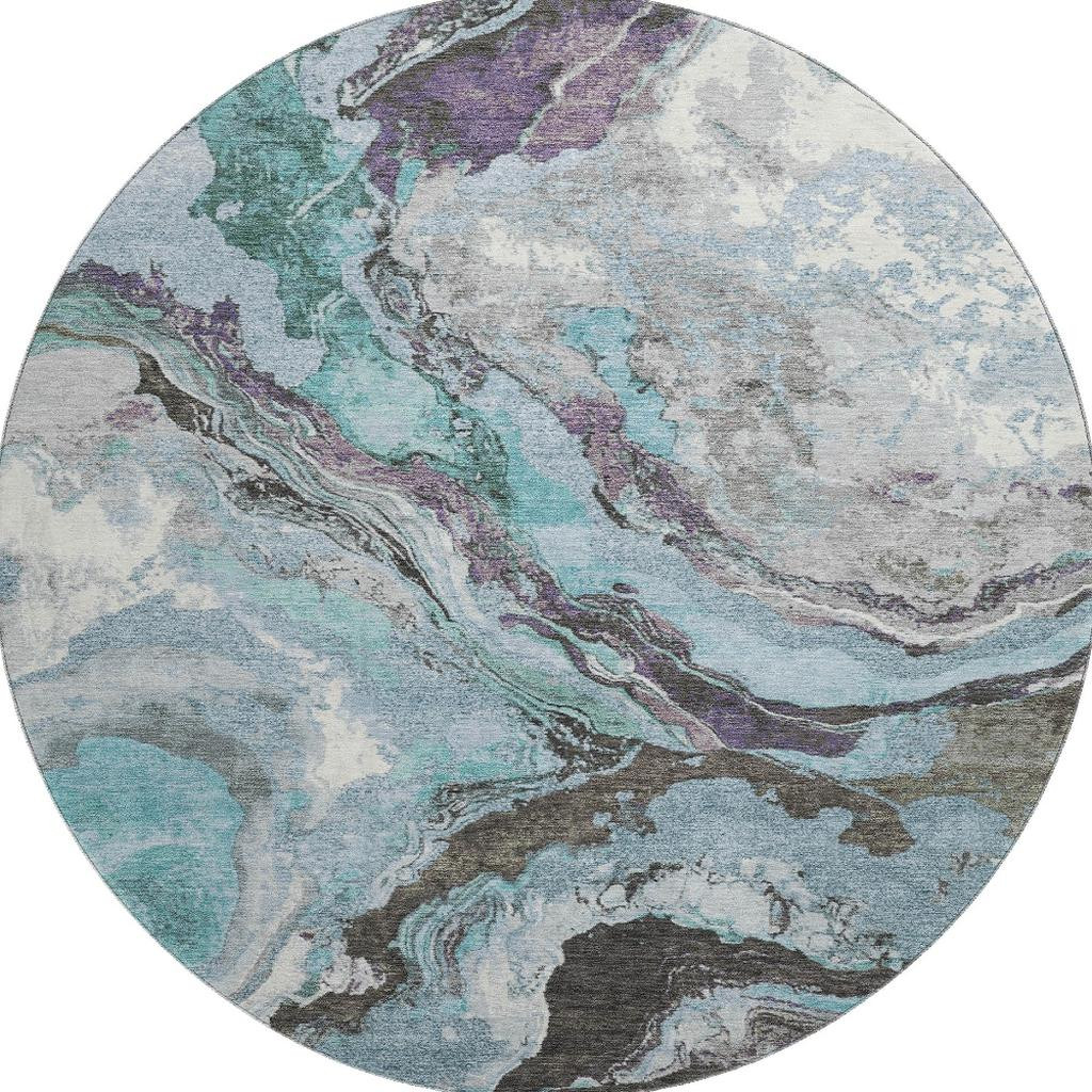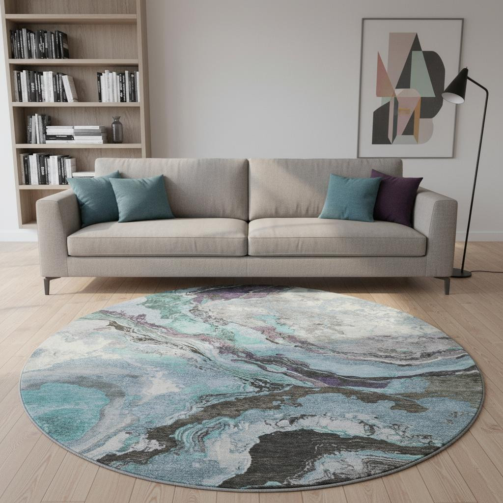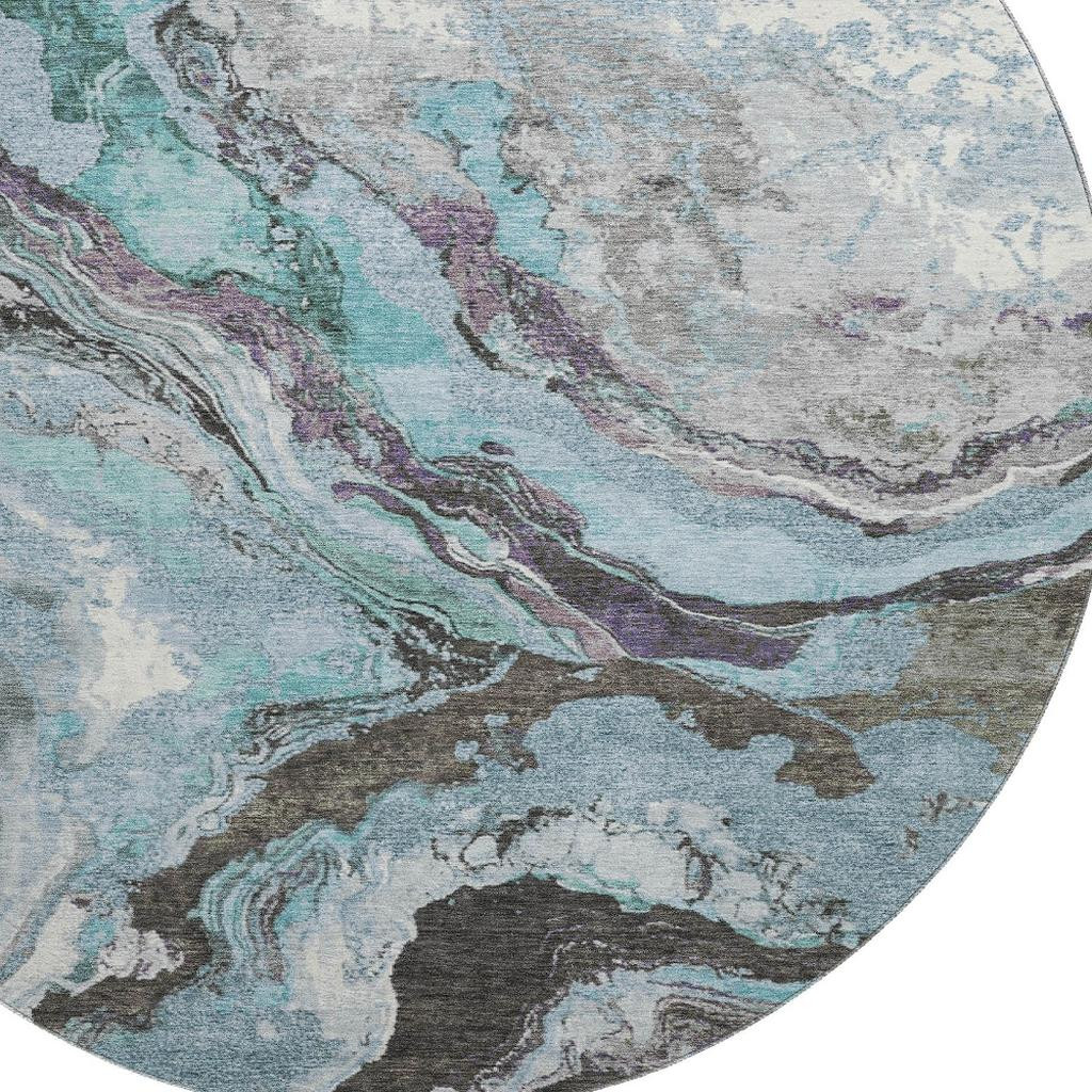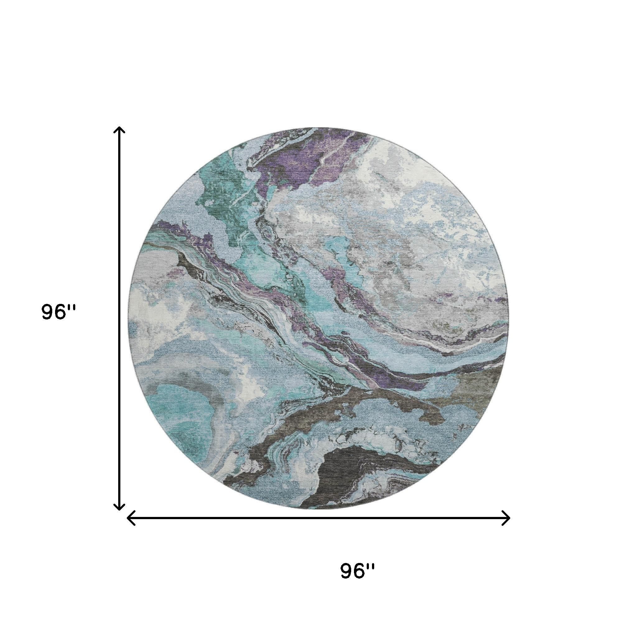 This 8-foot teal gray and ivory abstract washable round rug with uv protection, is a great way to add warmth to a room. Ideal for spaces with kids and pets, this rug is stain resistant to help repel dirt and spilled liquids. Built to last, this rug crafted from polyester fibers is known for its durability and long lasting appeal. Rugs are a great way to showcase your style, hide imperfections, warm your home and reduce noise. This larger sized, transitional styled rug is ready to create a focal point or statement piece in your room. 96.00-inch h x 96.00-inch w x 0.39-inch d.