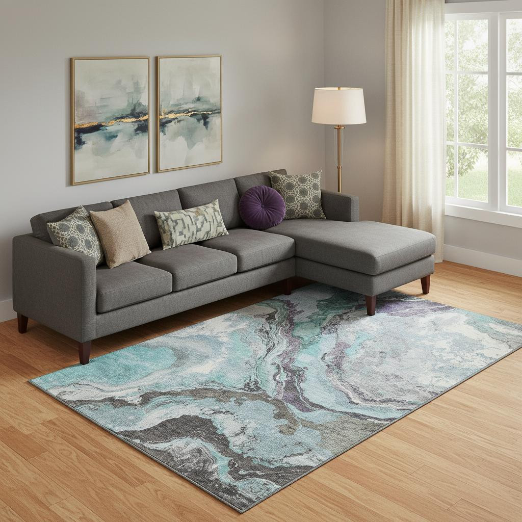 Set an inviting tone in your space with this 9-foot x 12-foot teal gray and ivory abstract washable area rug with uv protection. Ideal for spaces with kids and pets, this rug is stain resistant to help repel dirt and spilled liquids. Built to last, this rug crafted from polyester fibers is known for its durability and long lasting appeal. Rugs are a great way to showcase your style, hide imperfections, warm your home and reduce noise. This larger sized, transitional styled rug is ready to create a focal point or statement piece in your room. 108.00-inch h x 144.00-inch w x 0.39-inch d.