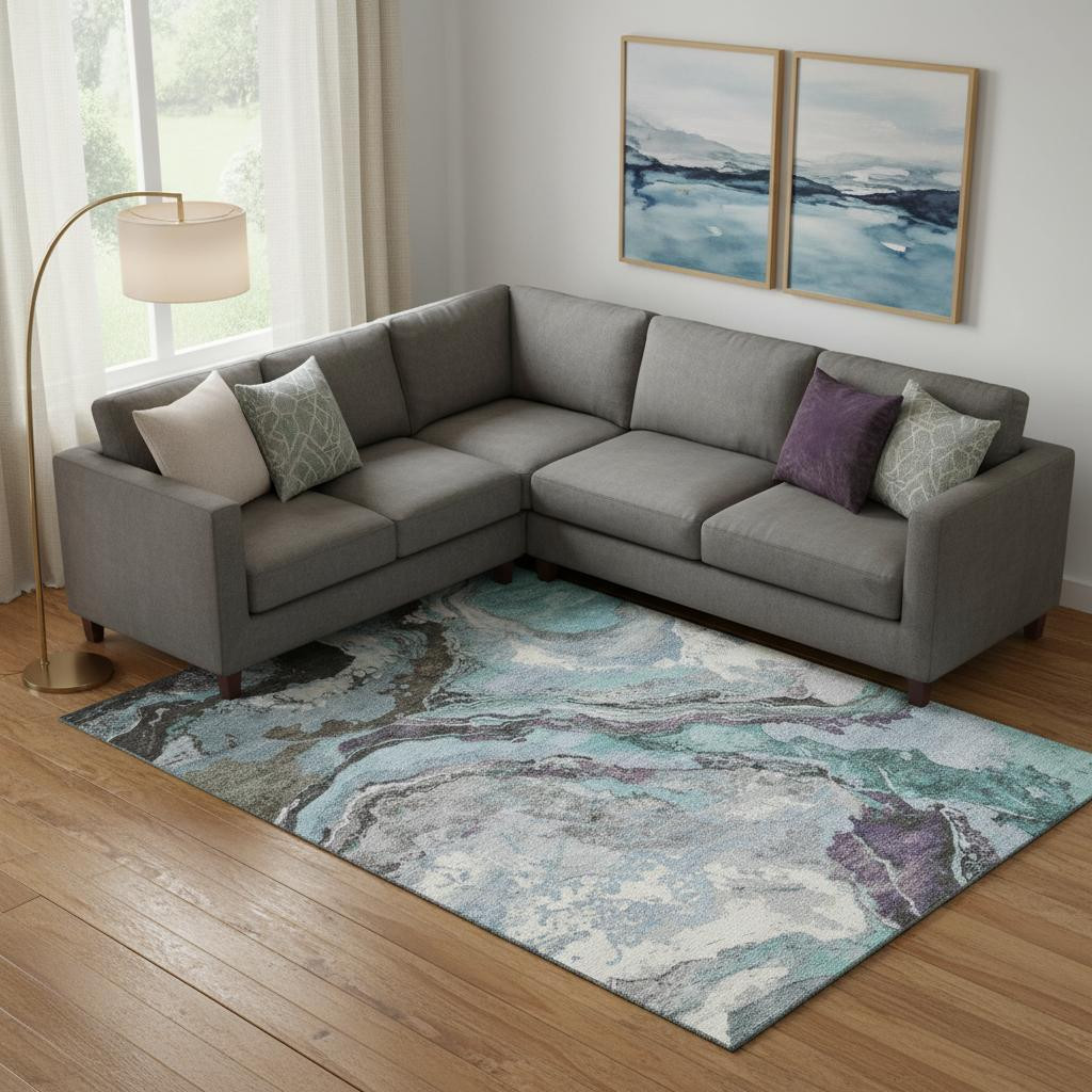 Add some artistry to your room with this 10-foot x 14-foot teal gray and ivory abstract washable area rug with uv protection. Ideal for spaces with kids and pets, this rug is stain resistant to help repel dirt and spilled liquids. Built to last, this rug crafted from polyester fibers is known for its durability and long lasting appeal. Rugs are a great way to showcase your style, hide imperfections, warm your home and reduce noise. This larger sized, transitional styled rug is ready to create a focal point or statement piece in your room. 120.00-inch h x 168.00-inch w x 0.39-inch d.