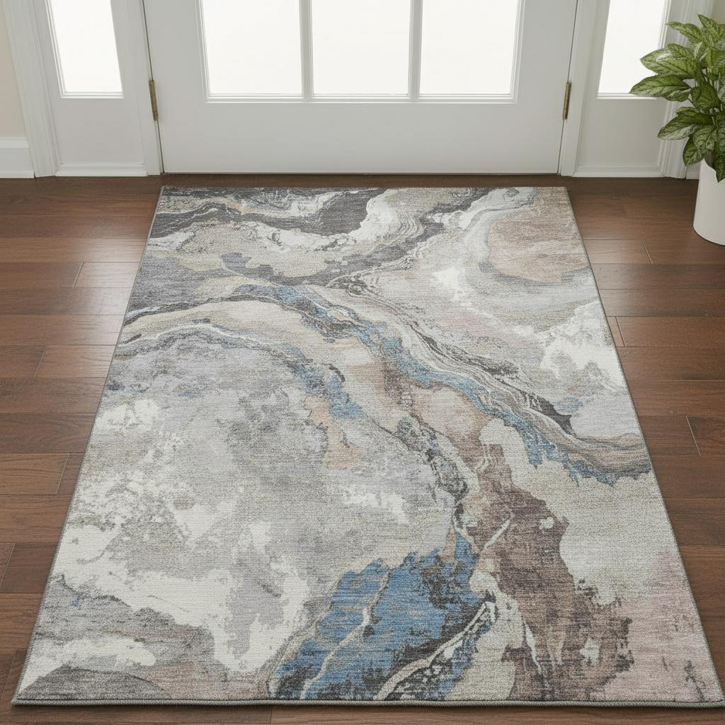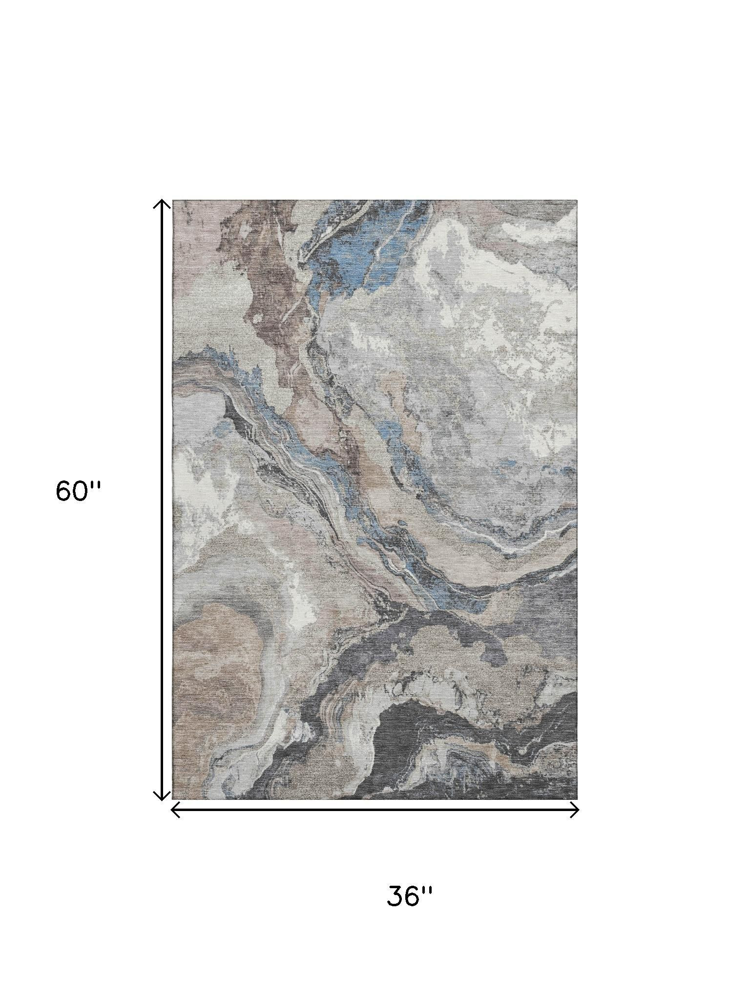 This 3-foot x 5-foot taupe blue and ivory abstract washable area rug with uv protection, is a great way to add warmth to a room. Ideal for spaces with kids and pets, this rug is stain resistant to help repel dirt and spilled liquids. Built to last, this rug crafted from polyester fibers is known for its durability and long lasting appeal. Rugs are a great way to showcase your style, hide imperfections, warm your home and reduce noise. This smaller sized, transitional styled rug is just what you need for your walkway, bedside, in front of door, cabinet, refrigerator, or chair. 36.00-inch h x 60.00-inch w x 0.39-inch d.