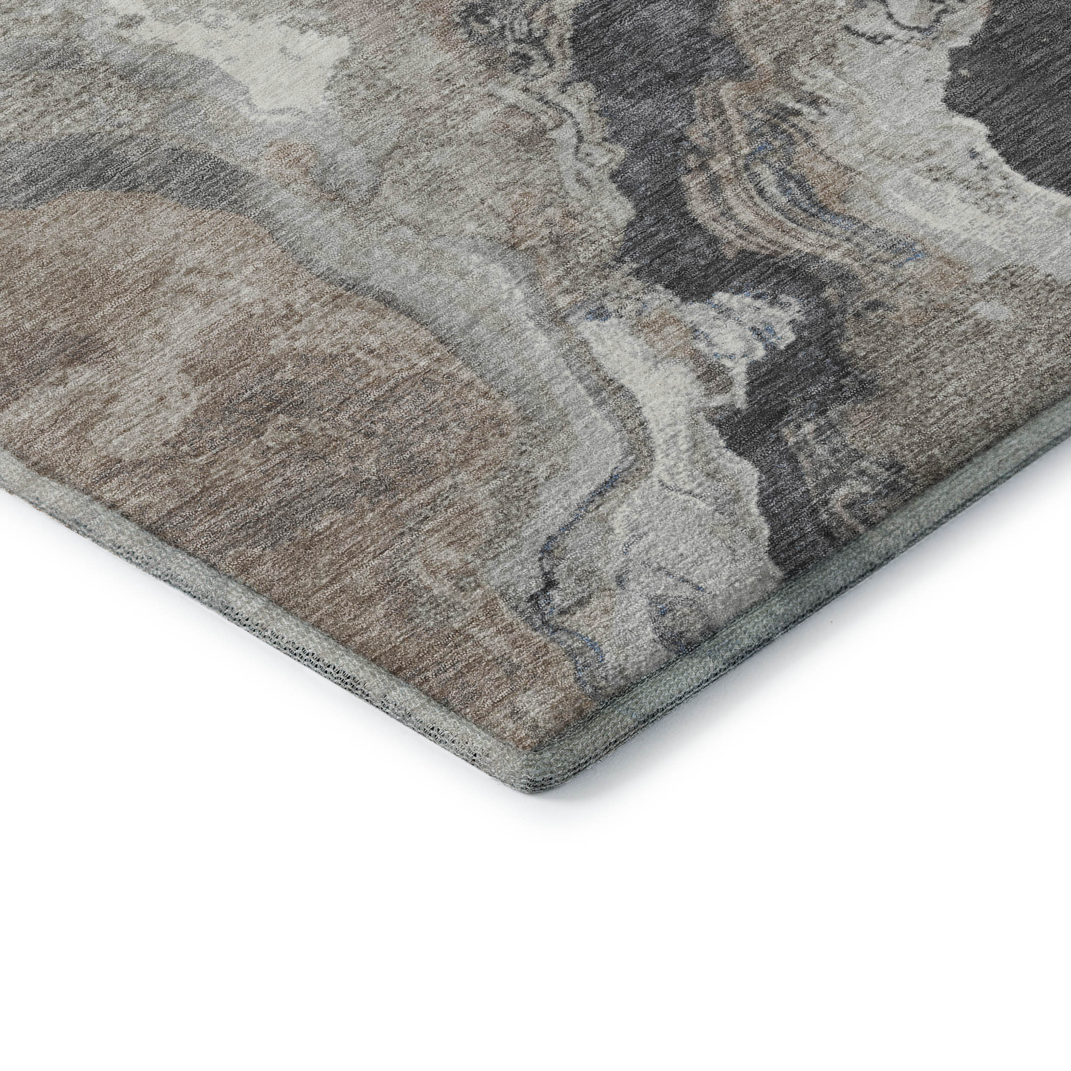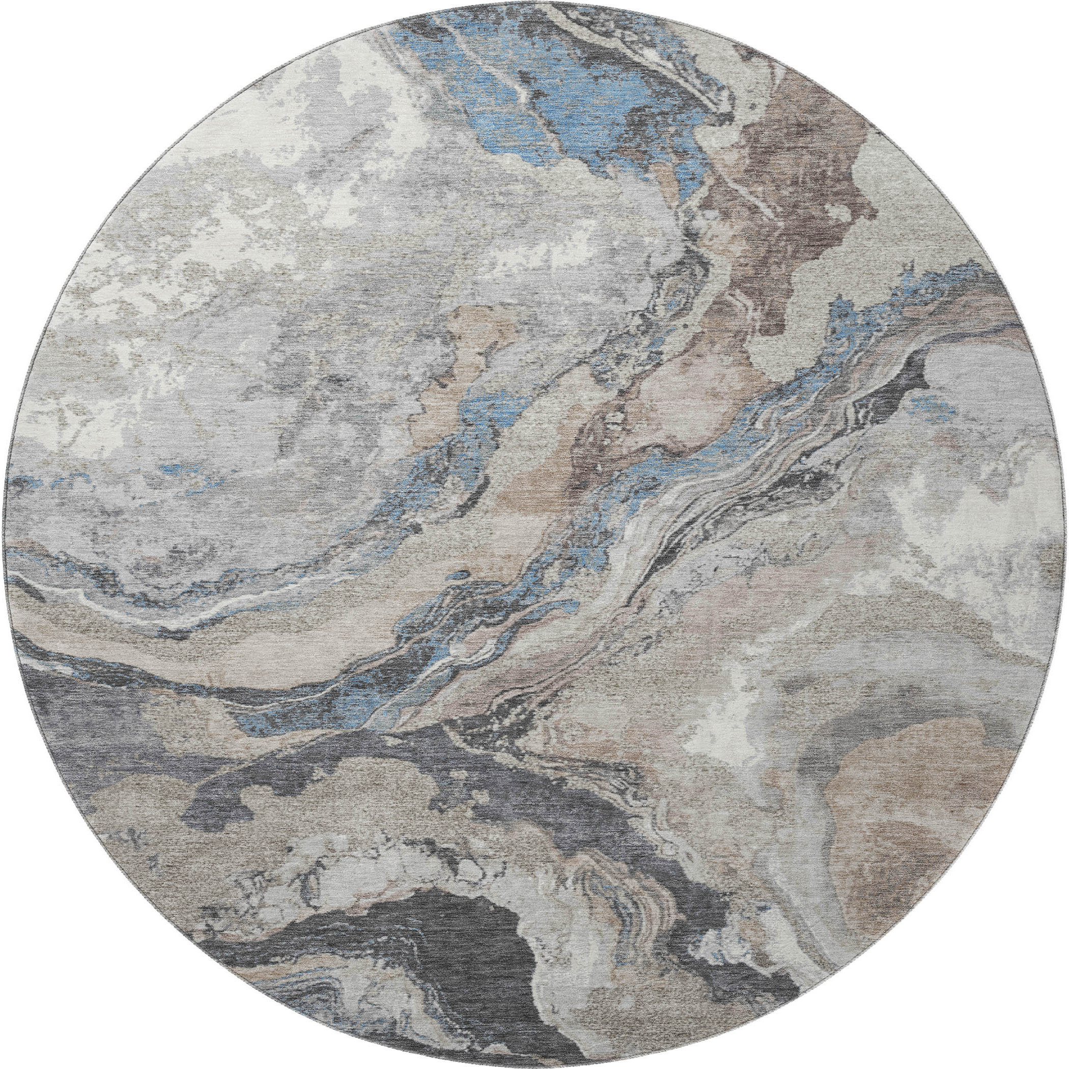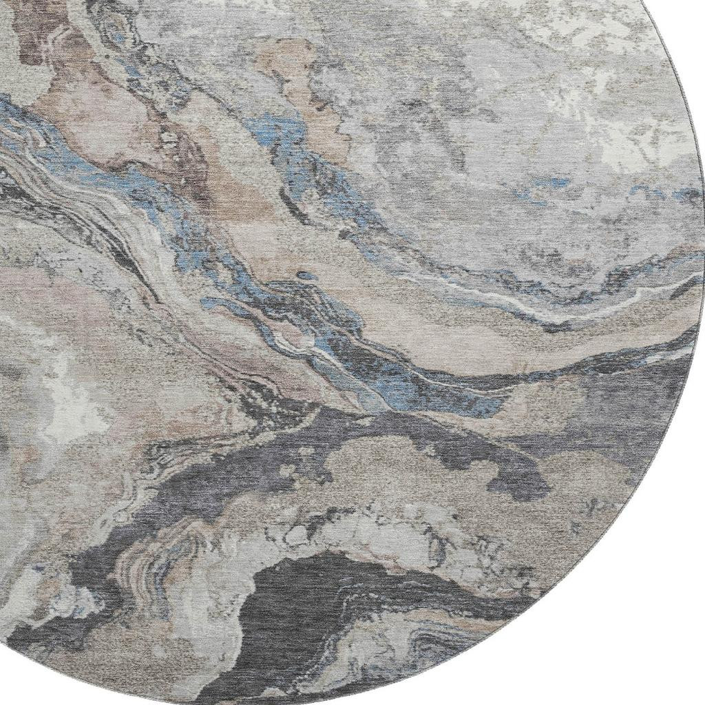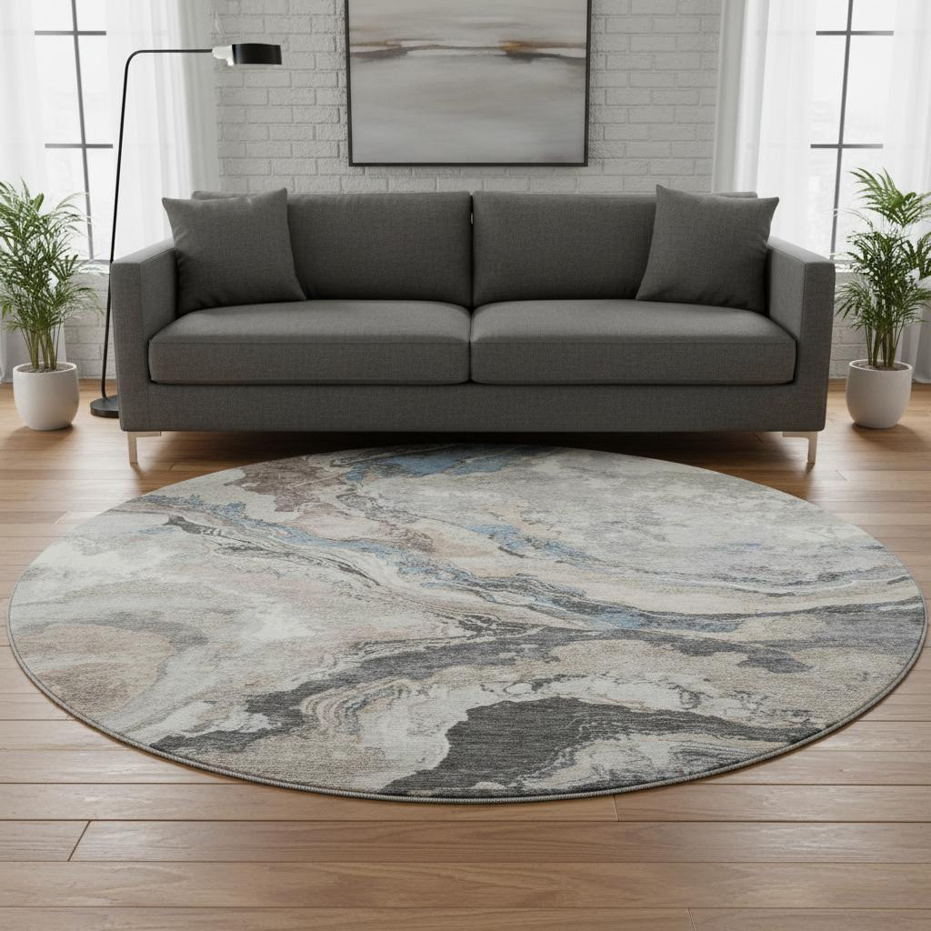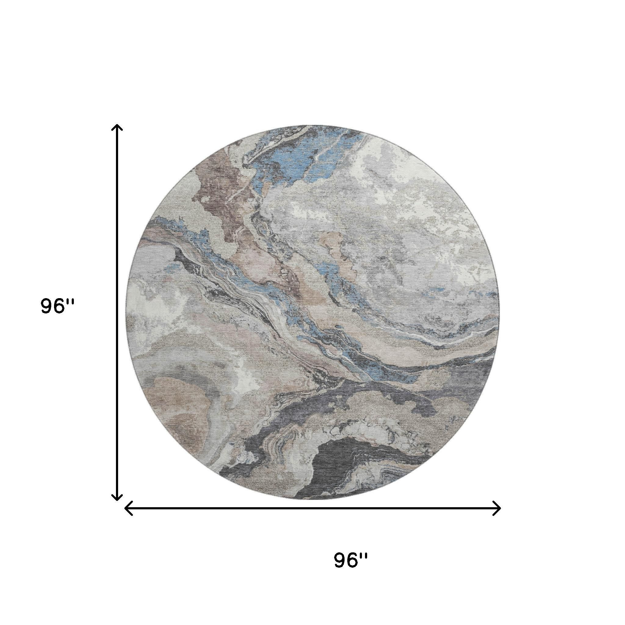 This 8-foot taupe blue and ivory abstract washable round rug with uv protection, is a great way to add warmth to a room. Ideal for spaces with kids and pets, this rug is stain resistant to help repel dirt and spilled liquids. Built to last, this rug crafted from polyester fibers is known for its durability and long lasting appeal. Rugs are a great way to showcase your style, hide imperfections, warm your home and reduce noise. This larger sized, transitional styled rug is ready to create a focal point or statement piece in your room. 96.00-inch h x 96.00-inch w x 0.39-inch d.