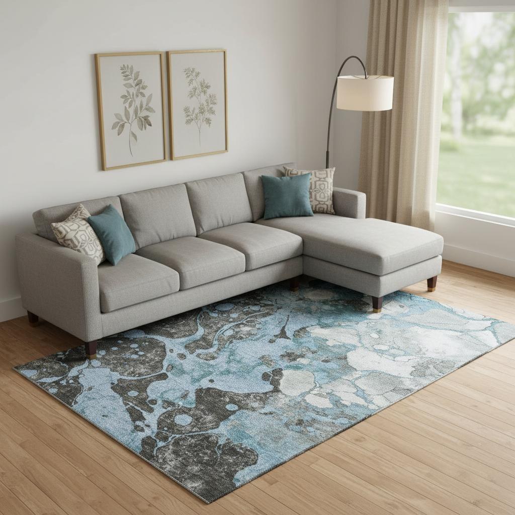 Add some artistry to your room with this 9-foot x 12-foot blue gray and ivory abstract washable area rug with uv protection. Ideal for spaces with kids and pets, this rug is stain resistant to help repel dirt and spilled liquids. Built to last, this rug crafted from polyester fibers is known for its durability and long lasting appeal. Rugs are a great way to showcase your style, hide imperfections, warm your home and reduce noise. This larger sized, transitional styled rug is ready to create a focal point or statement piece in your room. 108.00-inch h x 144.00-inch w x 0.39-inch d.