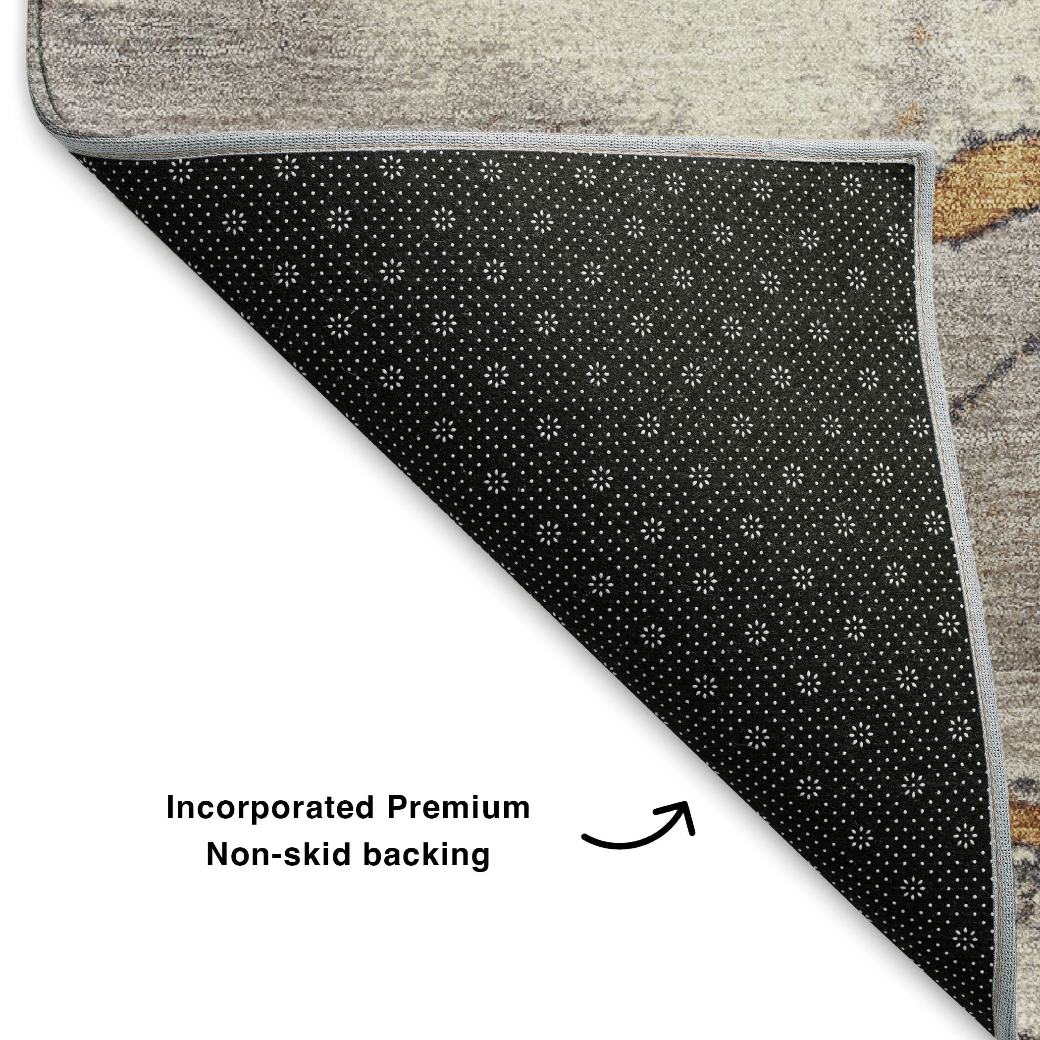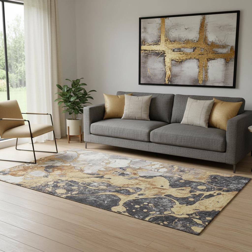 This 5-foot x 8-foot gold gray and ivory abstract washable area rug with uv protection, is a great way to add warmth to a room. Ideal for spaces with kids and pets, this rug is stain resistant to help repel dirt and spilled liquids. Built to last, this rug crafted from polyester fibers is known for its durability and long lasting appeal. Rugs are a great way to showcase your style, hide imperfections, warm your home and reduce noise. This larger sized, transitional styled rug is ready to create a focal point or statement piece in your room. 60.00-inch h x 90.00-inch w x 0.39-inch d.