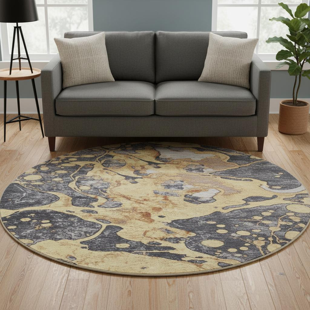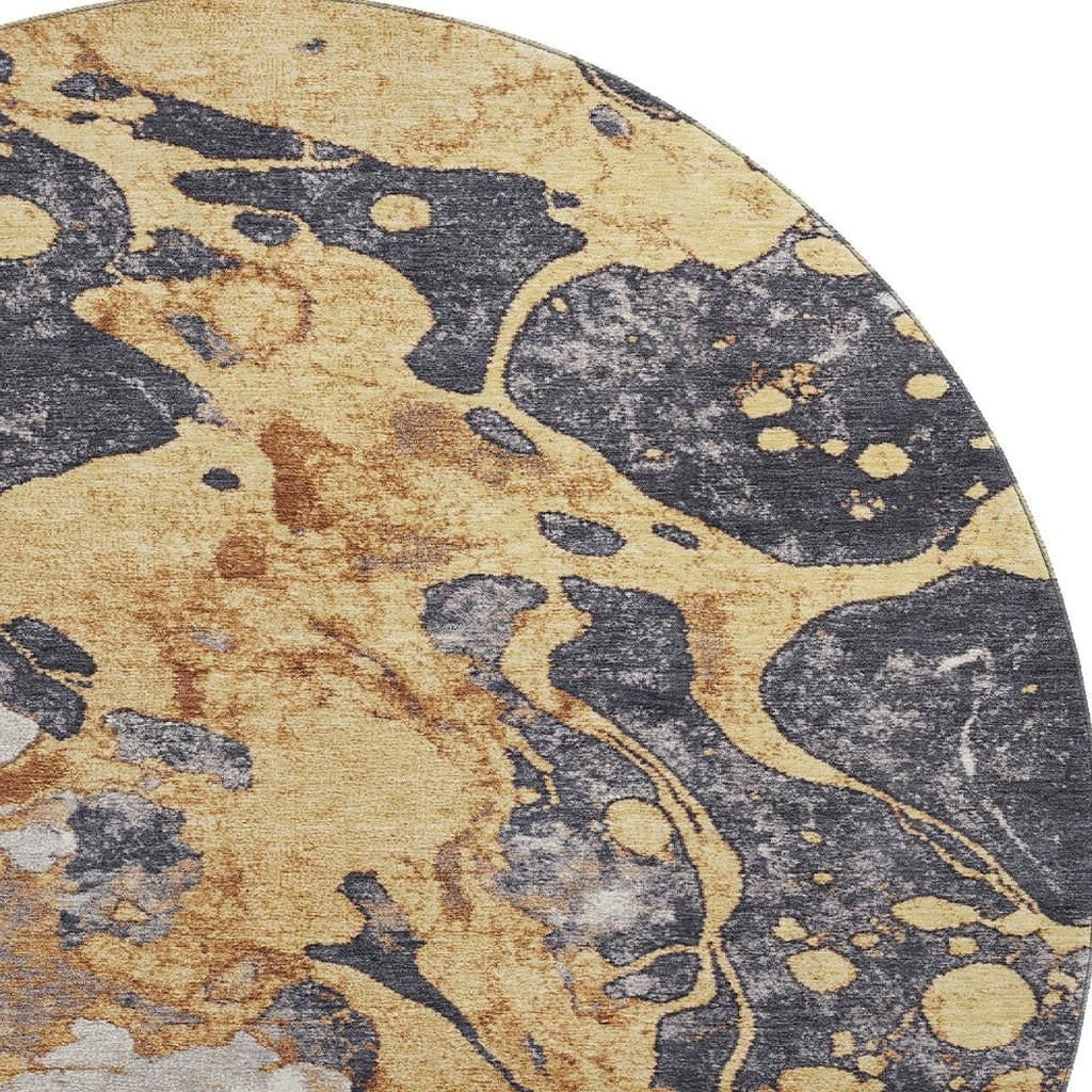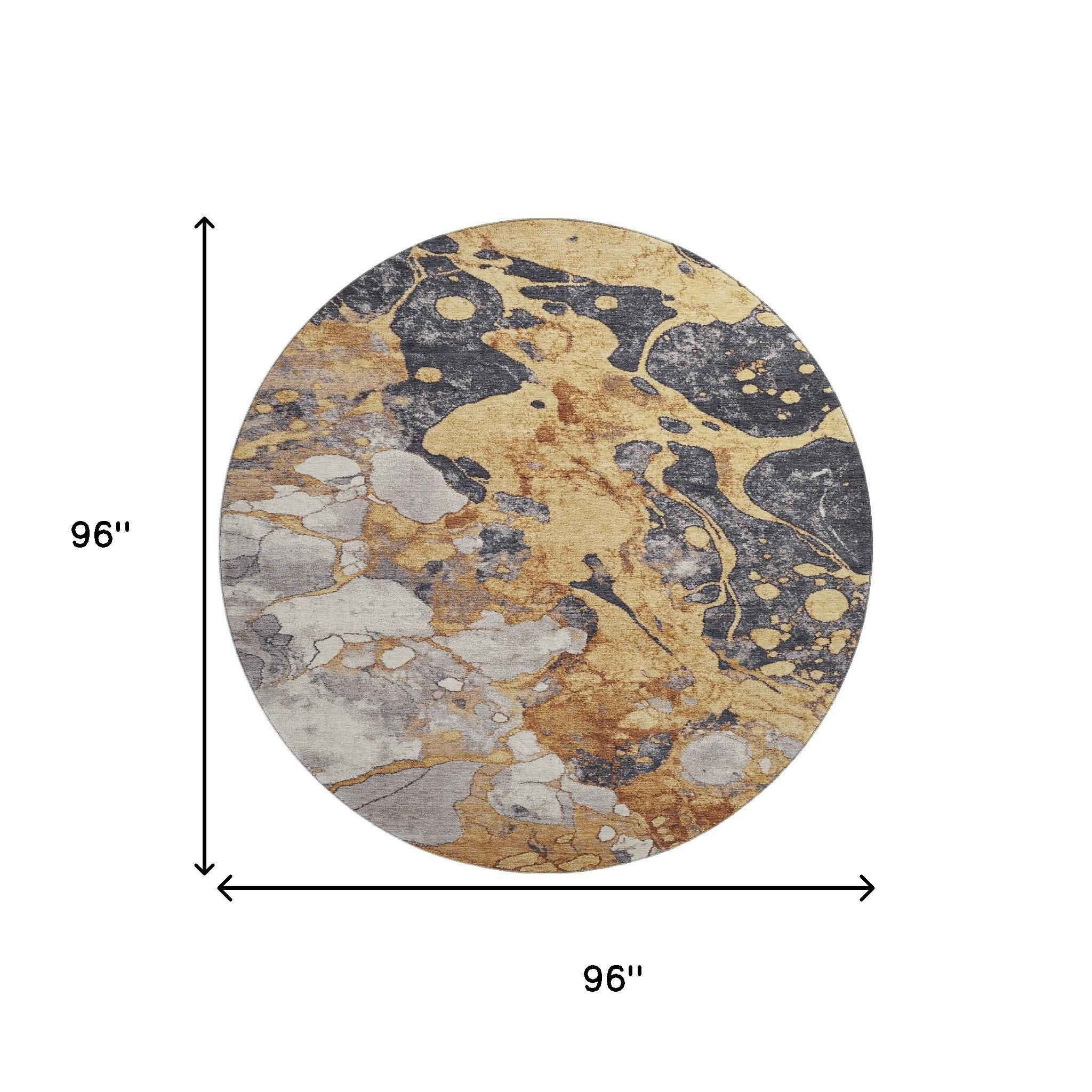 Set an inviting tone in your space with this 8-foot gold gray and ivory abstract washable round rug with uv protection. Ideal for spaces with kids and pets, this rug is stain resistant to help repel dirt and spilled liquids. Built to last, this rug crafted from polyester fibers is known for its durability and long lasting appeal. Rugs are a great way to showcase your style, hide imperfections, warm your home and reduce noise. This larger sized, transitional styled rug is ready to create a focal point or statement piece in your room. 96.00-inch h x 96.00-inch w x 0.39-inch d.
