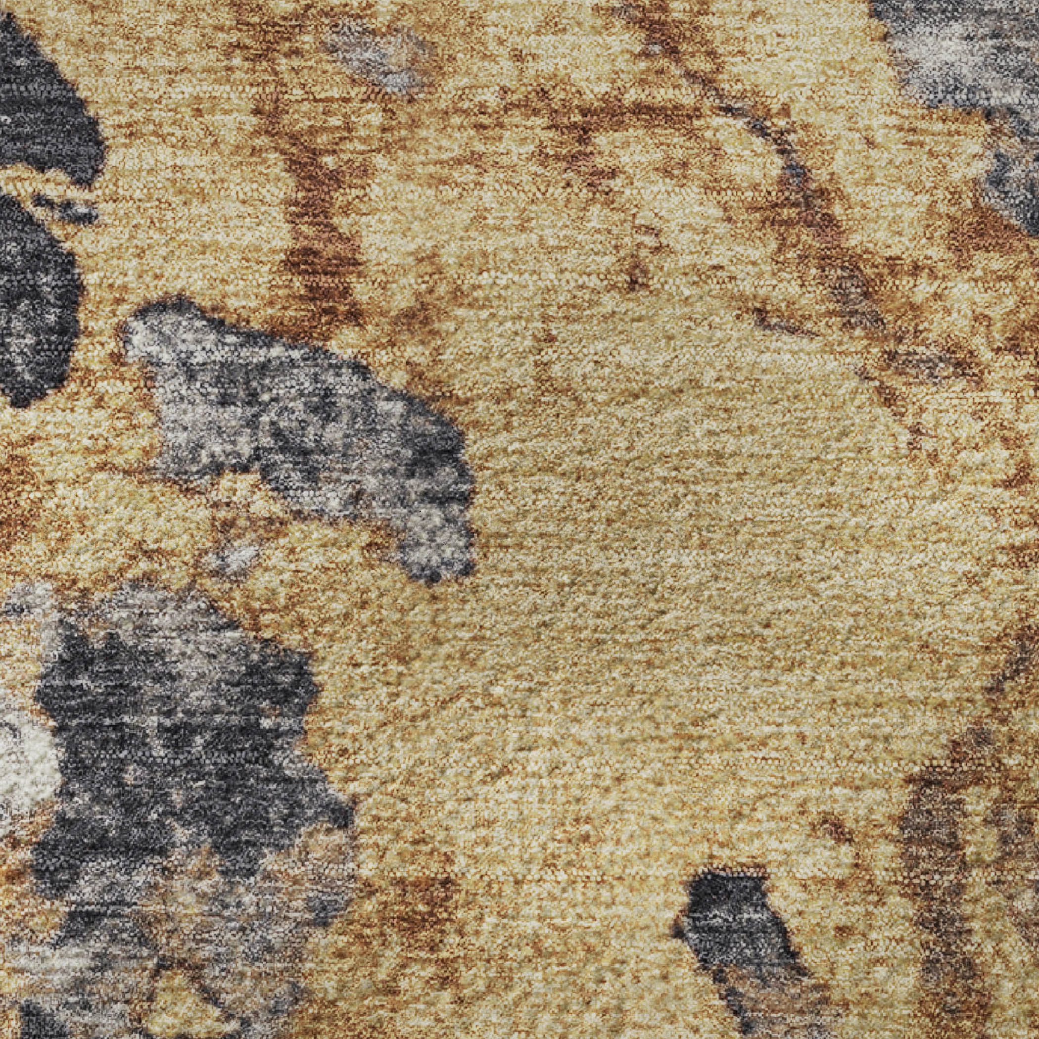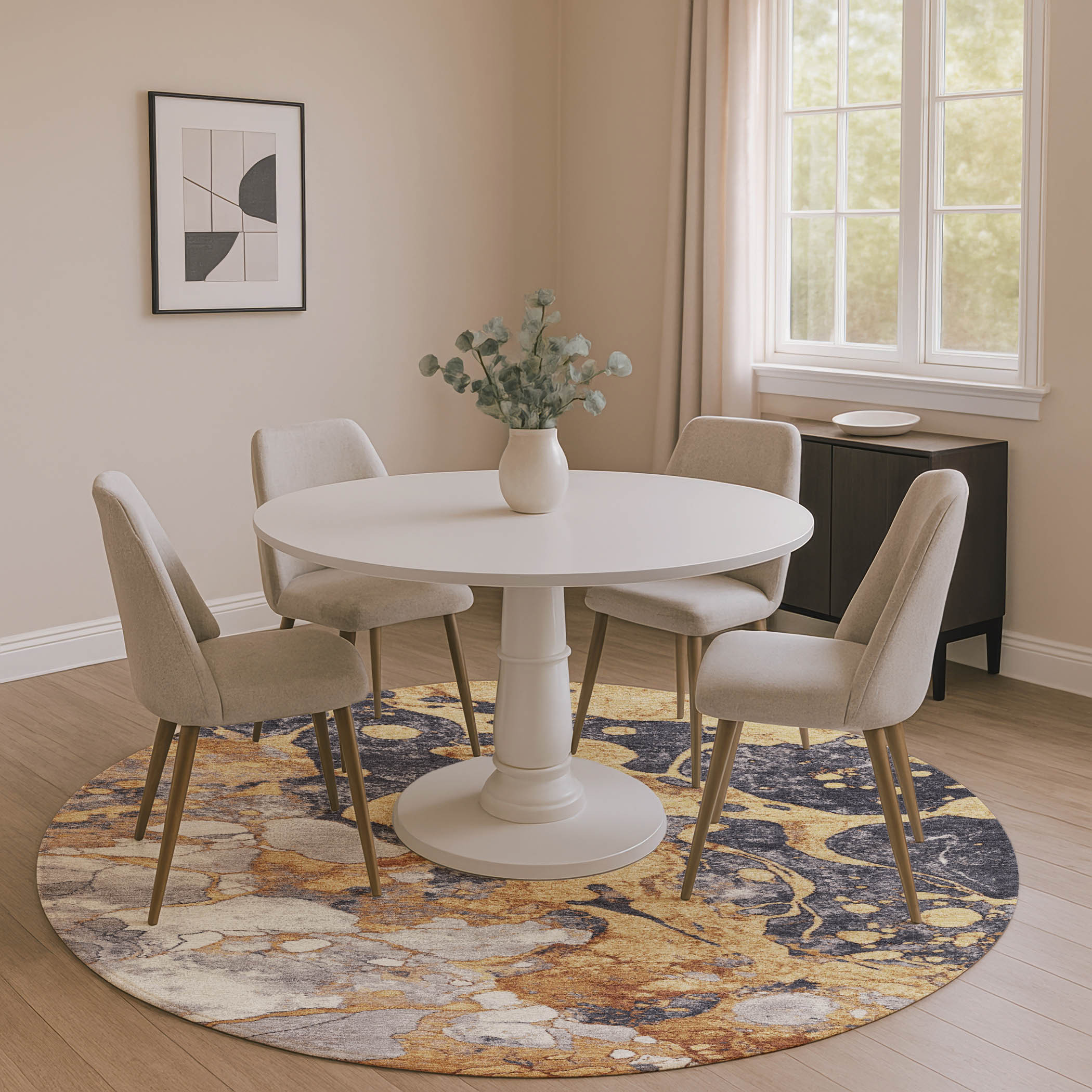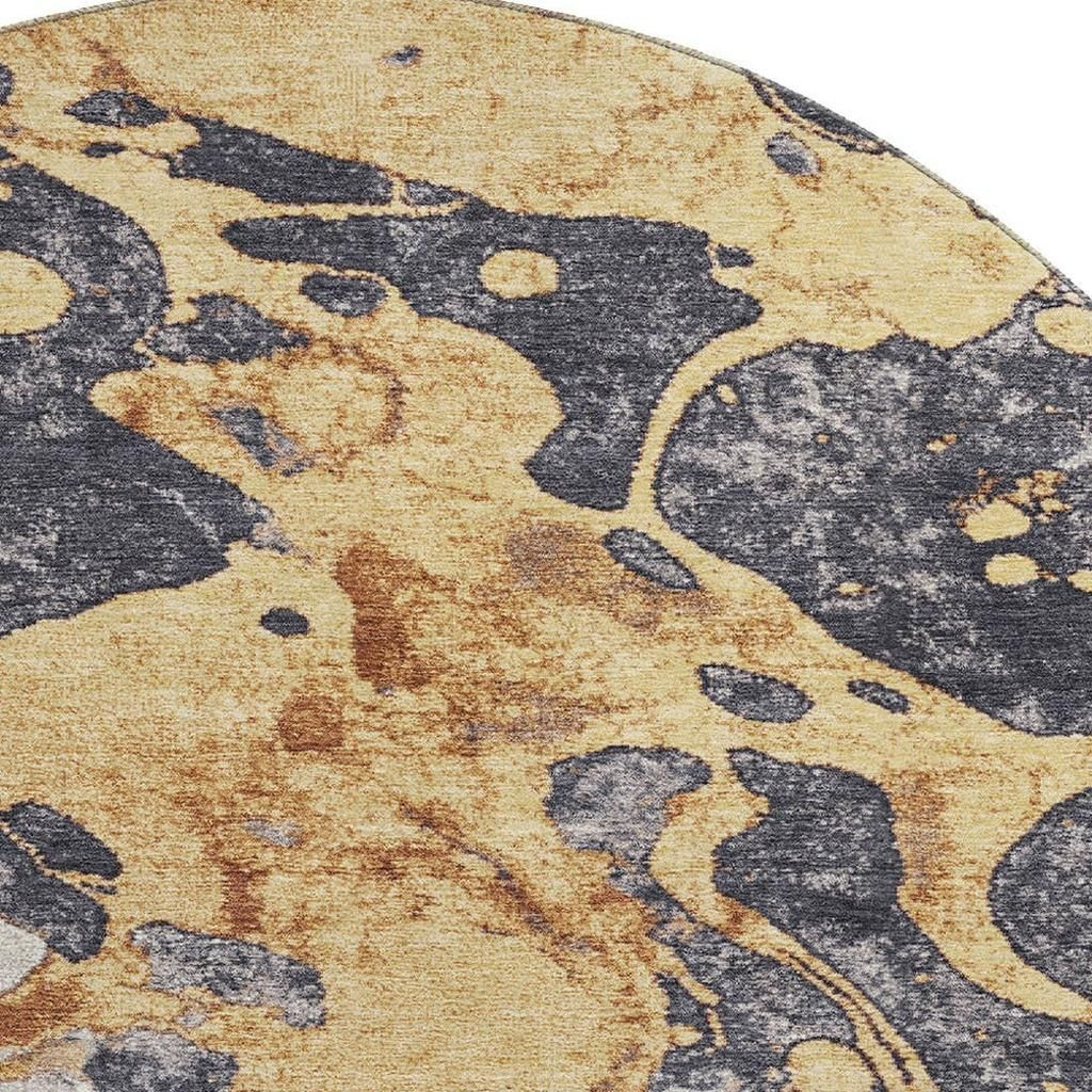 Set an inviting tone in your space with this 8-foot gold gray and ivory abstract washable round rug with uv protection. Ideal for spaces with kids and pets, this rug is stain resistant to help repel dirt and spilled liquids. Built to last, this rug crafted from polyester fibers is known for its durability and long lasting appeal. Rugs are a great way to showcase your style, hide imperfections, warm your home and reduce noise. This larger sized, transitional styled rug is ready to create a focal point or statement piece in your room. 96.00-inch h x 96.00-inch w x 0.39-inch d.