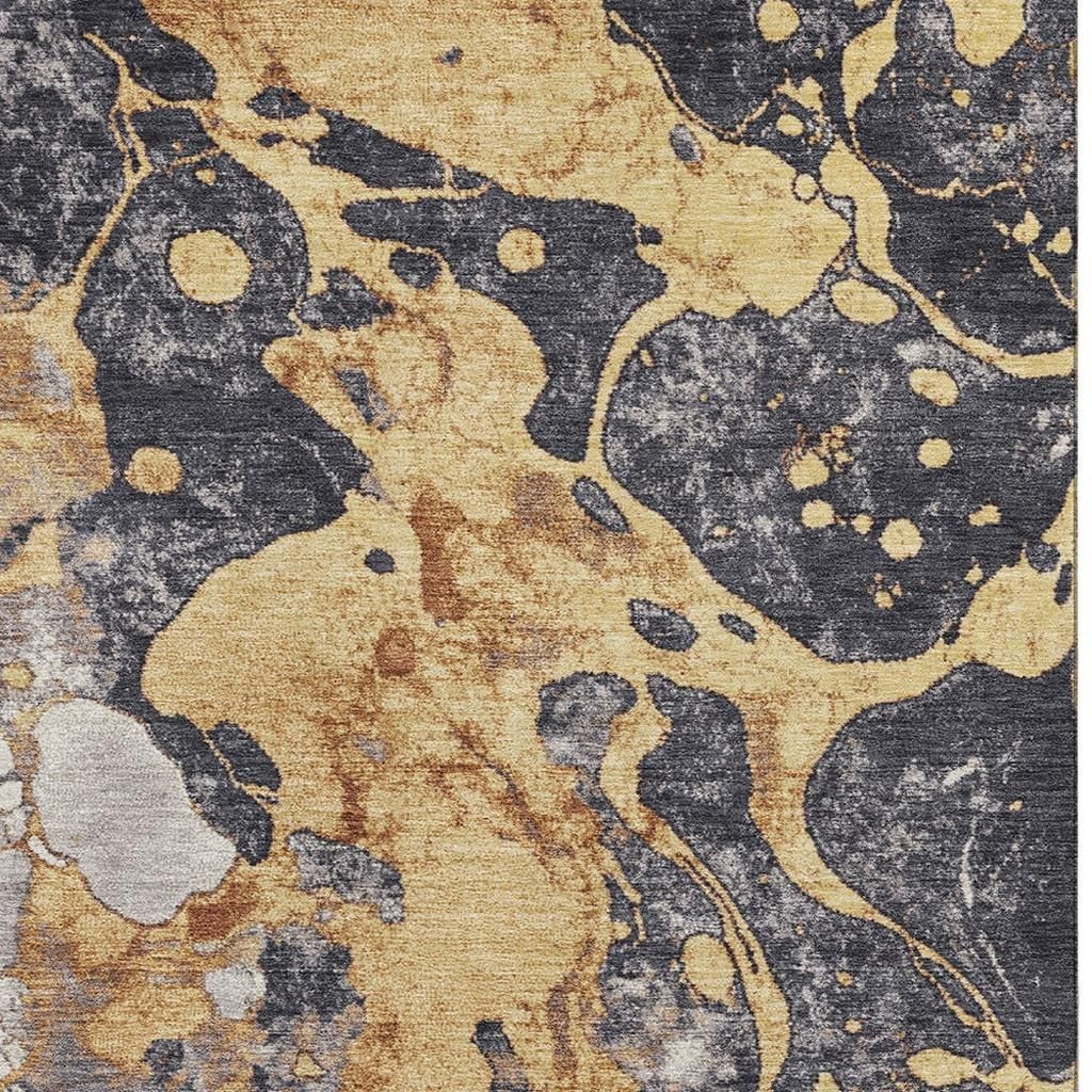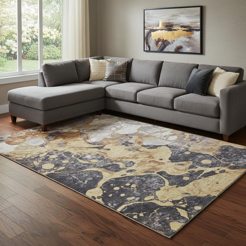 This 8-foot x 10-foot gold gray and ivory abstract washable area rug with uv protection, is a great way to add warmth to a room. Ideal for spaces with kids and pets, this rug is stain resistant to help repel dirt and spilled liquids. Built to last, this rug crafted from polyester fibers is known for its durability and long lasting appeal. Rugs are a great way to showcase your style, hide imperfections, warm your home and reduce noise. This larger sized, transitional styled rug is ready to create a focal point or statement piece in your room. 96.00-inch h x 120.00-inch w x 0.39-inch d.