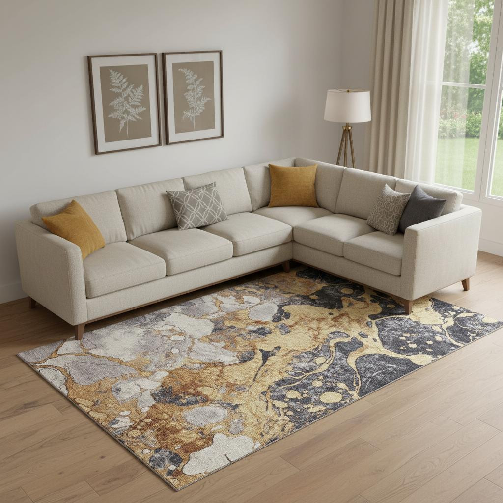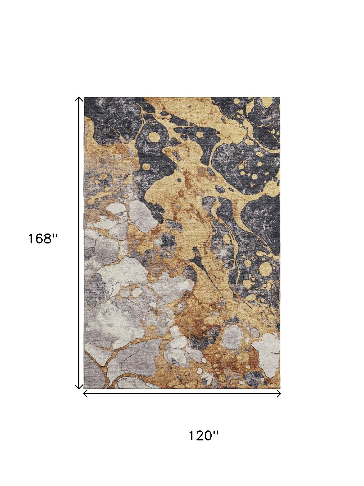 Set an inviting tone in your space with this 10-foot x 14-foot gold gray and ivory abstract washable area rug with uv protection. Ideal for spaces with kids and pets, this rug is stain resistant to help repel dirt and spilled liquids. Built to last, this rug crafted from polyester fibers is known for its durability and long lasting appeal. Rugs are a great way to showcase your style, hide imperfections, warm your home and reduce noise. This larger sized, transitional styled rug is ready to create a focal point or statement piece in your room. 120.00-inch h x 168.00-inch w x 0.39-inch d.