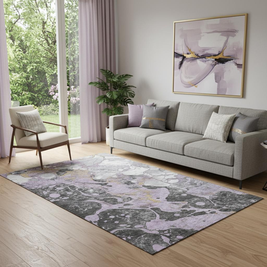 Set an inviting tone in your space with this 5-foot x 8-foot lavender beige and gray abstract washable area rug with uv protection. Ideal for spaces with kids and pets, this rug is stain resistant to help repel dirt and spilled liquids. Built to last, this rug crafted from polyester fibers is known for its durability and long lasting appeal. Rugs are a great way to showcase your style, hide imperfections, warm your home and reduce noise. This larger sized, transitional styled rug is ready to create a focal point or statement piece in your room. 60.00-inch h x 90.00-inch w x 0.39-inch d.
