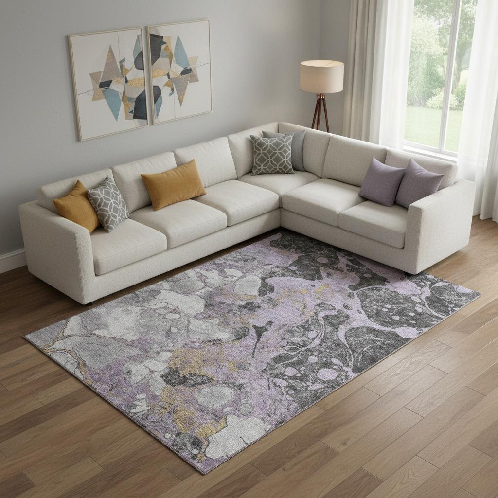 Add some artistry to your room with this 10-foot x 14-foot lavender beige and gray abstract washable area rug with uv protection. Ideal for spaces with kids and pets, this rug is stain resistant to help repel dirt and spilled liquids. Built to last, this rug crafted from polyester fibers is known for its durability and long lasting appeal. Rugs are a great way to showcase your style, hide imperfections, warm your home and reduce noise. This larger sized, transitional styled rug is ready to create a focal point or statement piece in your room. 120.00-inch h x 168.00-inch w x 0.39-inch d.