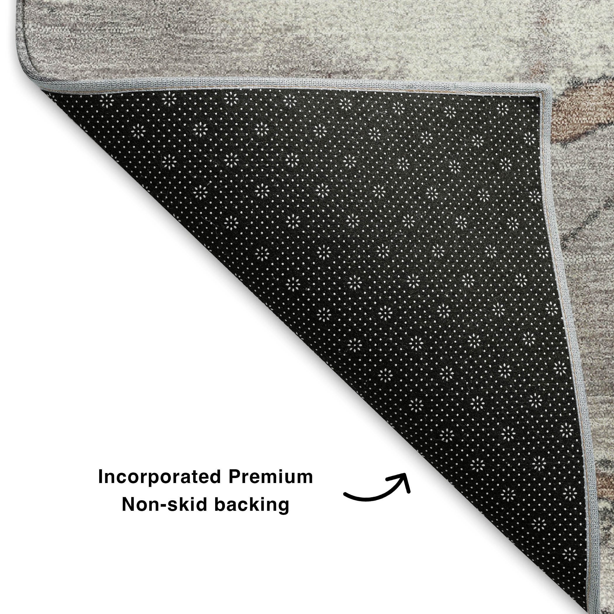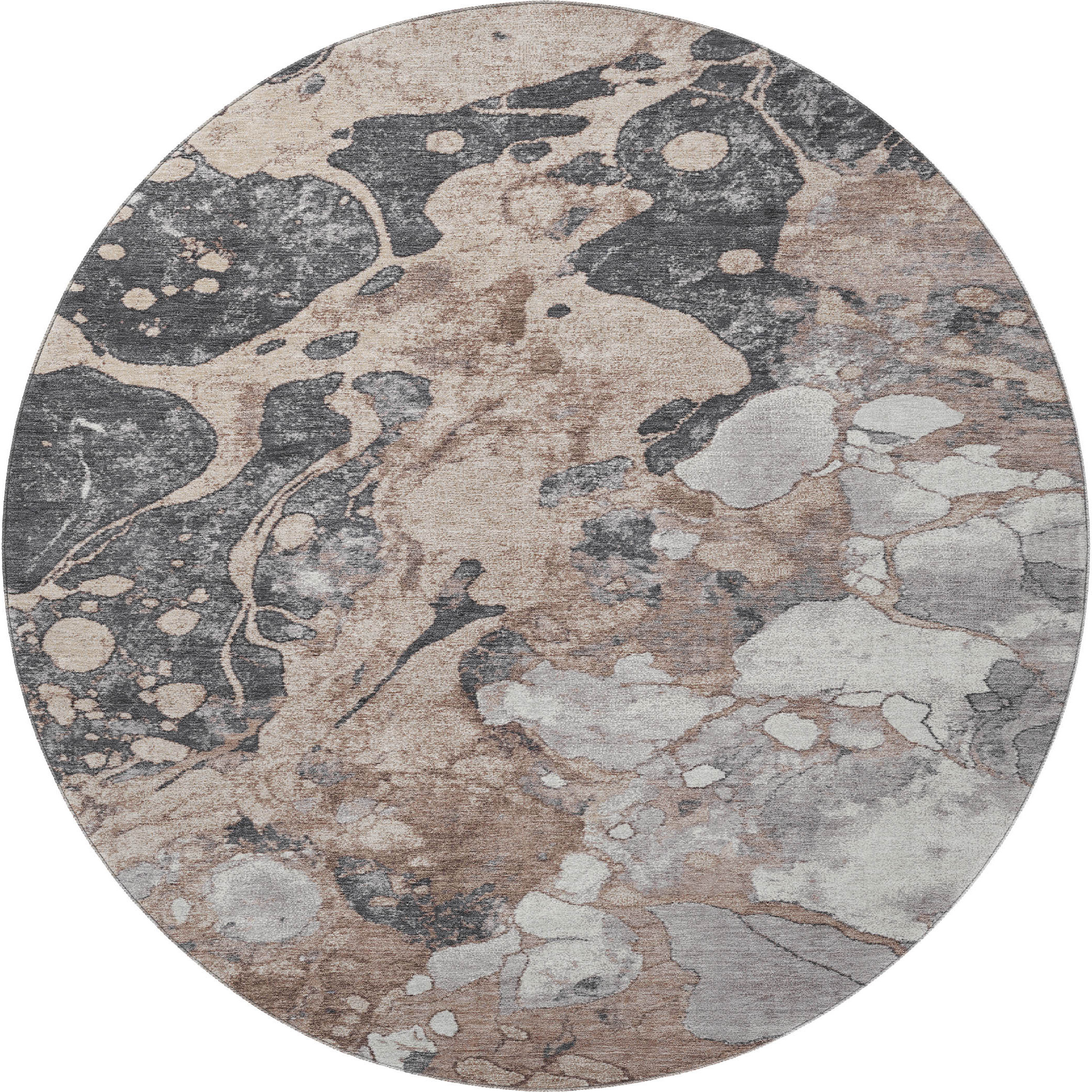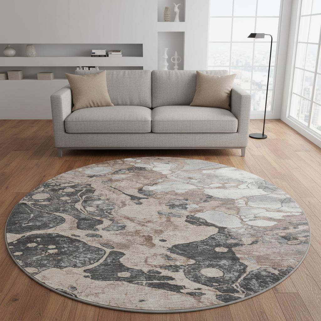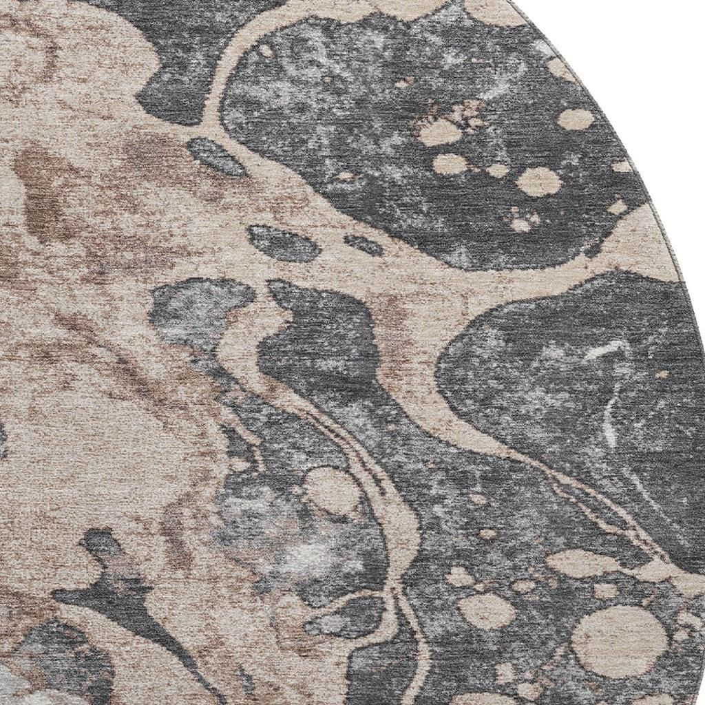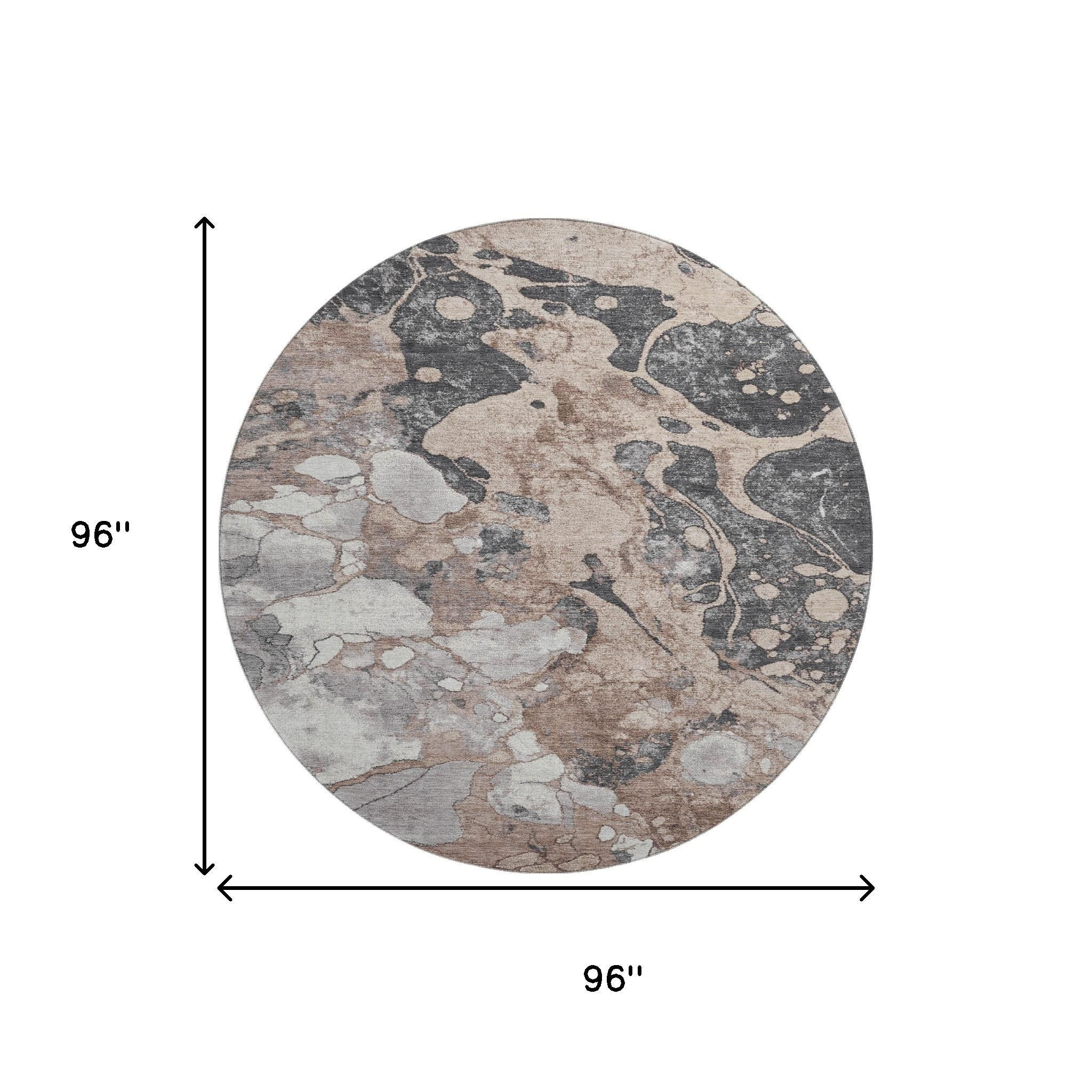 Add some artistry to your room with this 8-foot coffee gray and ivory abstract washable round rug with uv protection. Ideal for spaces with kids and pets, this rug is stain resistant to help repel dirt and spilled liquids. Built to last, this rug crafted from polyester fibers is known for its durability and long lasting appeal. Rugs are a great way to showcase your style, hide imperfections, warm your home and reduce noise. This larger sized, transitional styled rug is ready to create a focal point or statement piece in your room. 96.00-inch h x 96.00-inch w x 0.39-inch d.