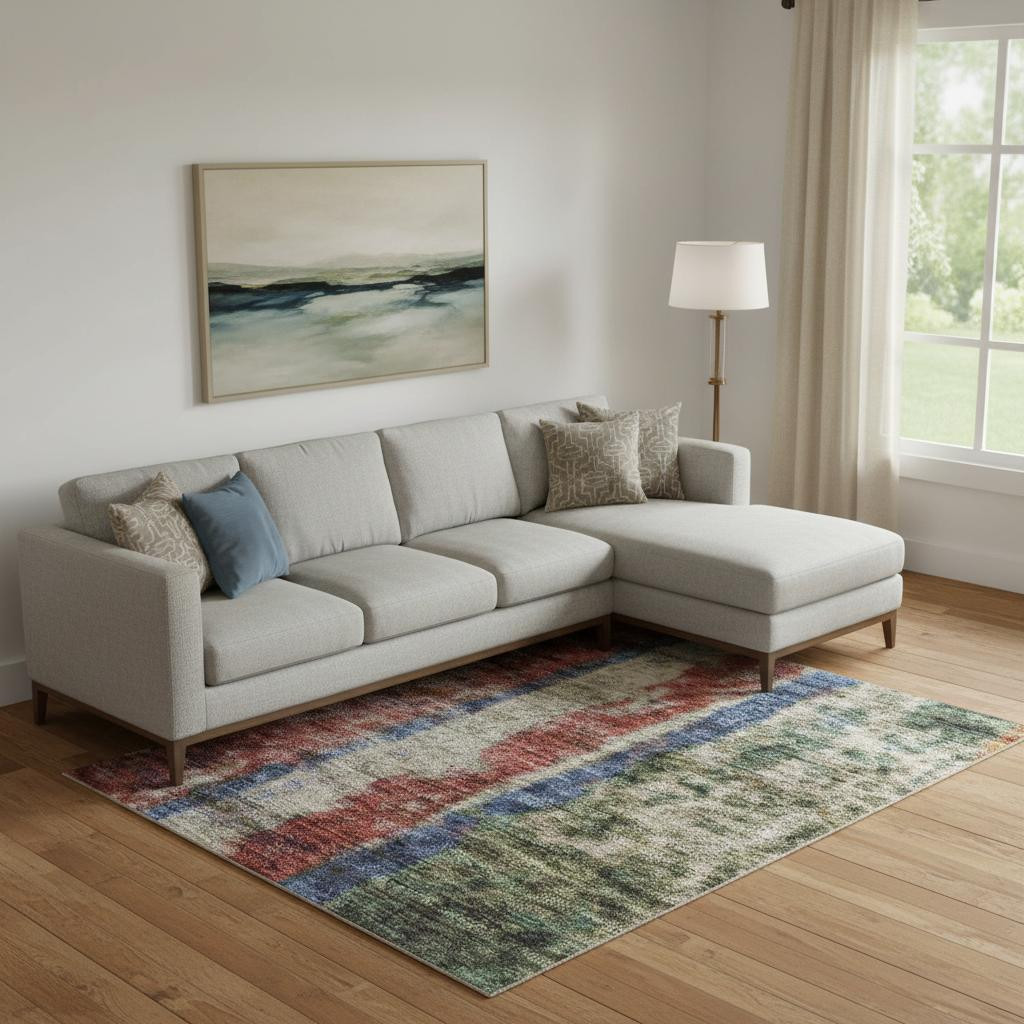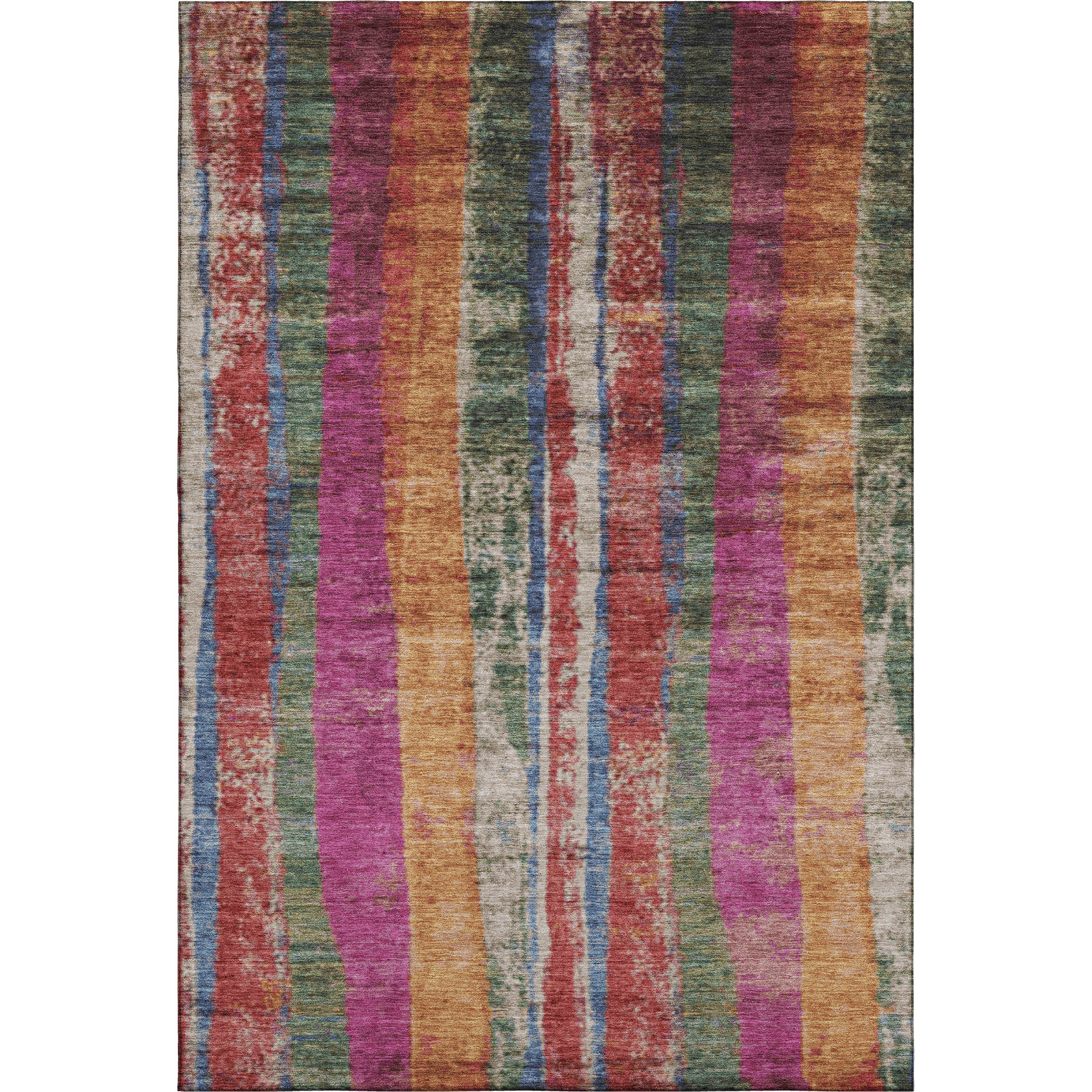 Add some artistry to your room with this 9-foot x 12-foot beige orange and blue striped washable area rug with uv protection. Ideal for spaces with kids and pets, this rug is stain resistant to help repel dirt and spilled liquids. Built to last, this rug crafted from polyester fibers is known for its durability and long lasting appeal. Rugs are a great way to showcase your style, hide imperfections, warm your home and reduce noise. This larger sized, transitional styled rug is ready to create a focal point or statement piece in your room. 108.00-inch h x 144.00-inch w x 0.39-inch d.