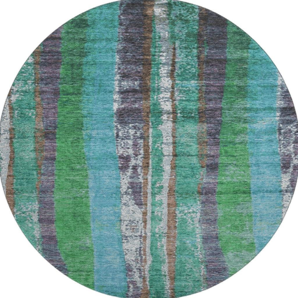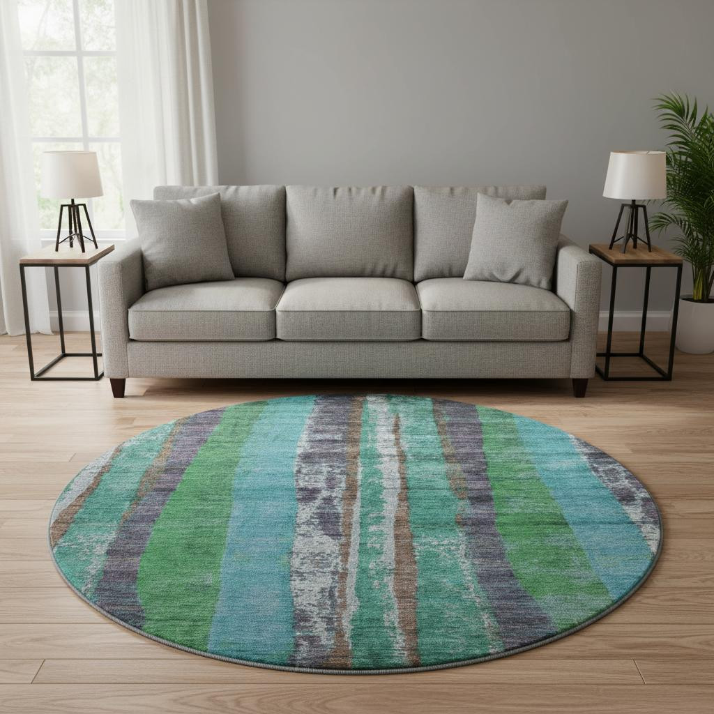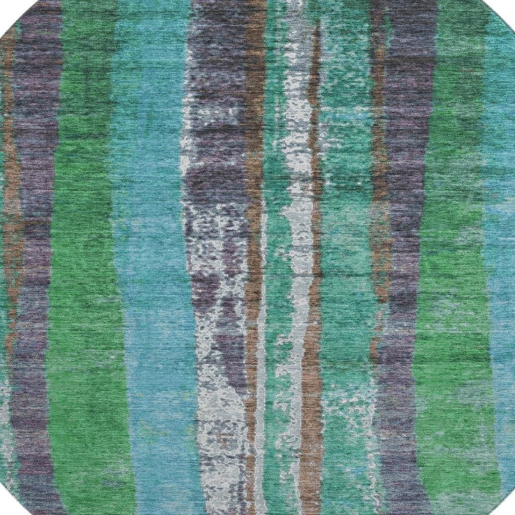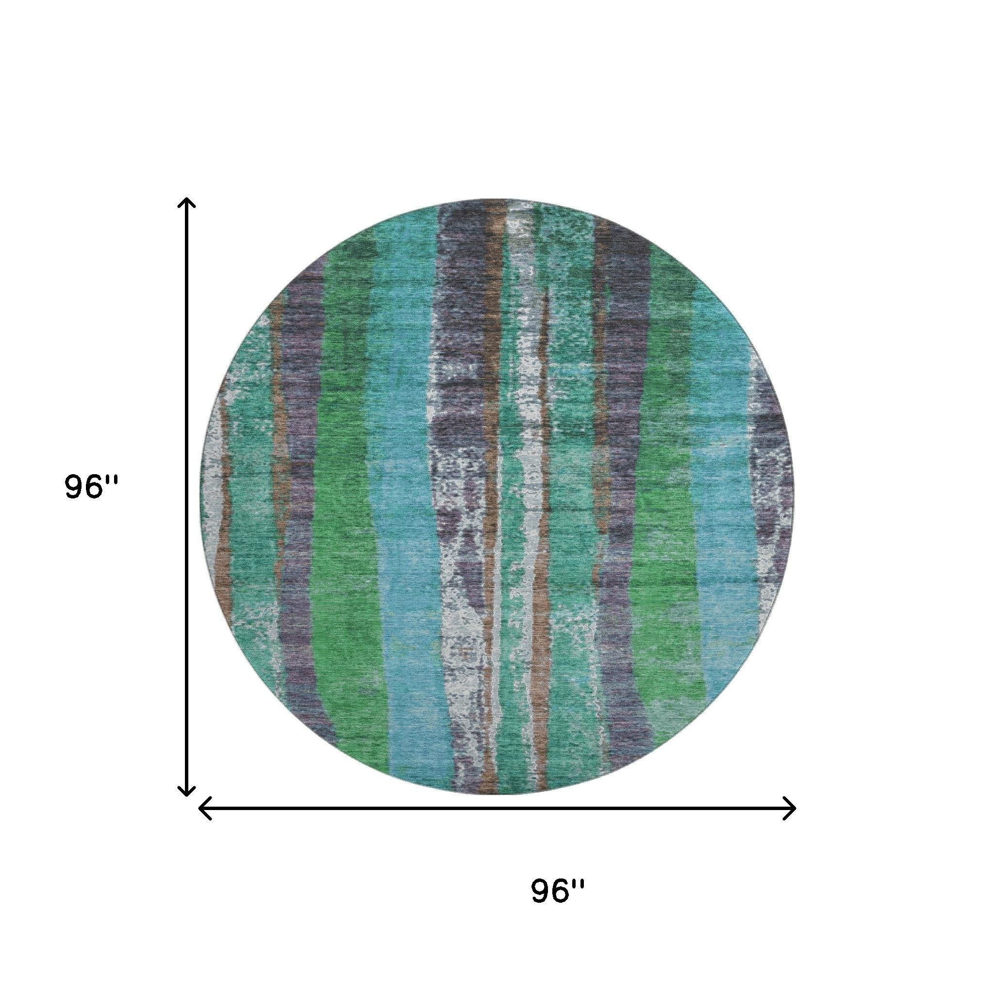 This 8-foot teal green and ivory striped washable round rug with uv protection, is a great way to add warmth to a room. Ideal for spaces with kids and pets, this rug is stain resistant to help repel dirt and spilled liquids. Built to last, this rug crafted from polyester fibers is known for its durability and long lasting appeal. Rugs are a great way to showcase your style, hide imperfections, warm your home and reduce noise. This larger sized, transitional styled rug is ready to create a focal point or statement piece in your room. 96.00-inch h x 96.00-inch w x 0.39-inch d.