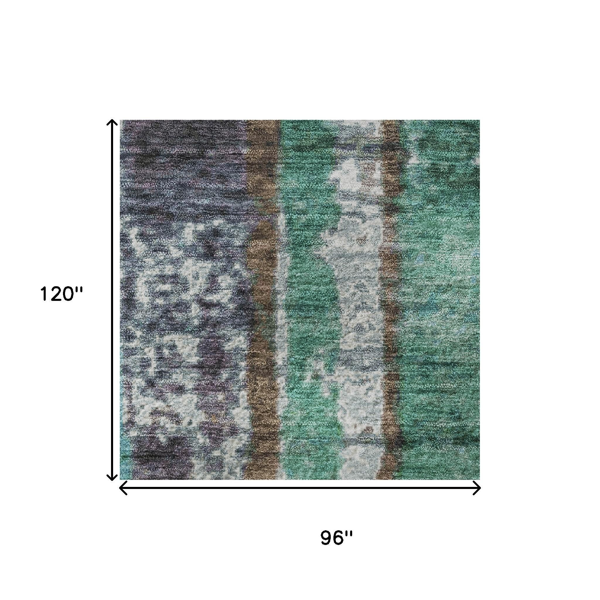 Add some artistry to your room with this 8-foot x 10-foot teal green and ivory striped washable area rug with uv protection. Ideal for spaces with kids and pets, this rug is stain resistant to help repel dirt and spilled liquids. Built to last, this rug crafted from polyester fibers is known for its durability and long lasting appeal. Rugs are a great way to showcase your style, hide imperfections, warm your home and reduce noise. This larger sized, transitional styled rug is ready to create a focal point or statement piece in your room. 96.00-inch h x 120.00-inch w x 0.39-inch d.