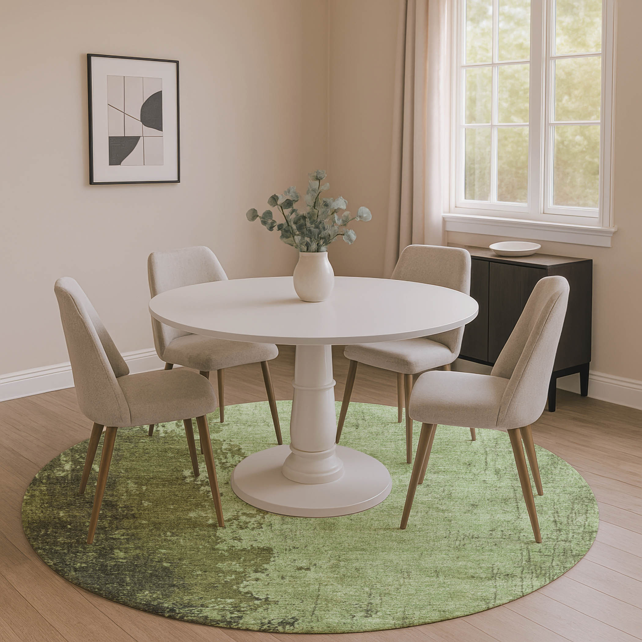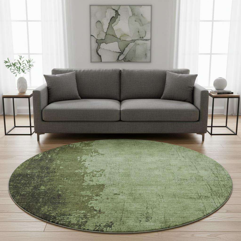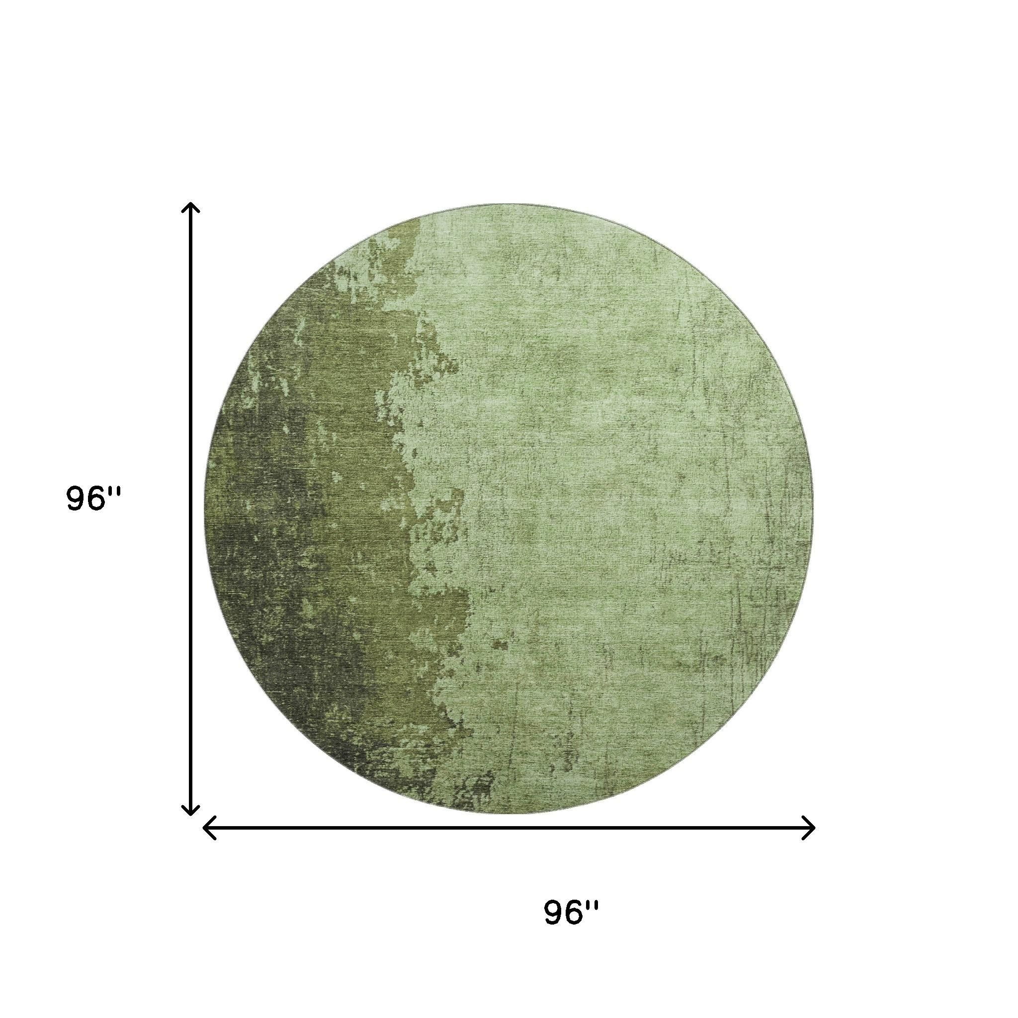 Add great coloration and comfortable texture to your space with this 8-foot artichoke green and beige abstract washable round rug with uv protection. Ideal for spaces with kids and pets, this rug is stain resistant to help repel dirt and spilled liquids. Built to last, this rug crafted from polyester fibers is known for its durability and long lasting appeal. Rugs are a great way to showcase your style, hide imperfections, warm your home and reduce noise. This larger sized, transitional styled rug is ready to create a focal point or statement piece in your room. 96.00-inch h x 96.00-inch w x 0.39-inch d.