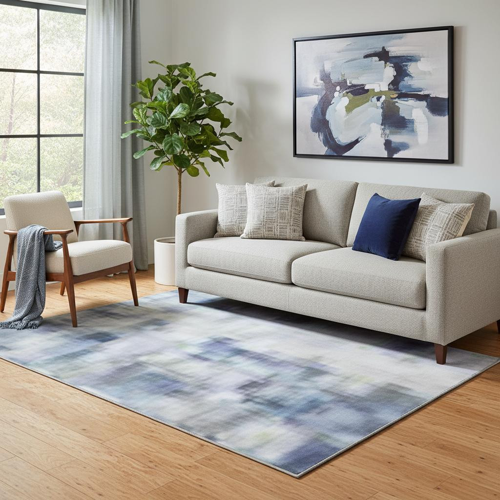 Add some artistry to your room with this 5-foot x 8-foot blue and gray abstract washable area rug with uv protection. Ideal for spaces with kids and pets, this rug is stain resistant to help repel dirt and spilled liquids. Built to last, this rug crafted from polyester fibers is known for its durability and long lasting appeal. Rugs are a great way to showcase your style, hide imperfections, warm your home and reduce noise. This larger sized, transitional styled rug is ready to create a focal point or statement piece in your room. 60.00-inch h x 90.00-inch w x 0.39-inch d.