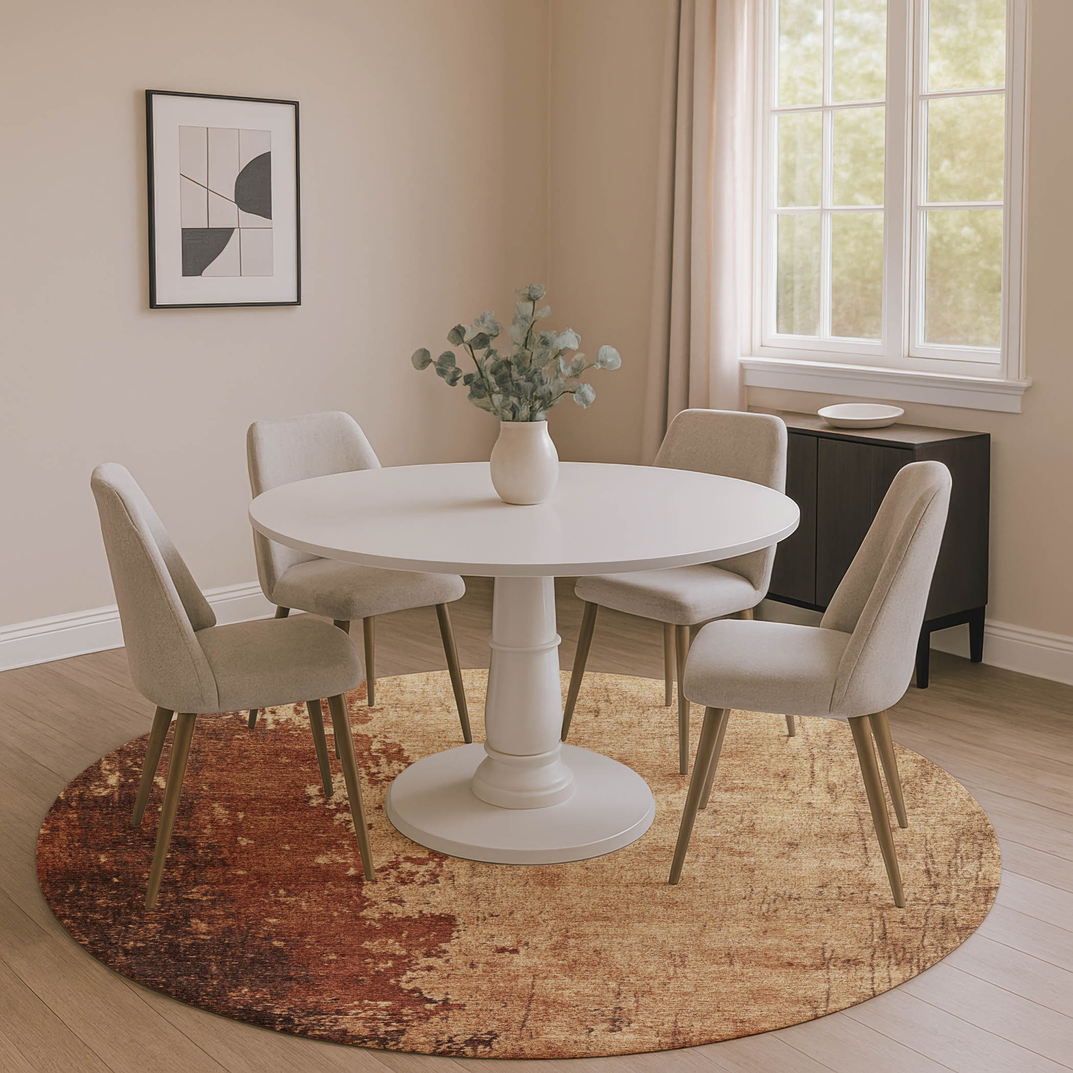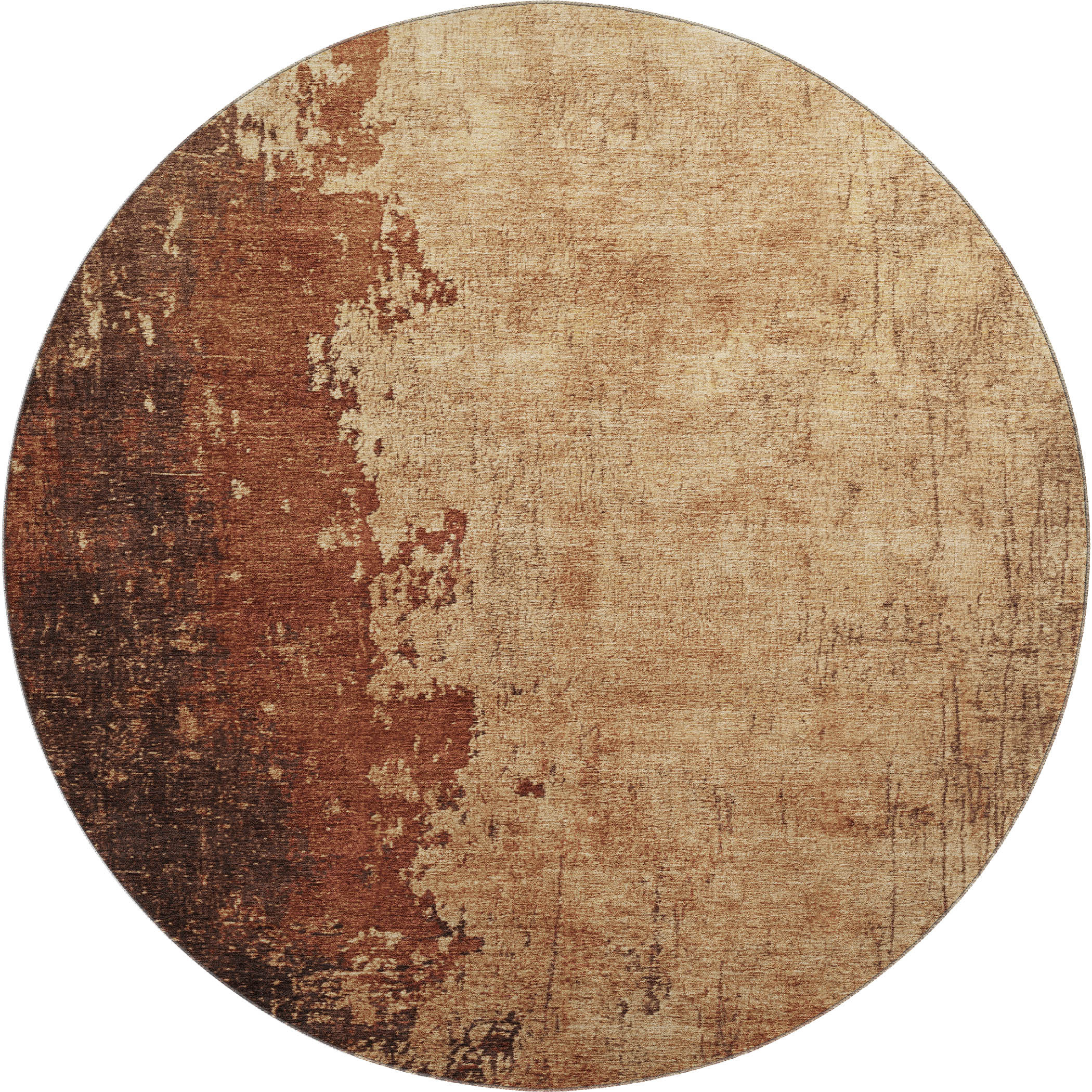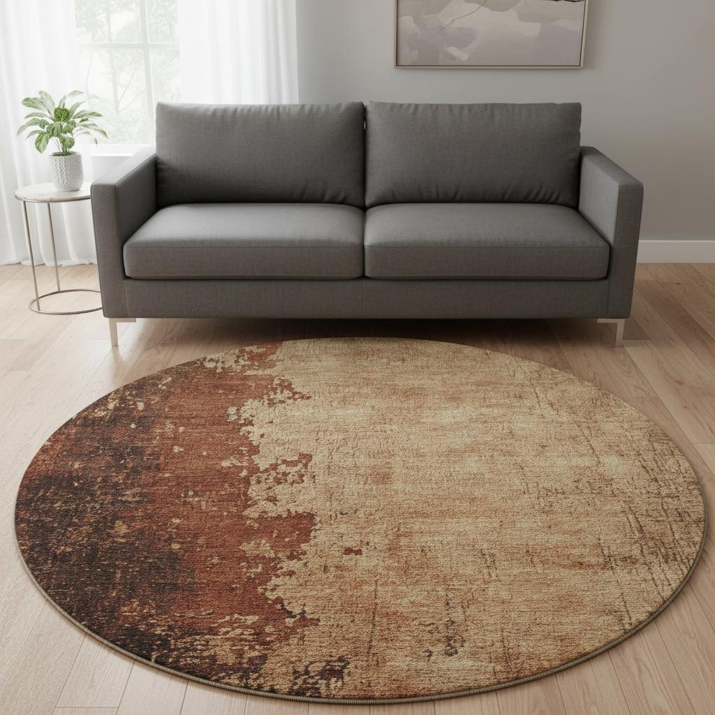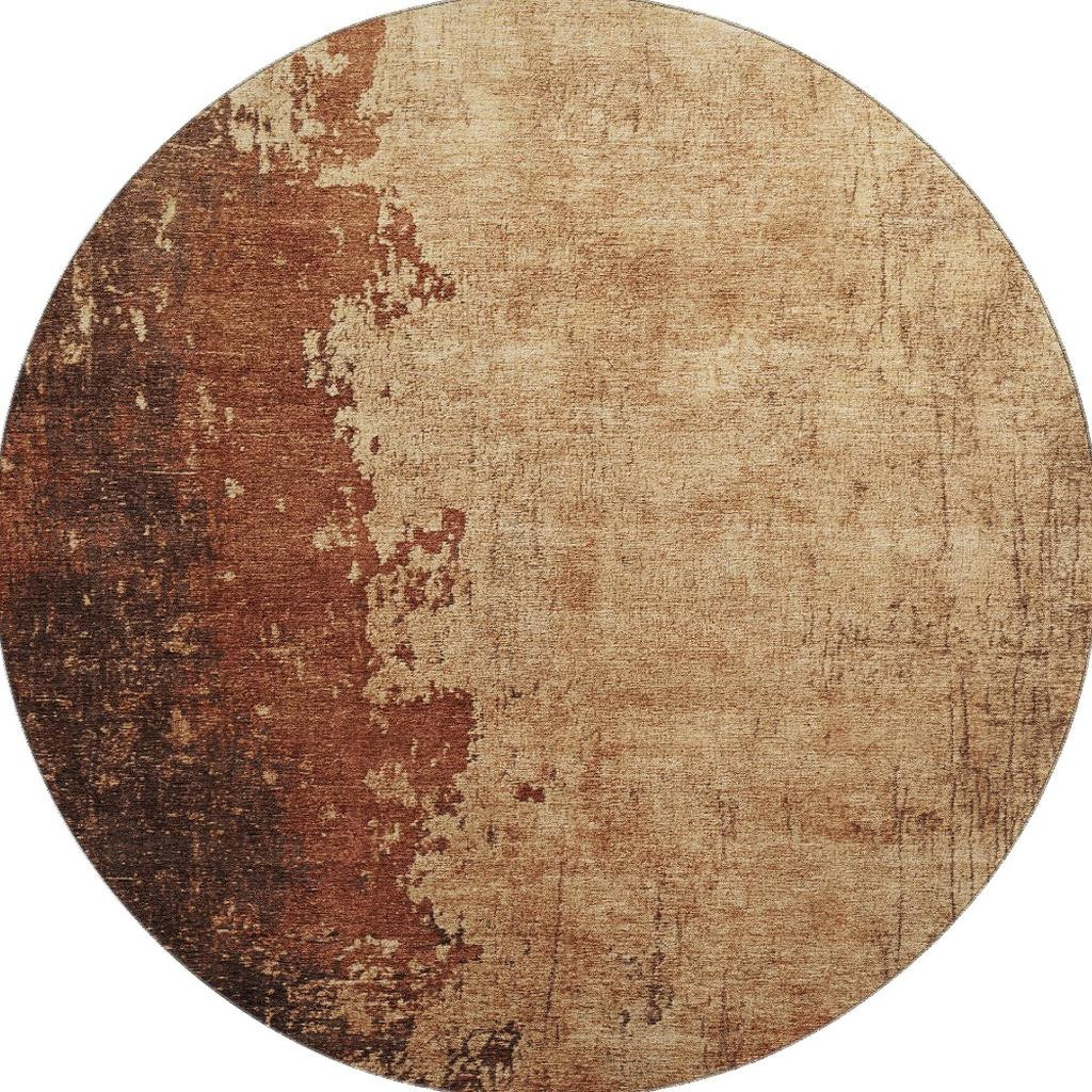Add some artistry to your room with this 8-foot tan and beige abstract washable round rug with uv protection. Ideal for spaces with kids and pets, this rug is stain resistant to help repel dirt and spilled liquids. Built to last, this rug crafted from polyester fibers is known for its durability and long lasting appeal. Rugs are a great way to showcase your style, hide imperfections, warm your home and reduce noise. This larger sized, transitional styled rug is ready to create a focal point or statement piece in your room. 96.00-inch h x 96.00-inch w x 0.39-inch d.