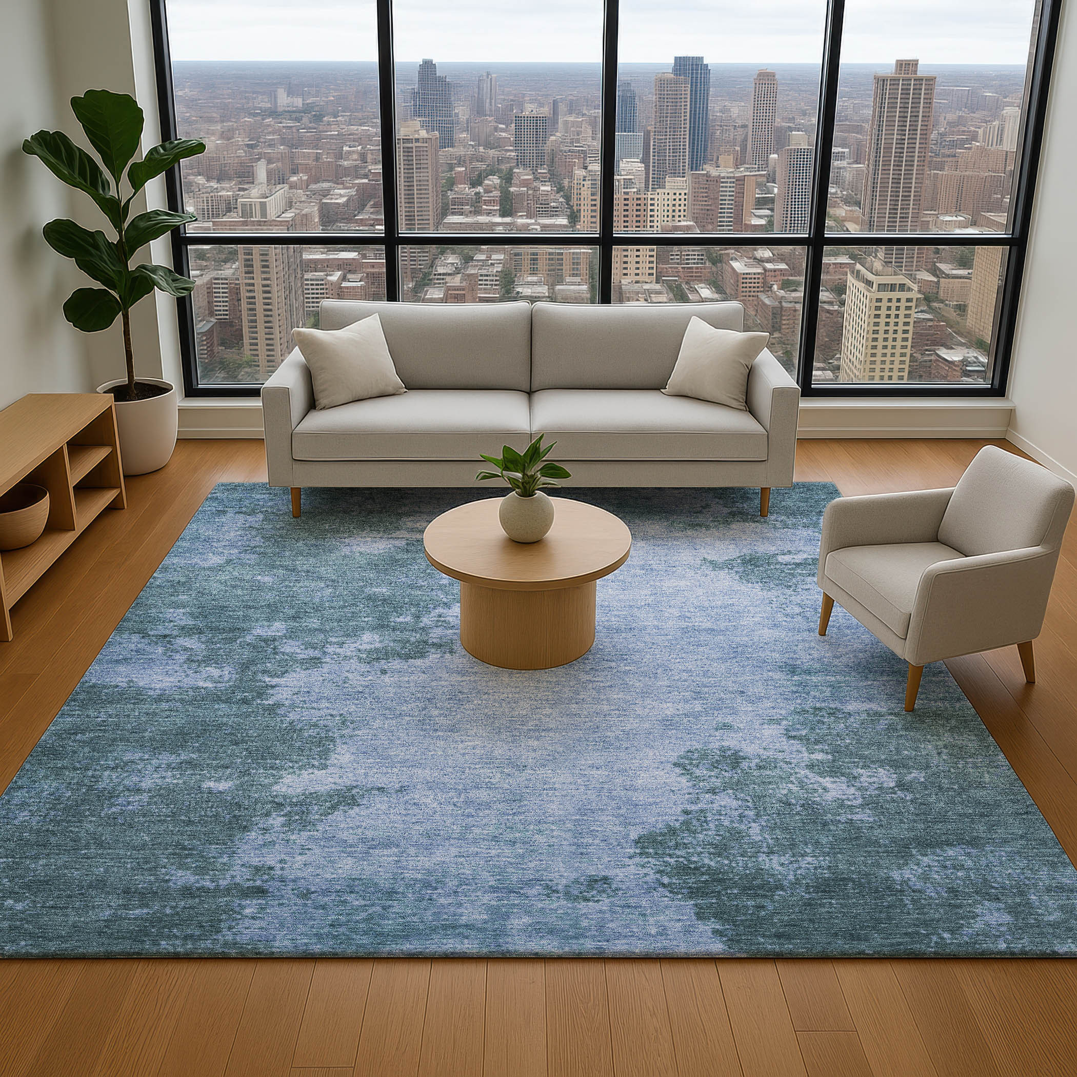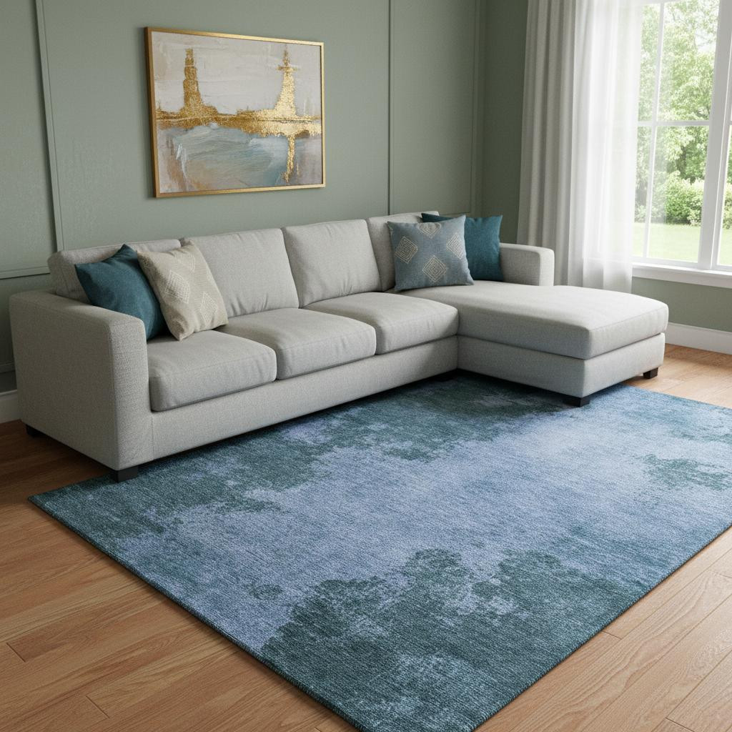 Add some artistry to your room with this 8-foot x 10-foot denim blue and sky blue abstract washable area rug with uv protection. Ideal for spaces with kids and pets, this rug is stain resistant to help repel dirt and spilled liquids. Built to last, this rug crafted from polyester fibers is known for its durability and long lasting appeal. Rugs are a great way to showcase your style, hide imperfections, warm your home and reduce noise. This larger sized, transitional styled rug is ready to create a focal point or statement piece in your room. 96.00-inch h x 120.00-inch w x 0.39-inch d.