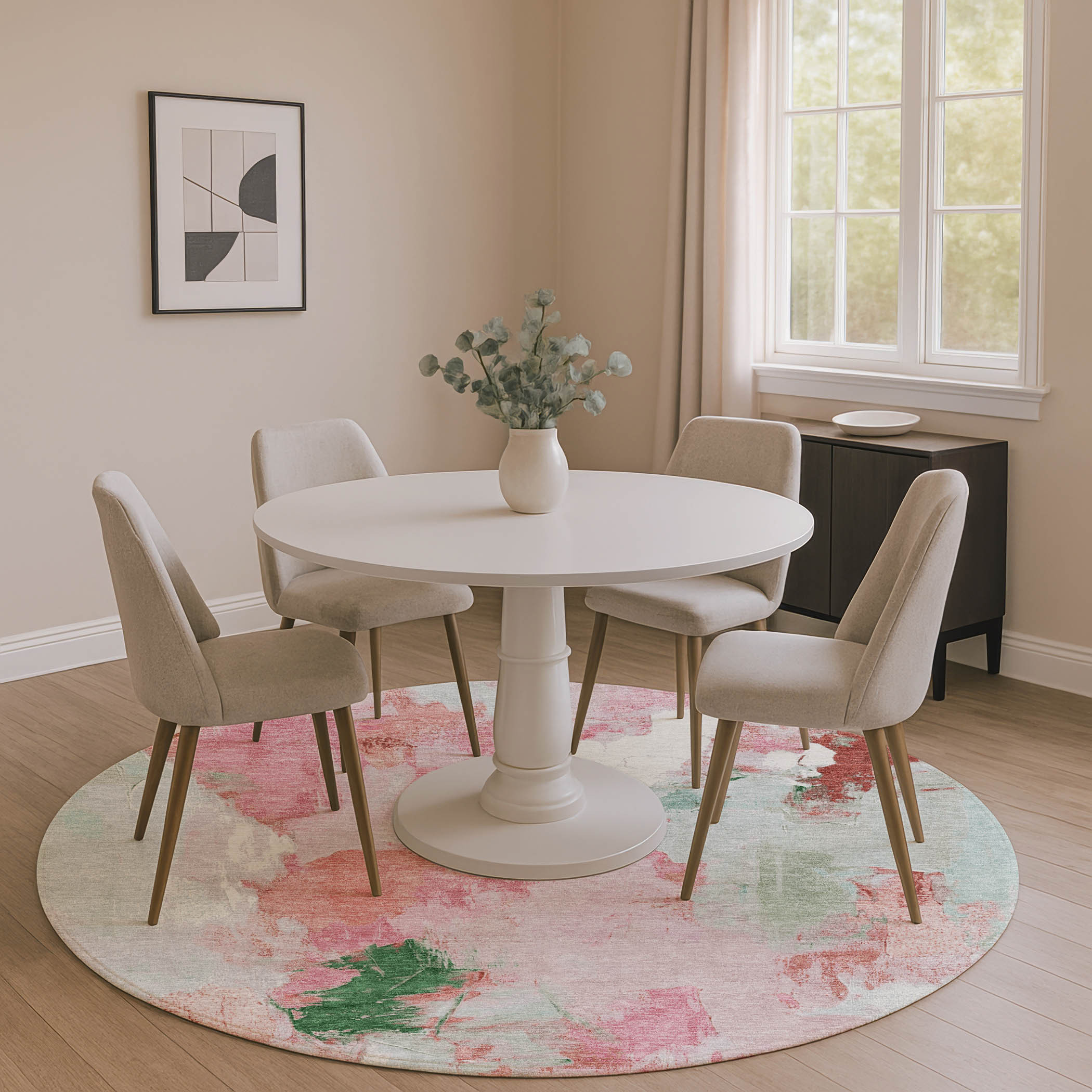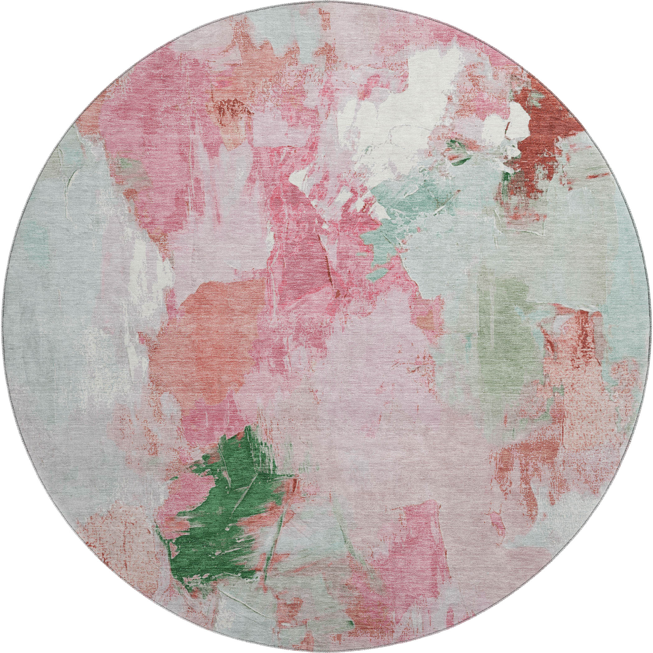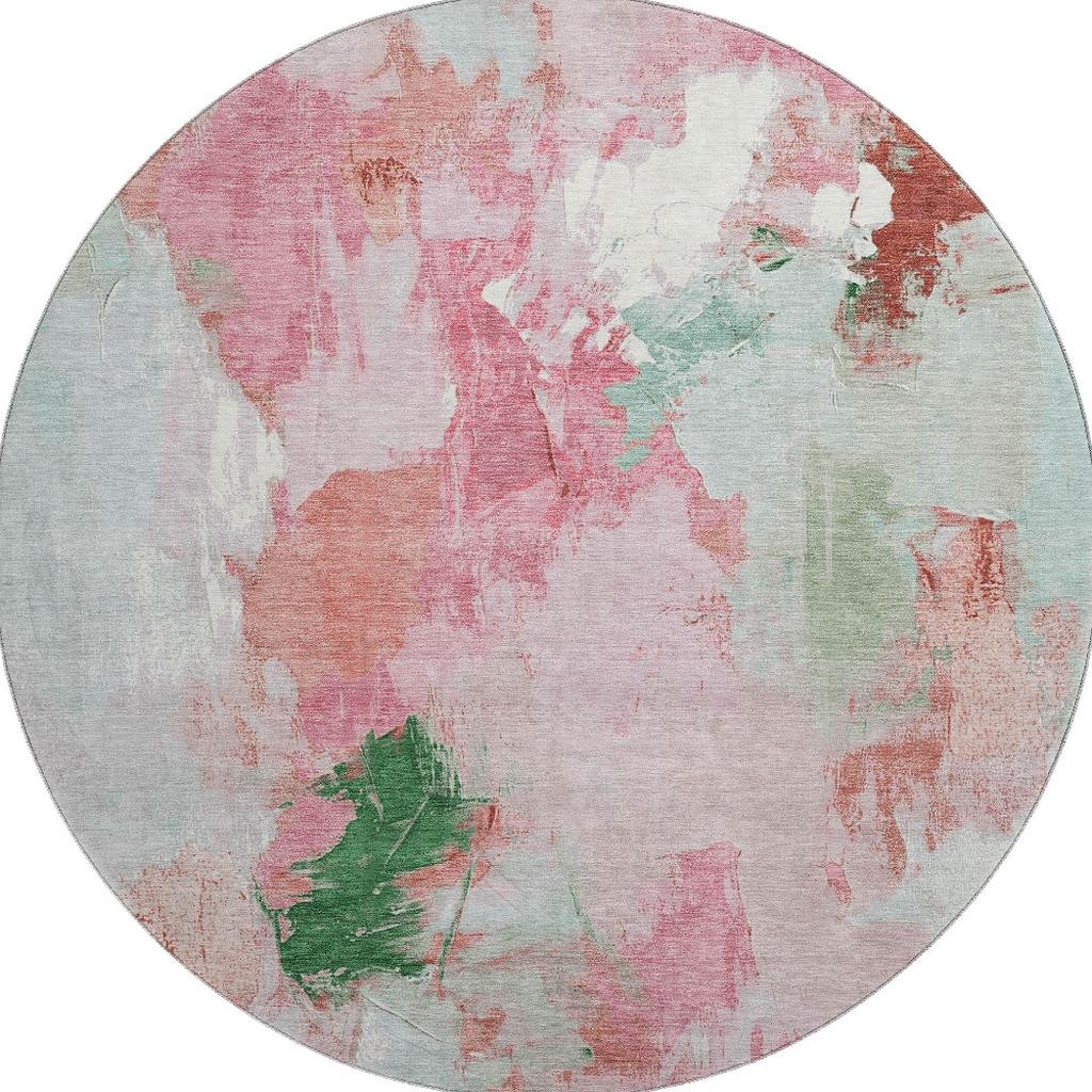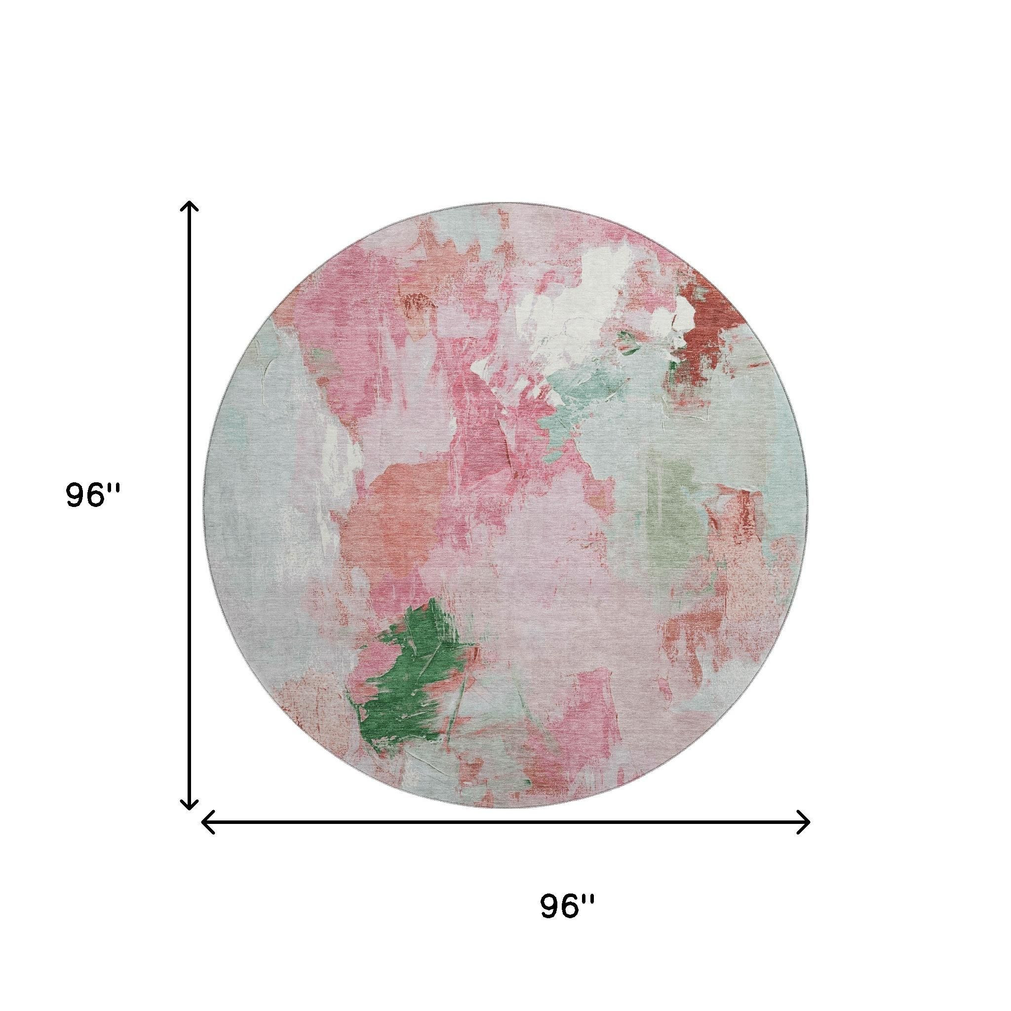 This 8-foot blush green and ivory abstract washable round rug with uv protection, is a great way to add warmth to a room. Ideal for spaces with kids and pets, this rug is stain resistant to help repel dirt and spilled liquids. Built to last, this rug crafted from polyester fibers is known for its durability and long lasting appeal. Rugs are a great way to showcase your style, hide imperfections, warm your home and reduce noise. This larger sized, transitional styled rug is ready to create a focal point or statement piece in your room. 96.00-inch h x 96.00-inch w x 0.39-inch d.