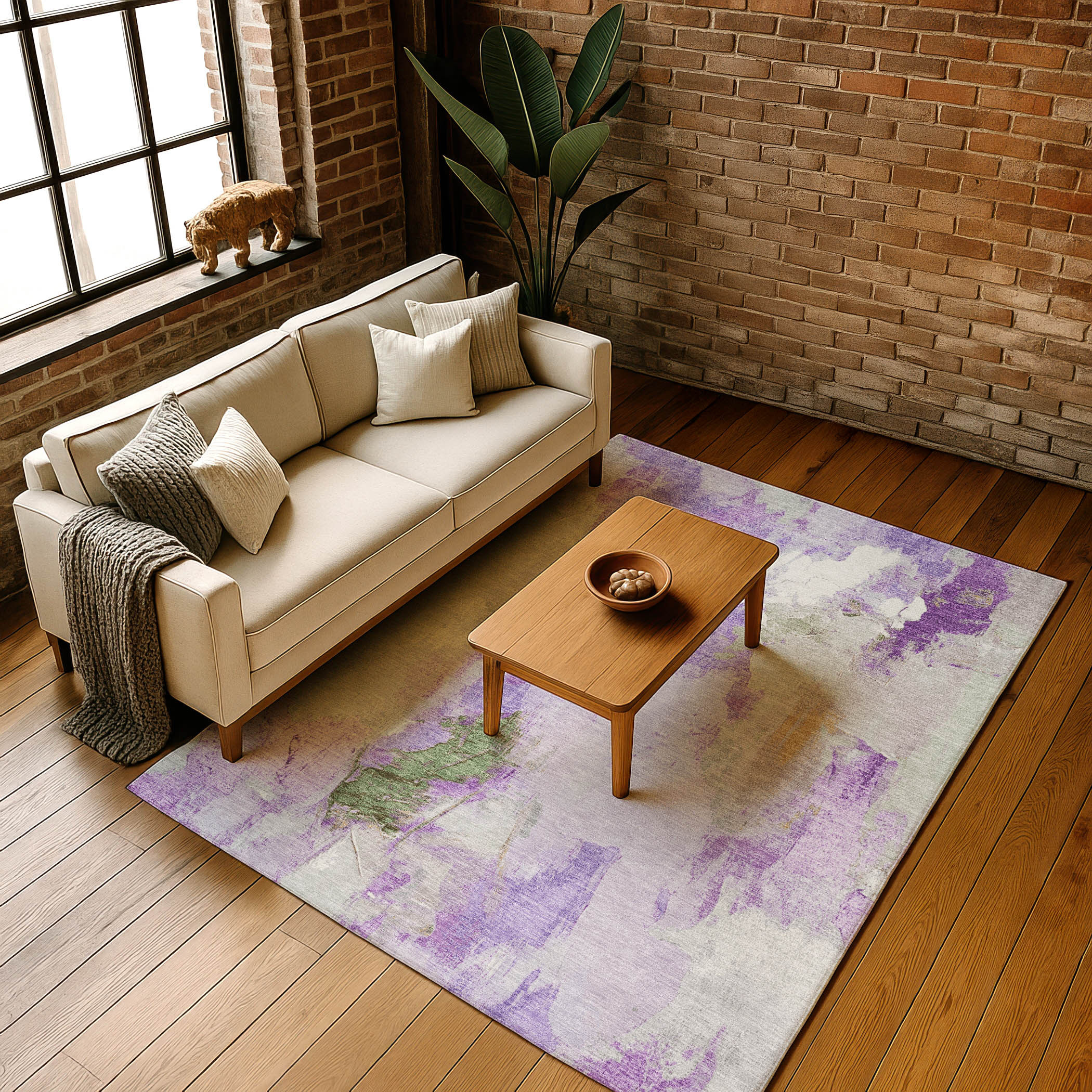 Add great coloration and comfortable texture to your space with this 3-foot x 5-foot purple green and ivory abstract washable area rug with uv protection. Ideal for spaces with kids and pets, this rug is stain resistant to help repel dirt and spilled liquids. Built to last, this rug crafted from polyester fibers is known for its durability and long lasting appeal. Rugs are a great way to showcase your style, hide imperfections, warm your home and reduce noise. This smaller sized, transitional styled rug is just what you need for your walkway, bedside, in front of door, cabinet, refrigerator, or chair. 36.00-inch h x 60.00-inch w x 0.39-inch d.