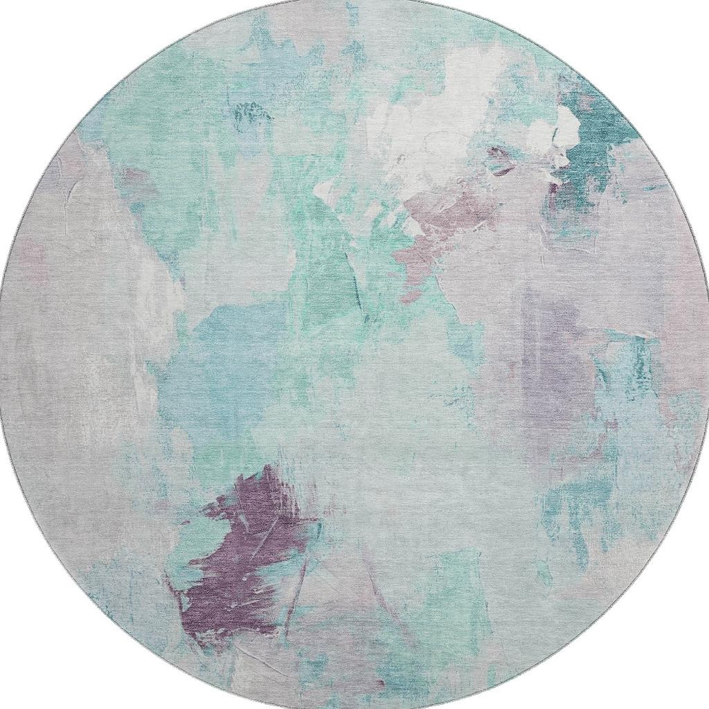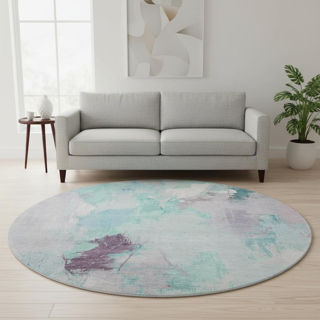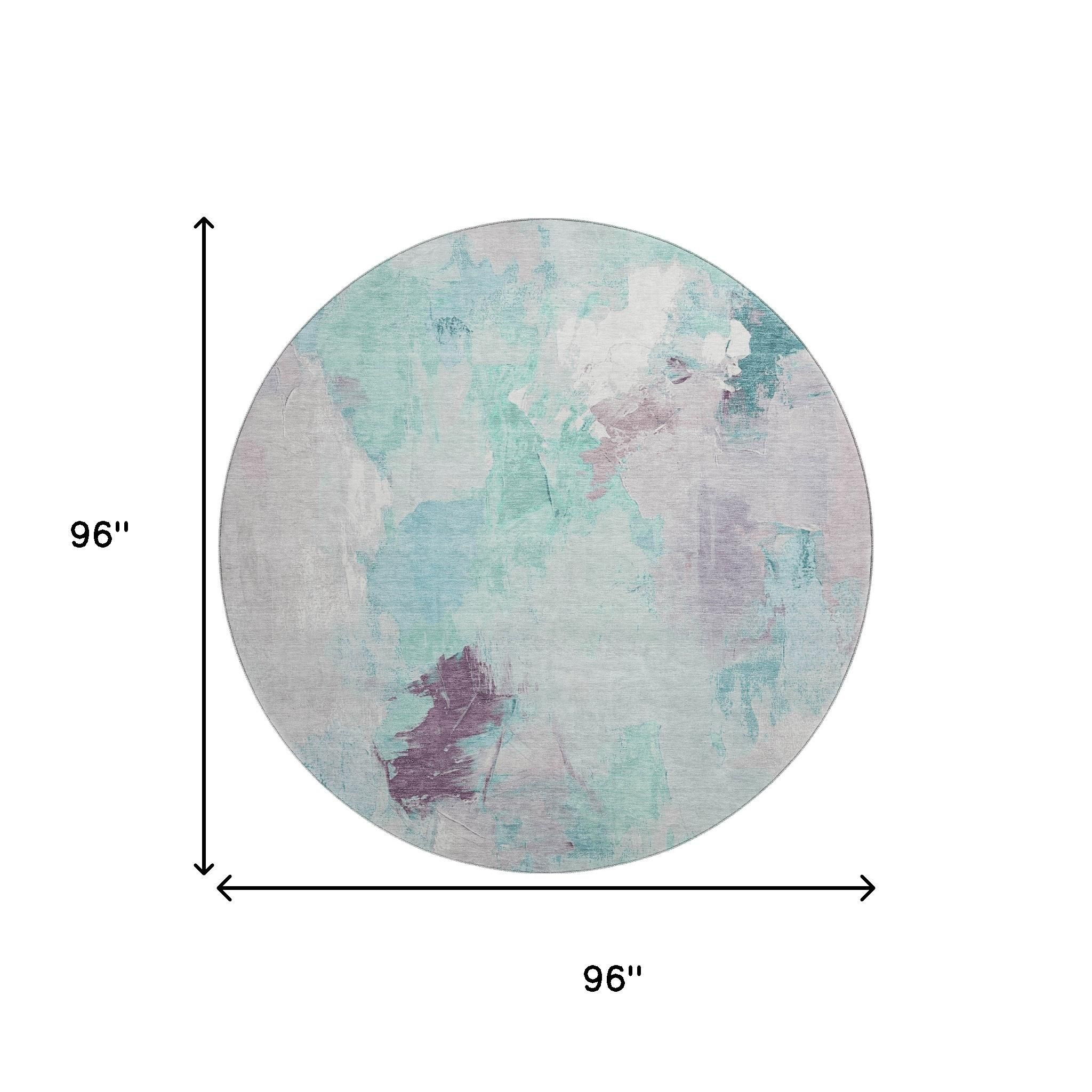 This 8-foot teal lavender and ivory abstract washable round rug with uv protection, is a great way to add warmth to a room. Ideal for spaces with kids and pets, this rug is stain resistant to help repel dirt and spilled liquids. Built to last, this rug crafted from polyester fibers is known for its durability and long lasting appeal. Rugs are a great way to showcase your style, hide imperfections, warm your home and reduce noise. This larger sized, transitional styled rug is ready to create a focal point or statement piece in your room. 96.00-inch h x 96.00-inch w x 0.39-inch d.
