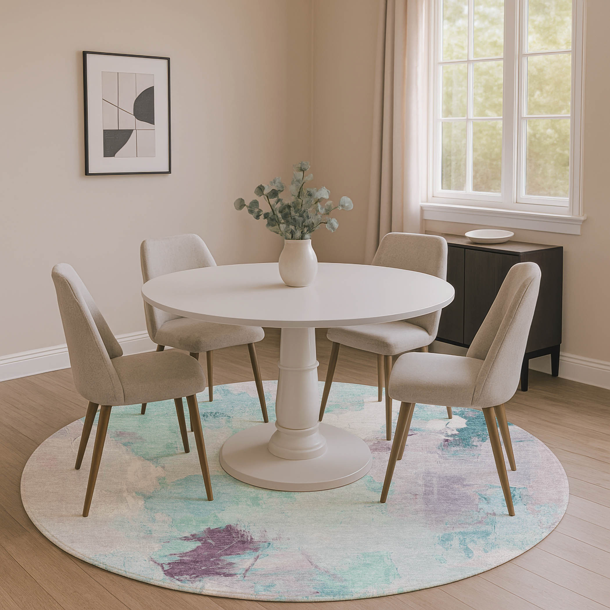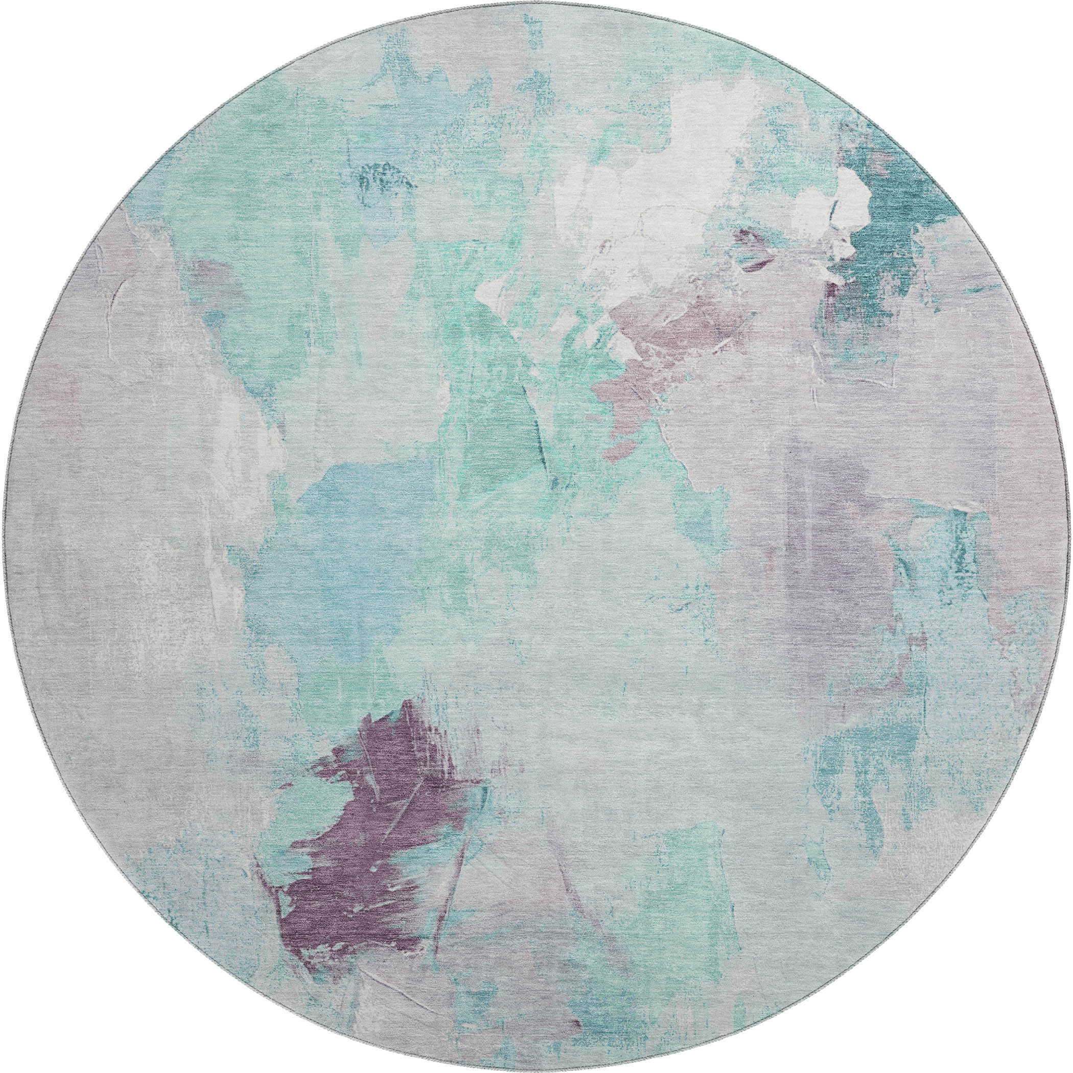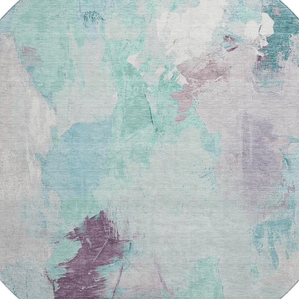 This 8-foot teal lavender and ivory abstract washable round rug with uv protection, is a great way to add warmth to a room. Ideal for spaces with kids and pets, this rug is stain resistant to help repel dirt and spilled liquids. Built to last, this rug crafted from polyester fibers is known for its durability and long lasting appeal. Rugs are a great way to showcase your style, hide imperfections, warm your home and reduce noise. This larger sized, transitional styled rug is ready to create a focal point or statement piece in your room. 96.00-inch h x 96.00-inch w x 0.39-inch d.