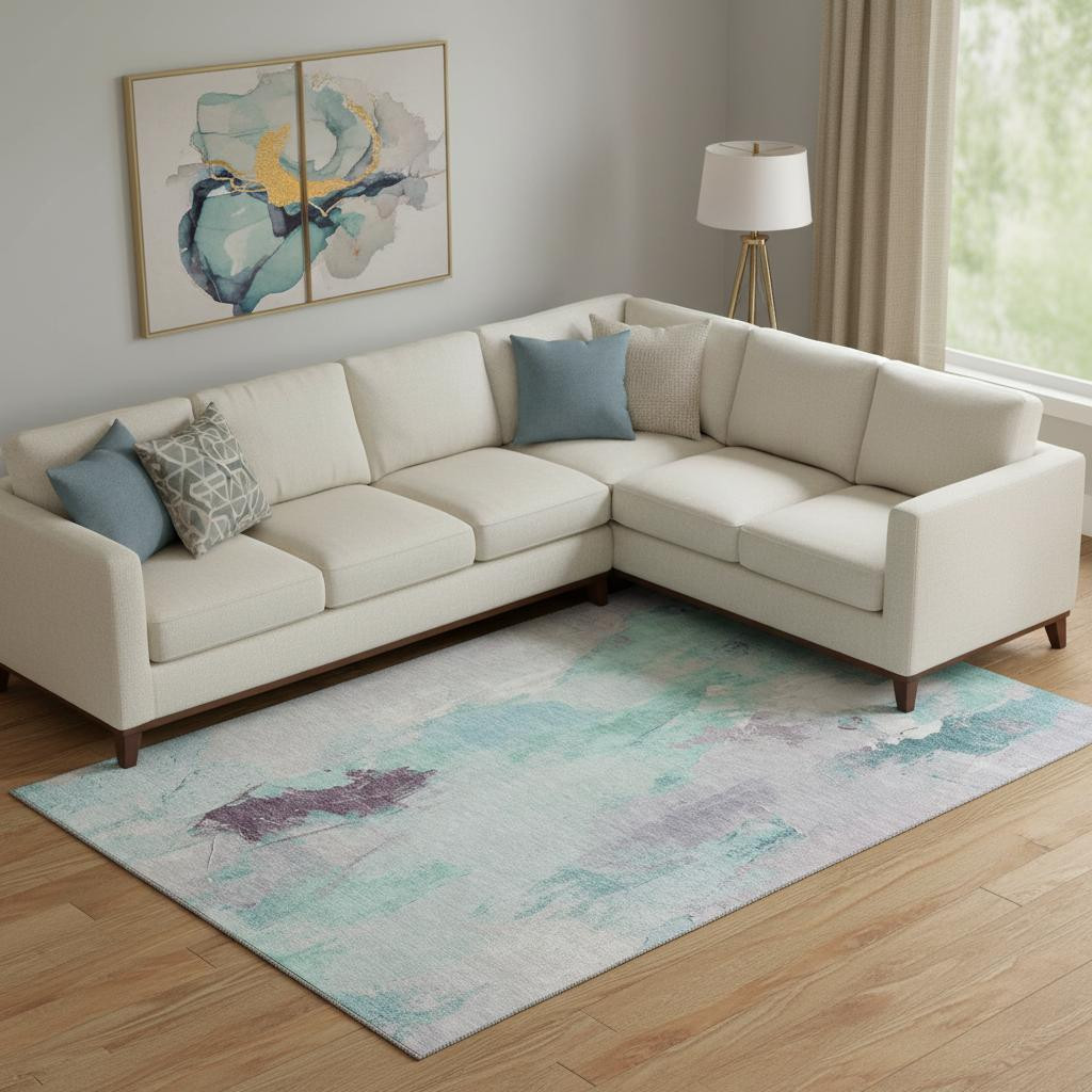 Set an inviting tone in your space with this 9-foot x 12-foot teal lavender and ivory abstract washable area rug with uv protection. Ideal for spaces with kids and pets, this rug is stain resistant to help repel dirt and spilled liquids. Built to last, this rug crafted from polyester fibers is known for its durability and long lasting appeal. Rugs are a great way to showcase your style, hide imperfections, warm your home and reduce noise. This larger sized, transitional styled rug is ready to create a focal point or statement piece in your room. 108.00-inch h x 144.00-inch w x 0.39-inch d.
