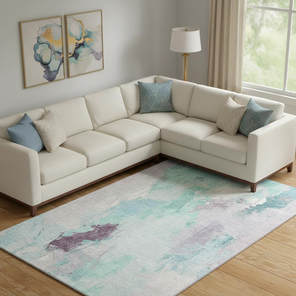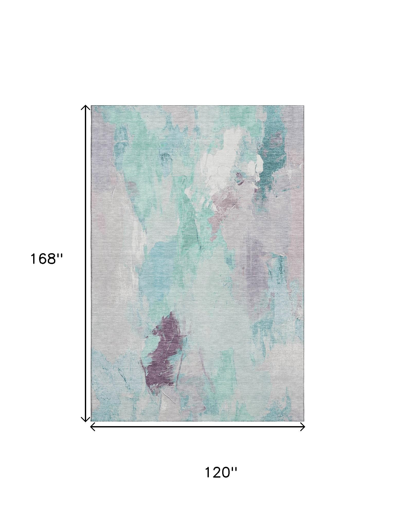 This 10-foot x 14-foot teal lavender and ivory abstract washable area rug with uv protection, is a great way to add warmth to a room. Ideal for spaces with kids and pets, this rug is stain resistant to help repel dirt and spilled liquids. Built to last, this rug crafted from polyester fibers is known for its durability and long lasting appeal. Rugs are a great way to showcase your style, hide imperfections, warm your home and reduce noise. This larger sized, transitional styled rug is ready to create a focal point or statement piece in your room. 120.00-inch h x 168.00-inch w x 0.39-inch d.