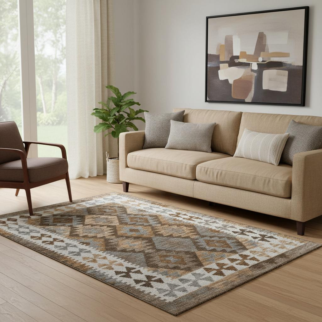 Set an inviting tone in your space with this 5-foot x 8-foot copper and ivory tribal washable area rug with uv protection. Ideal for spaces with kids and pets, this rug is stain resistant to help repel dirt and spilled liquids. Built to last, this rug crafted from polyester fibers is known for its durability and long lasting appeal. Rugs are a great way to showcase your style, hide imperfections, warm your home and reduce noise. This larger sized, transitional styled rug is ready to create a focal point or statement piece in your room. 60.00-inch h x 90.00-inch w x 0.39-inch d.